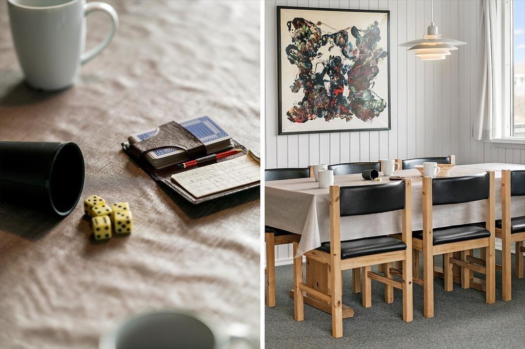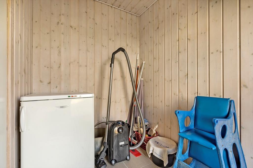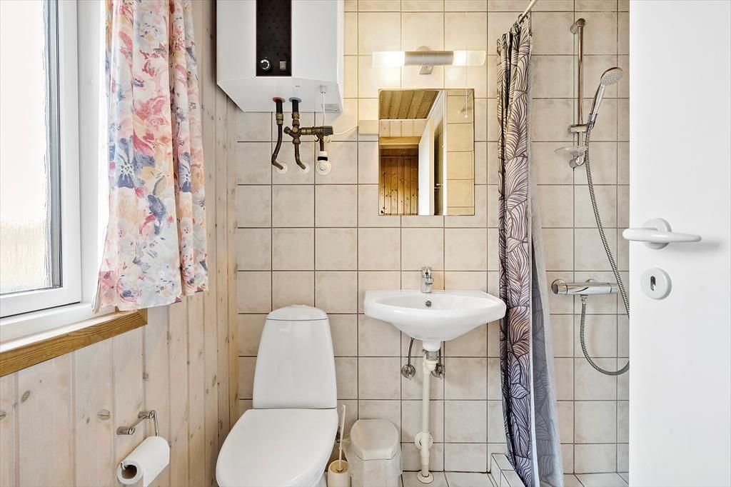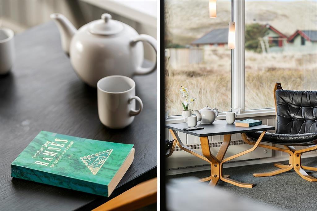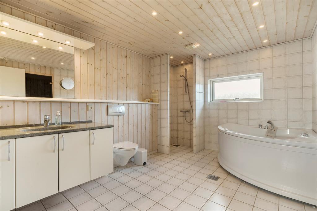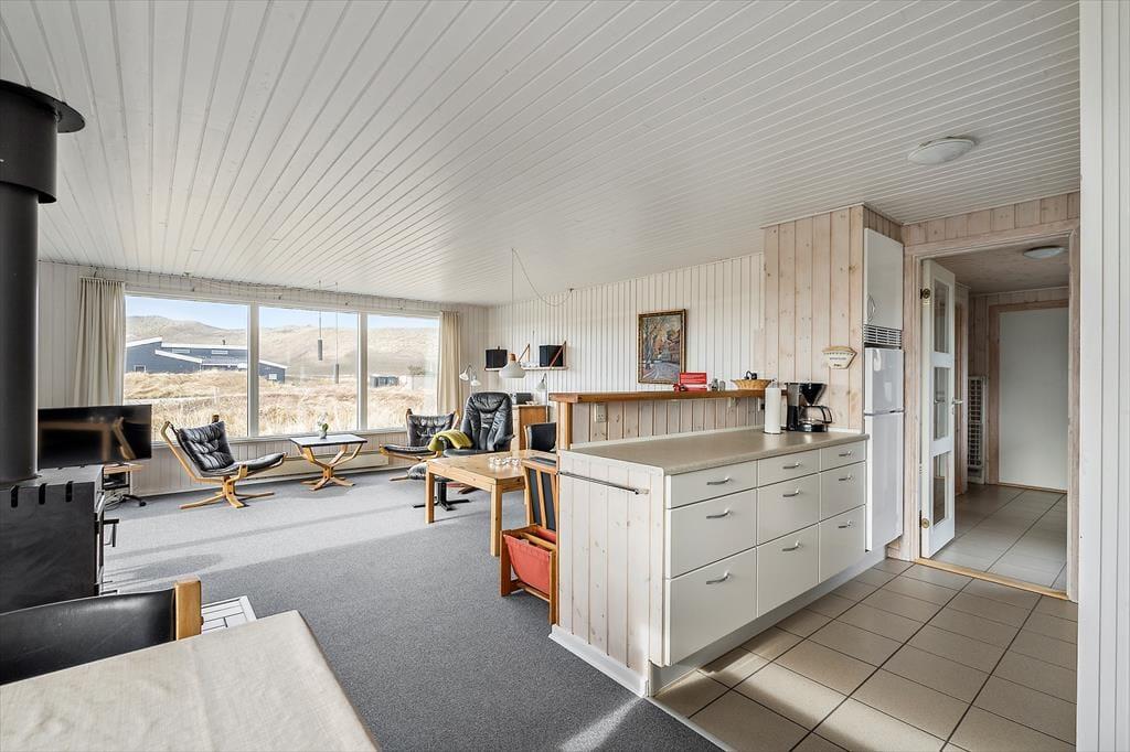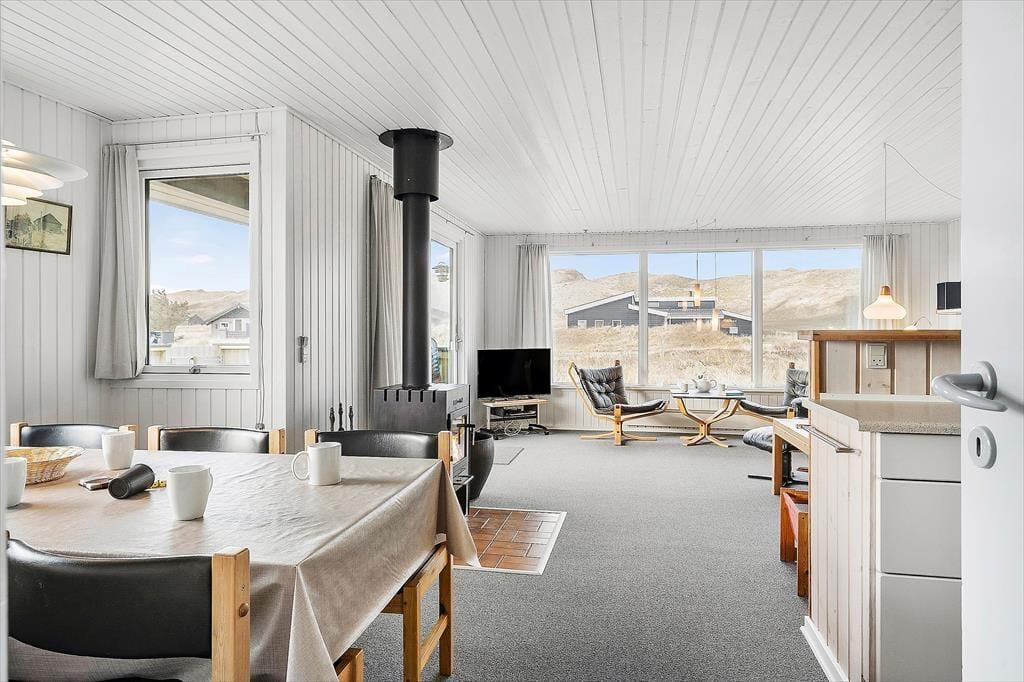 Sommerhuset er klassisk og charmerende indrettet, og ferieboligens tre store værelser giver sovepladser til seks personer. Ferieboligen byder på to badeværelser, hvoraf det ene er indrettet med bruseniche, mens det andet er med bruseniche, spabad og sauna. I har både vaskemaskine og tørretumbler til rådighed i bryggerset, og derudover består resten af sommerhuset af et lyst og åbent opholdsområde med store vinduespartier, der giver udsigt til den omkringliggende, vestjyske natur. Udsigten kan I nyde fra sofaen og lænestolene, mens ilden knitrer i brændeovnen. Køkkenet har plads til at være flere kokke om madlavningen, og opvaskemaskinen gør rengøringen nem og bekvem, mens retterne serveres ved det lange spisebord.
