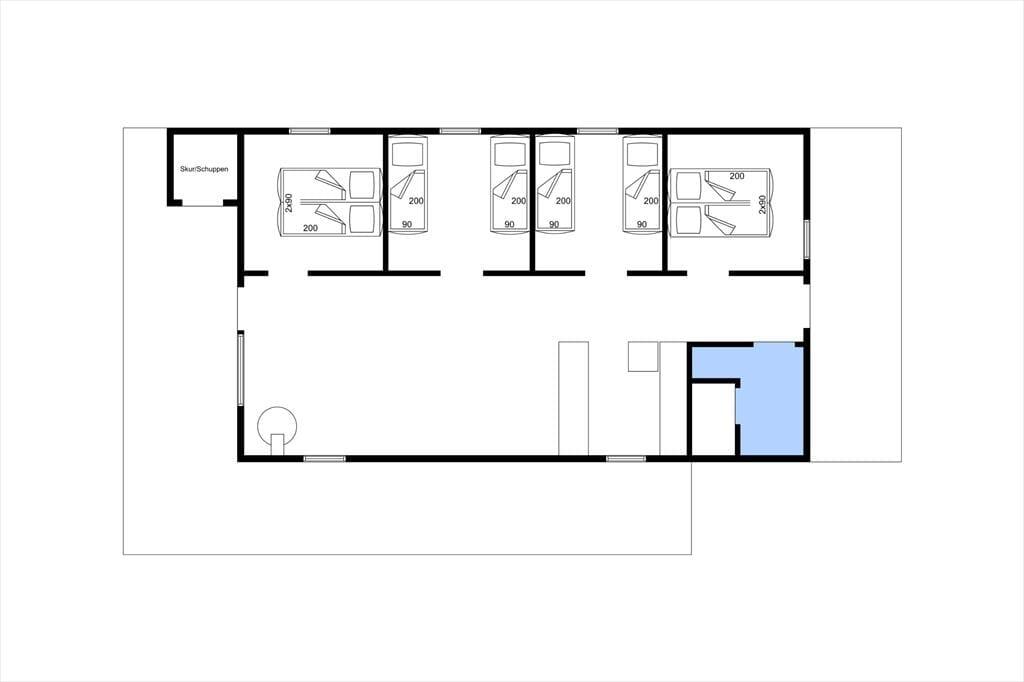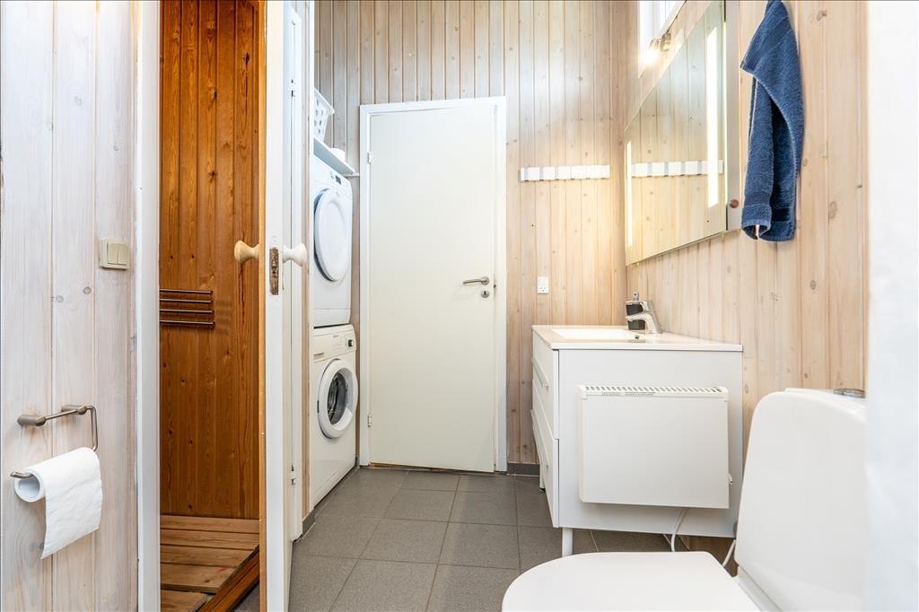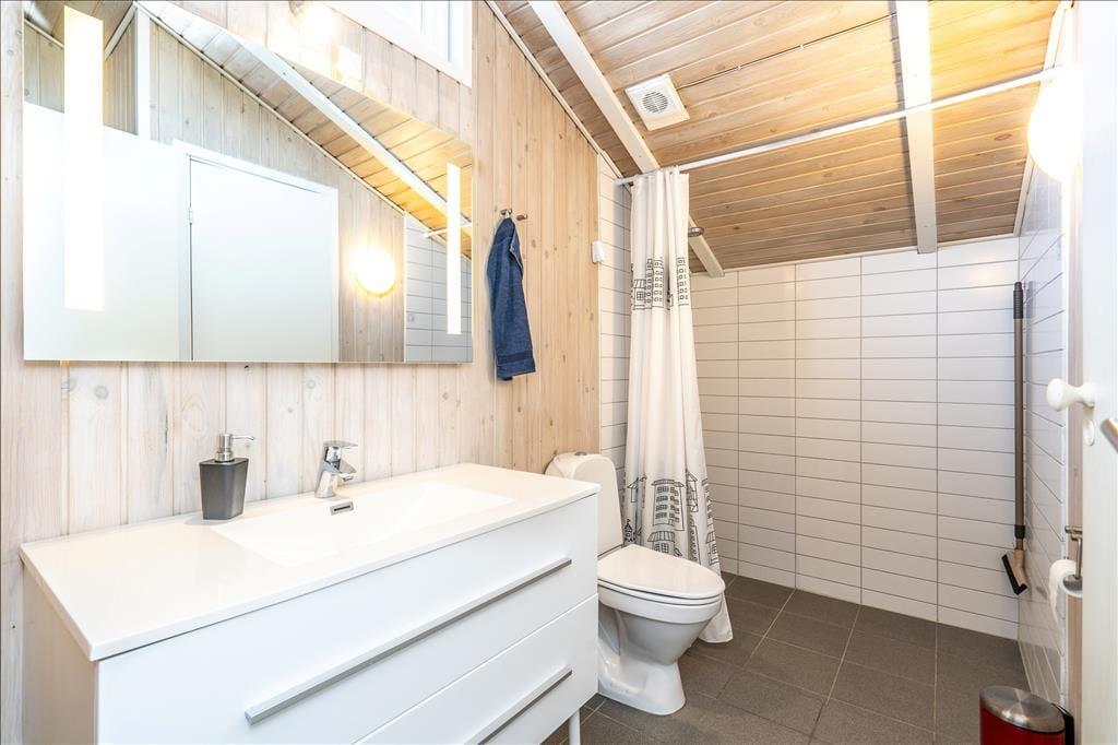 Sommerhuset er indrettet med fire gode soveværelser, som tilsammen giver nogle af jer mulighed for eneværelse. Værelserne er alle placeret langs husets nordlige facade, og derfor har opholdsområdet, hvor køkkenet og stuen glider i ét, store vinduespartier mod syd og vest, der lukker masser af lys ind. Samtidig giver husets forskudte tagflader plads til ovenlysvinduer, og jeres feriedage får derfor en lys og luftig ramme. Køkkenet er lyst og lækkert indrettet, og opvaskemaskinen gør rengøringen let og bekvem. Stuen er indrettet med en spisesektion samt et sofaarrangement, hvor I kan se tv eller nyde udsigten til naturen, mens brændeovnen varmer. Ferieboligen fuldendes af et badeværelse med vaskesøjle, gulvvarme, bruseniche og sauna.