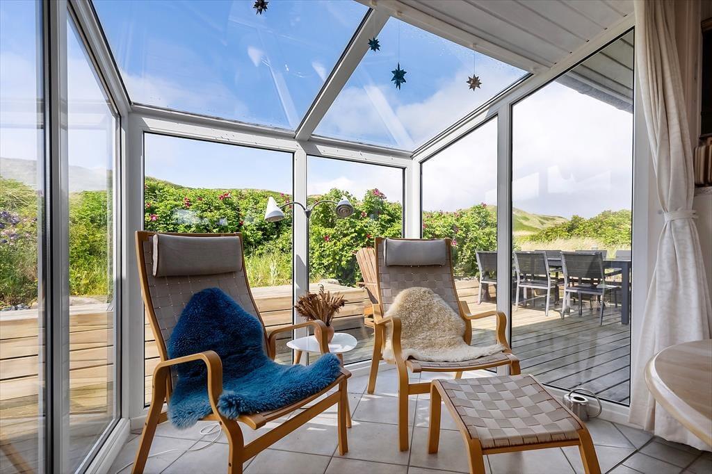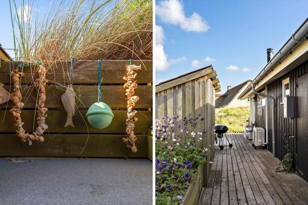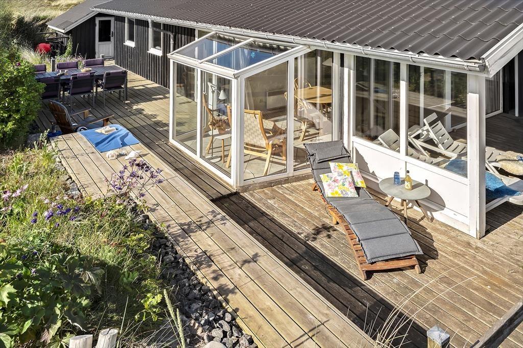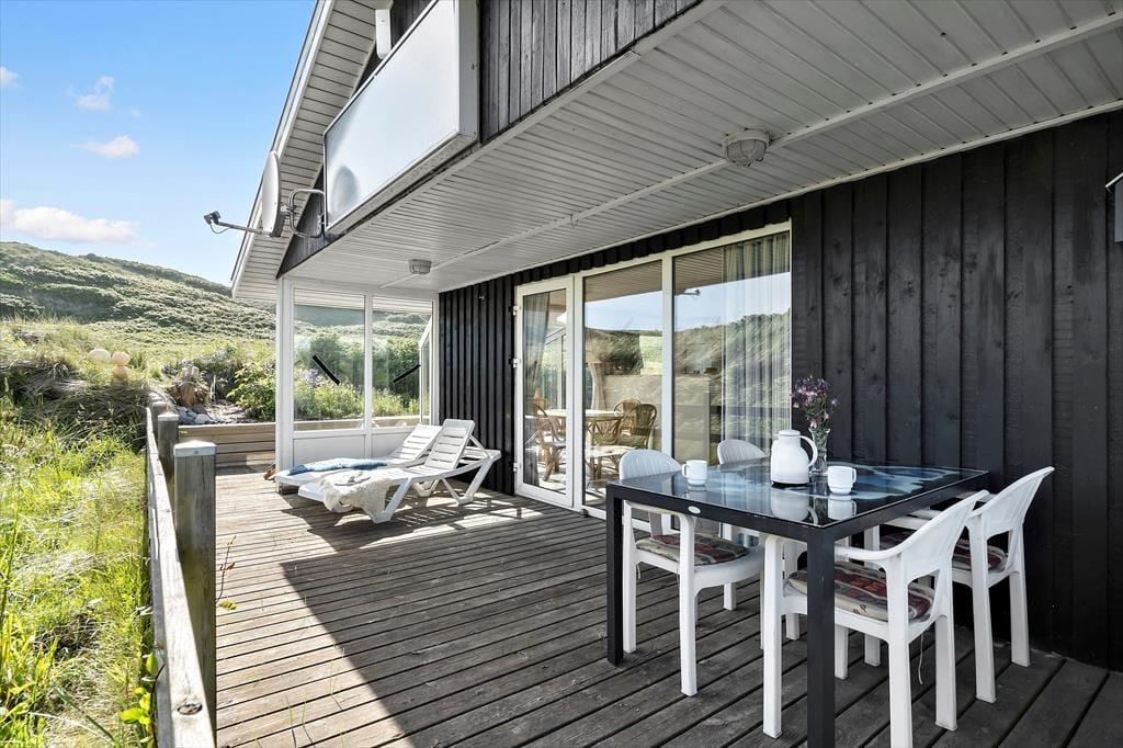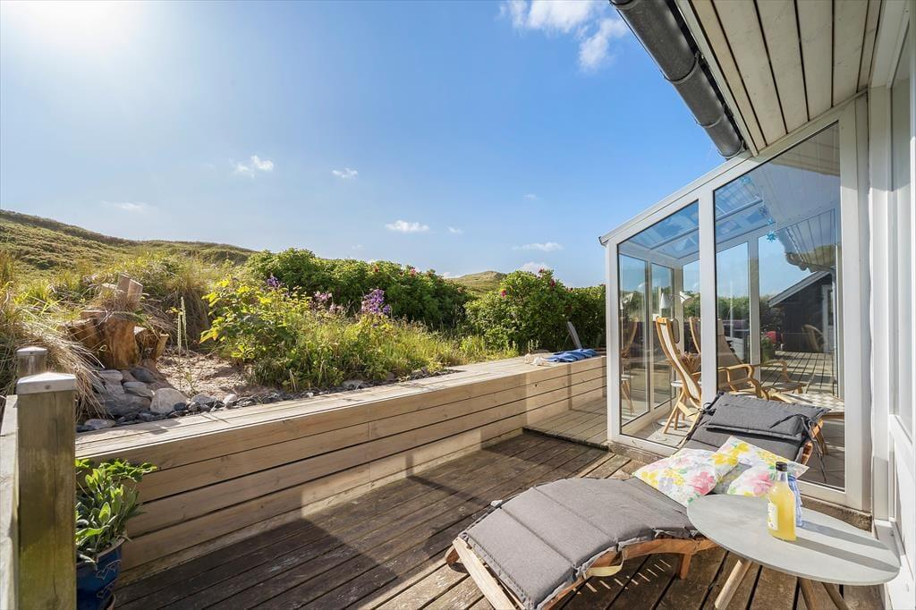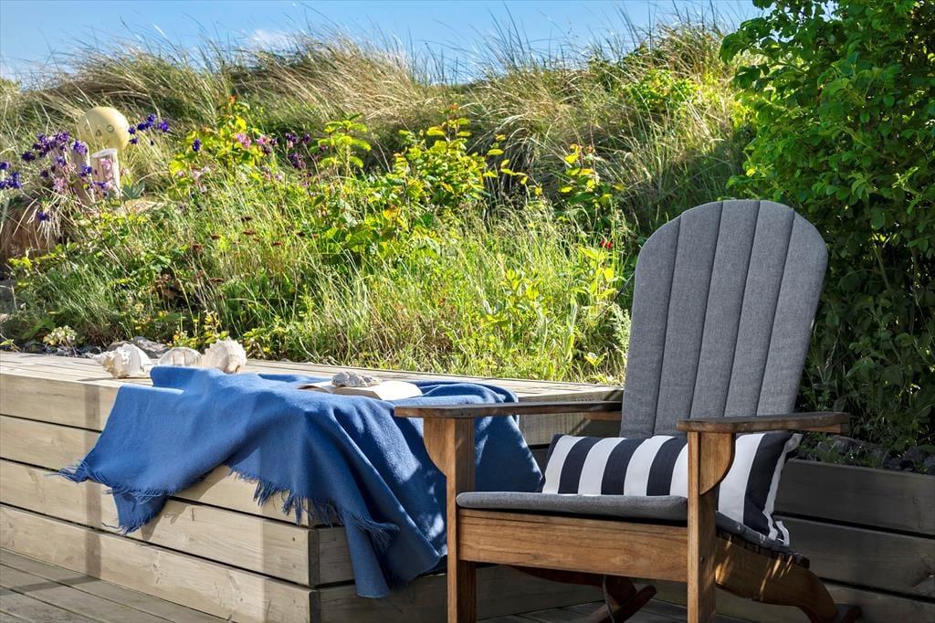 Dagen lang kan I nyde solen på terrasserne, for de strækker sig hele vejen rundt om huset. Tag kaffen med ud mod øst, og lad morgensolens røde betage jer. Servér frokosten på den sydvendte terrasse, der er delvist overdækket. Og sæt jer til rette på den vestvendte med lækker mad fra grillen og udsigt til klitterne, som lidt efter lidt opsluger den gyldne aftensol til lyden af bølgernes slag mod stranden bagved.