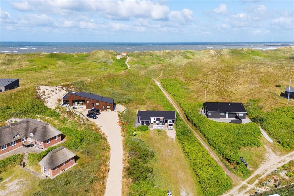 Bølgende marehalm, bløde klitter og duftende hybenbuske omgiver sommerhuset, der ligger godt tilbagetrukket fra den lukkede Karen Brands Vej på en 2994 m2 stor naturgrund. Får I lyst til en dukkert i Vesterhavet eller en gåtur langs med vestkysten, kan I følge en sti fra huset og lige ned på stranden – og begiver I jer mod øst, er der blot få minutters gang til Ringkøbing Fjord. Aargab er kendt som et godt sted at surfe og sejle kajak på fjorden, og der er også et vandsportscenter, som udlejer udstyr og tilbyder undervisning. Fra det rolige sommerhusområde har I nem adgang til Hvide Sandes centrum, så hvis I vil ud at spise, købe ind eller kigge nærmere på byens spændende fiskerihavn, tager køreturen kun få minutter.