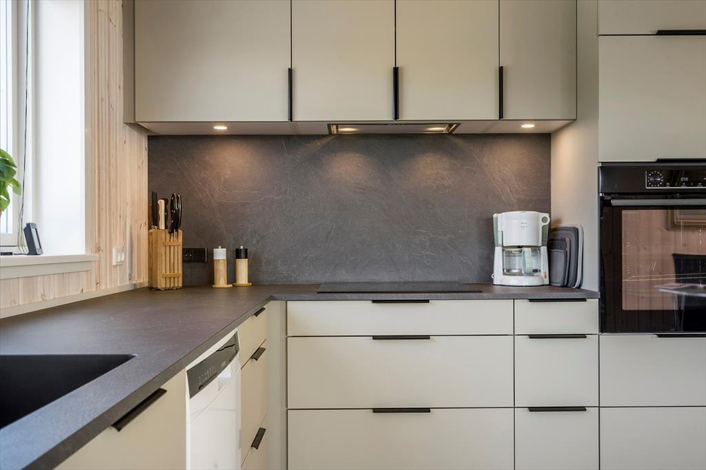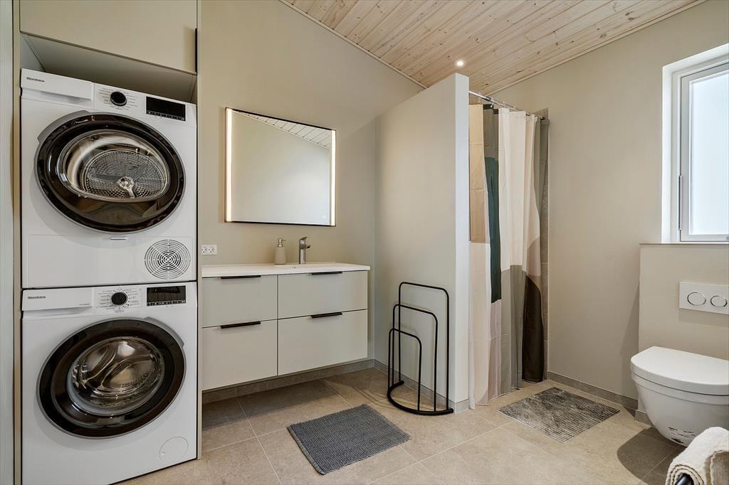 Stuen er både lys og indbydende og skaber en hyggelig atmosfære til både afslapning og socialt samvær. Badeværelset er indrettet med både vaskemaskine og tørretumbler, så du nemt kan få vasket og tørret dit tøj efter en dag på stranden.