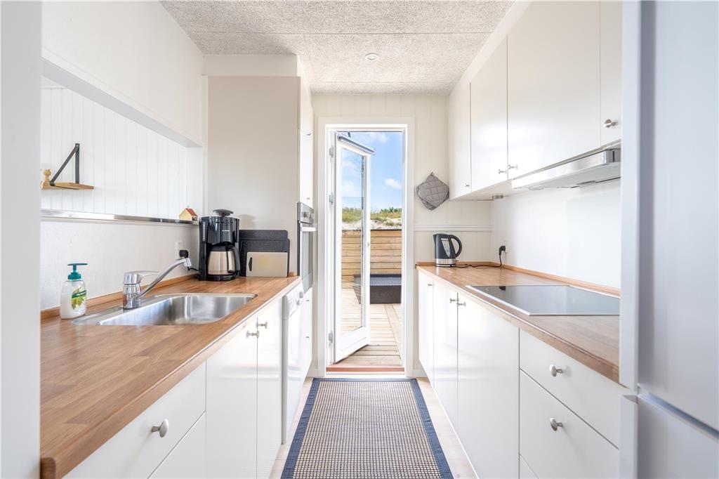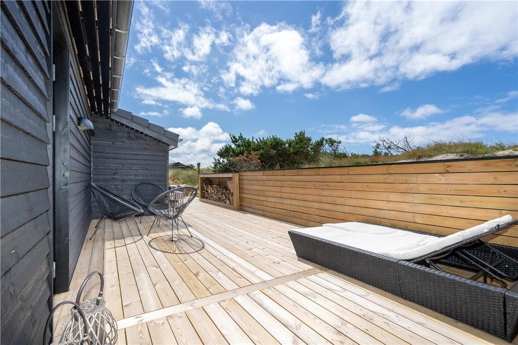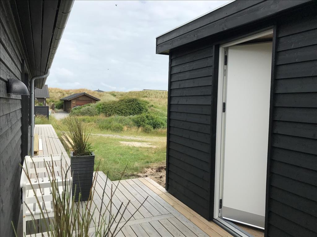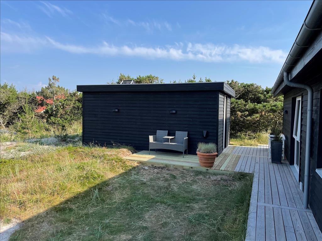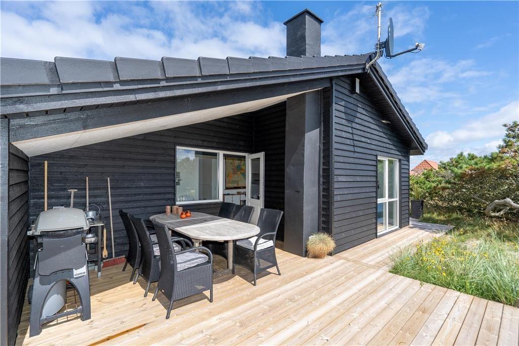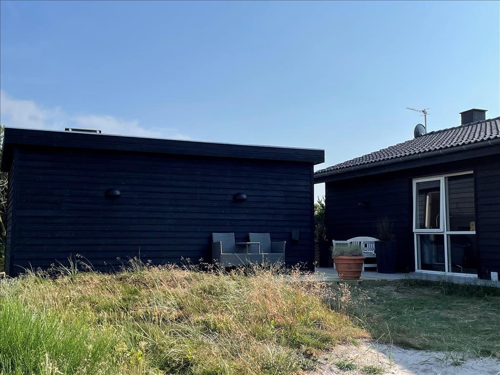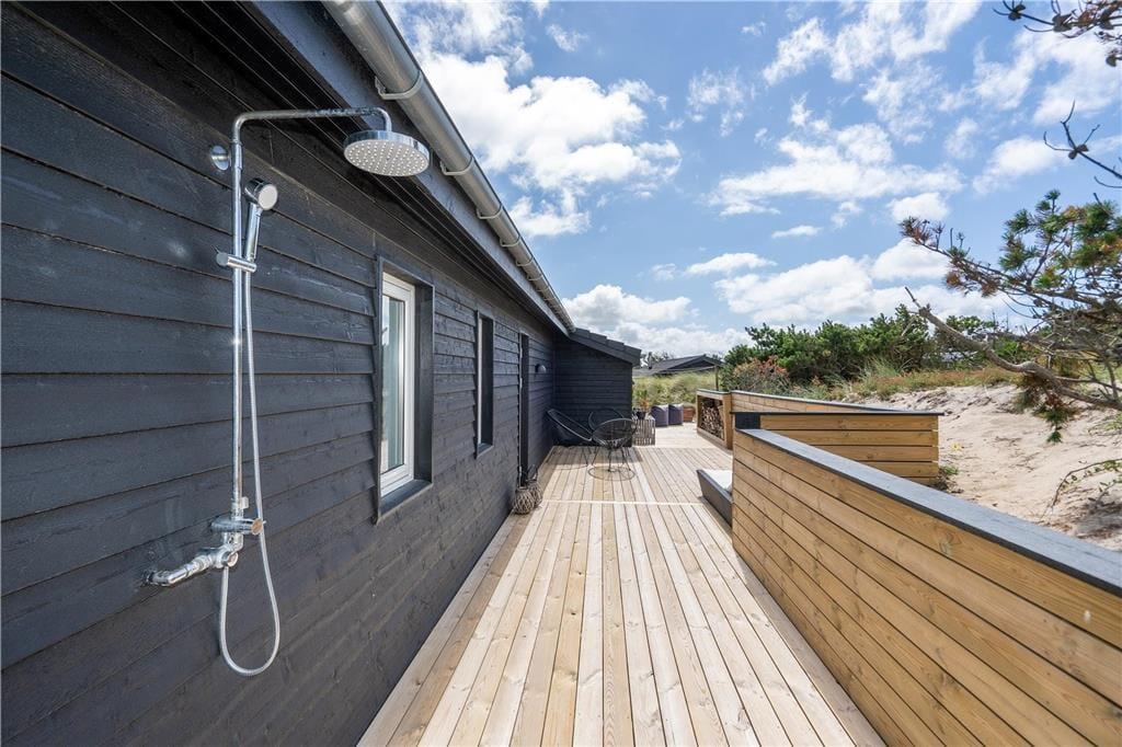 I solrigt og sommerligt vejr får I måske lyst til at spise ude under åben himmel, og så er det rart at have direkte adgang fra køkkenet til terrassen. Der er er flere gode opholdsarealer, så I kan sætte jer i den mest solbeskinnede krog – eller under overdækningen, hvis det foretrækkes. De morgenfriske kan starte dagen på østterrassen med solopgang, udsigten til Ringkøbing Fjord og en god kop kaffe. Børnene kan brænde energien af på klitgrundens trampolin, og når familien vender hjem fra en strandtur, kan I nemt skylle sand og saltvand af under udebruseren.