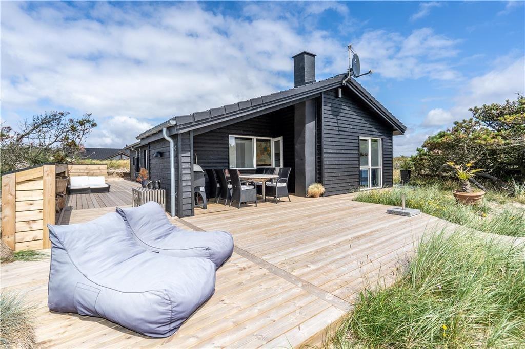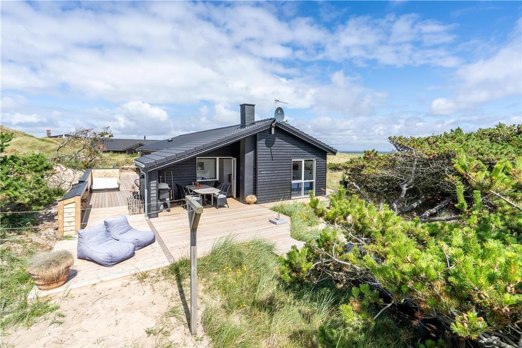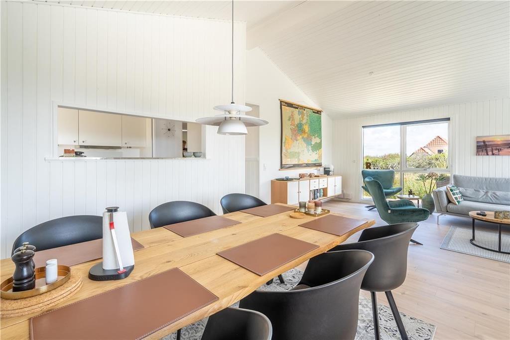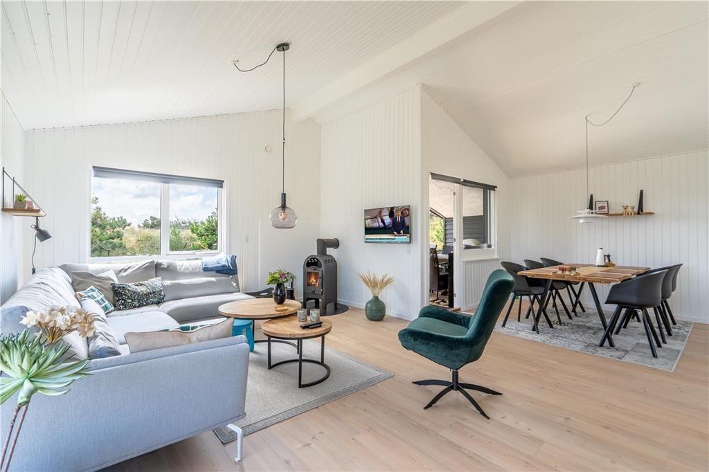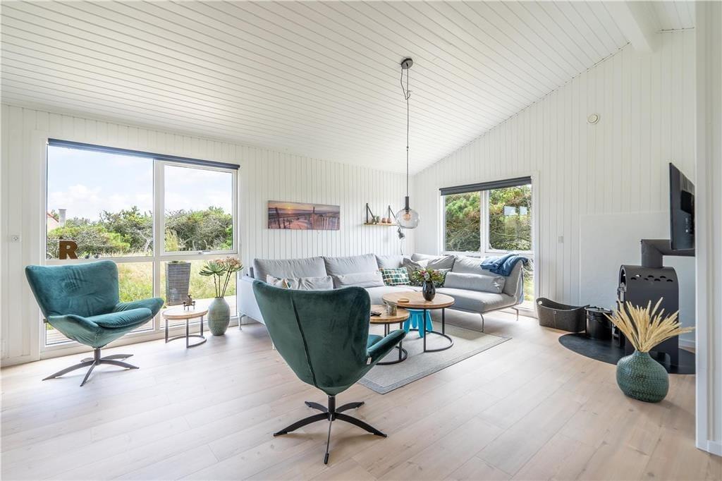 I det flotte landskab mellem Vesterhavet og Ringkøbing Fjord finder I dette store og flot moderniserede sommerhus til seks personer. Her kan I nyde solskinsvejret og fjordudsigten på den østvendte terrasse, og inden døre er stuen såvel som badeværelsets spabad skønne steder at koble af og samle ny energi.