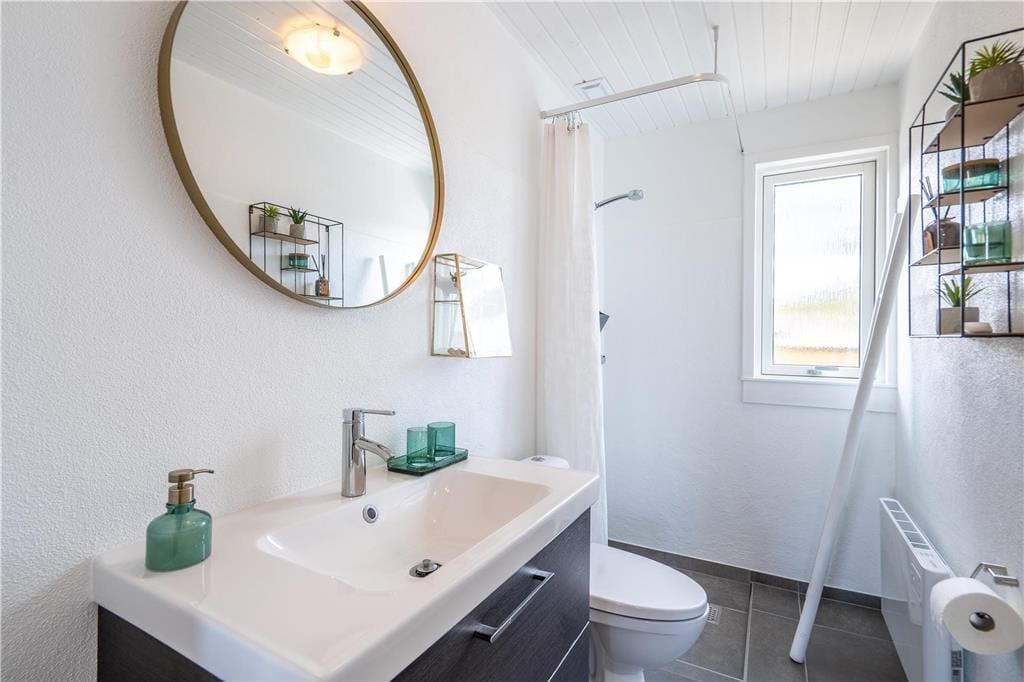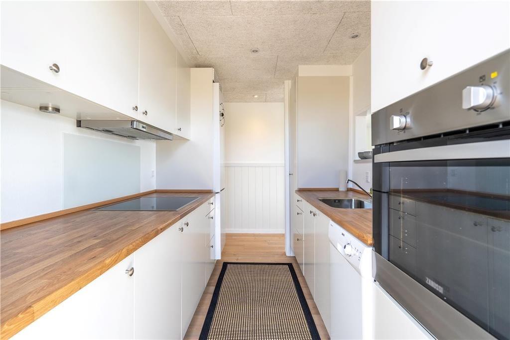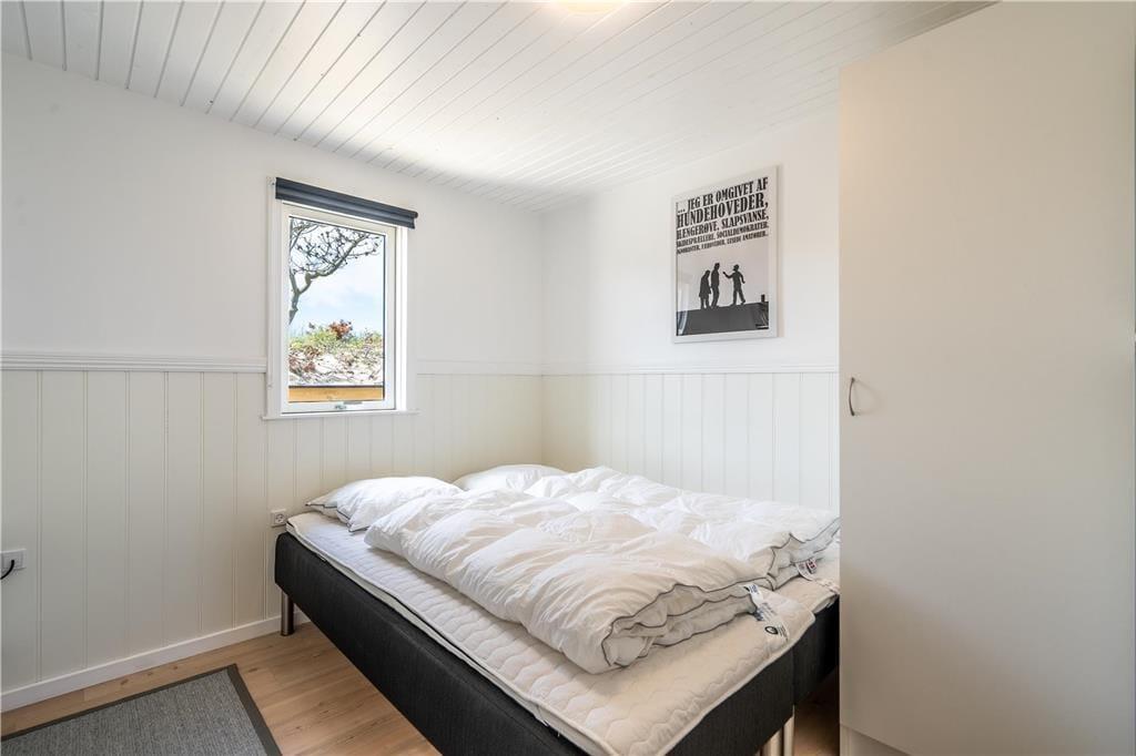 En indbydende sommerhusatmosfære melder sig lige fra ankomsten, når I træder ind i velindrettede rum med loft til kip og lys træbeklædning. Det stilfulde interiør viser tydeligt, hvor grundig seneste modernisering var – se for eksempel de to lækre badeværelser, hvoraf det ene er udstyret med spabad. Soveværelser er der tre af, og her kan alle se frem til at sove komfortabelt i de gode senge. Sommerhuset byder for øvrigt på to opholdsarealer, der ligger i åben forbindelse, blot adskilt af et gangareal. En lille opholdsstue giver plads til børnenes leg, eller hvis teenageren vil se tv i fred. Ellers kan I alle samles i den store stue, hvor I kan hygge jer ved brændeovnen eller nyde fjordudsigten gennem vinduerne, og fra det veludstyrede køkken kan I hurtigt lange retterne hen til spisebordet, når det er spisetid.