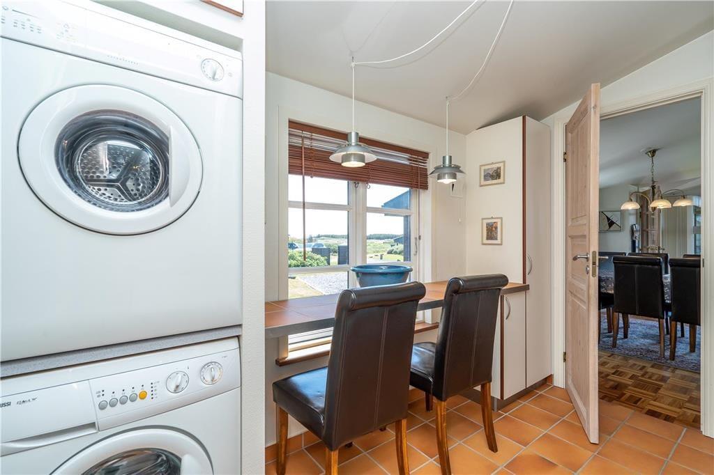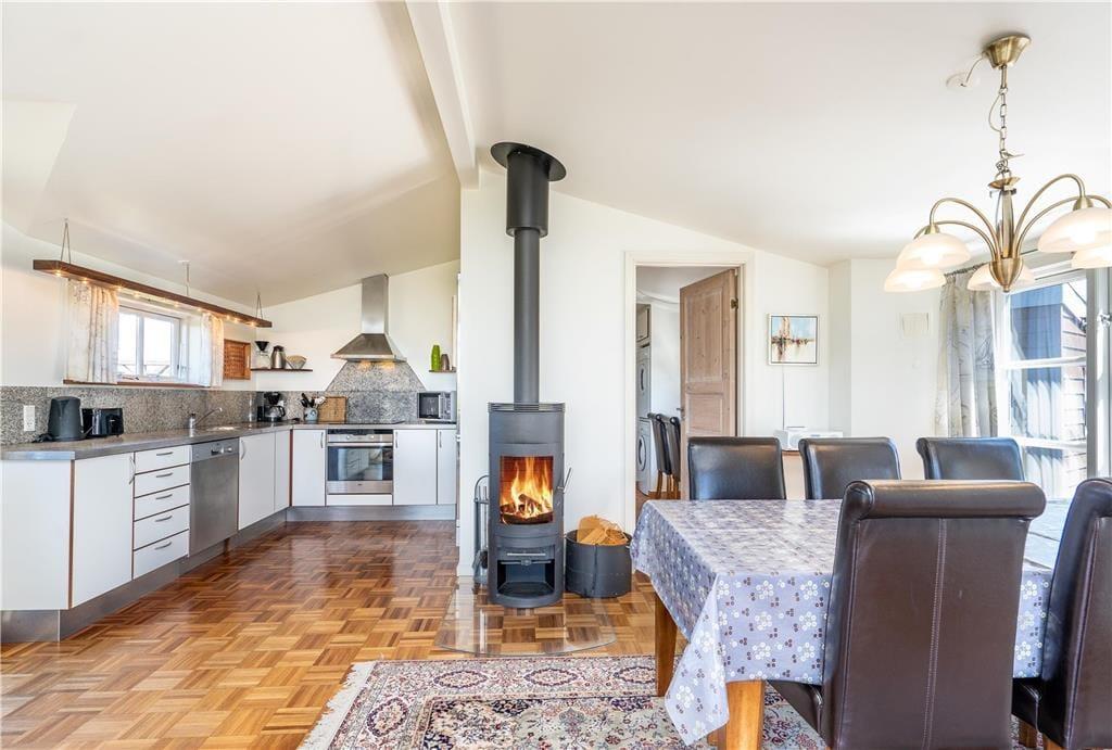Hvis både humøret og vejrudsigten indbyder til en rigtig hyggeferie inden døre, er det 95 m2 store sommerhus godt indrettet til formålet. I stuen er der komfortable siddemøbler og parabol-tv, og brændeovnen står klar nær spisebordet, hvis I vil drikke varm kakao og spille kort i skæret fra flammerne. Et veludstyret køkken ligger i åben forbindelse med stuen, de tre soveværelser har sengepladser til seks personer, og i et gennemgangsrum står et bordfodboldbord, der inviterer til sjove familiedyster. Et praktisk bryggers byder på en vaskesøjle, og badeværelset er med spabad og sauna, så en rolig wellness-stund kan nemt blive et tilbagevendende indslag i løbet af ferien.