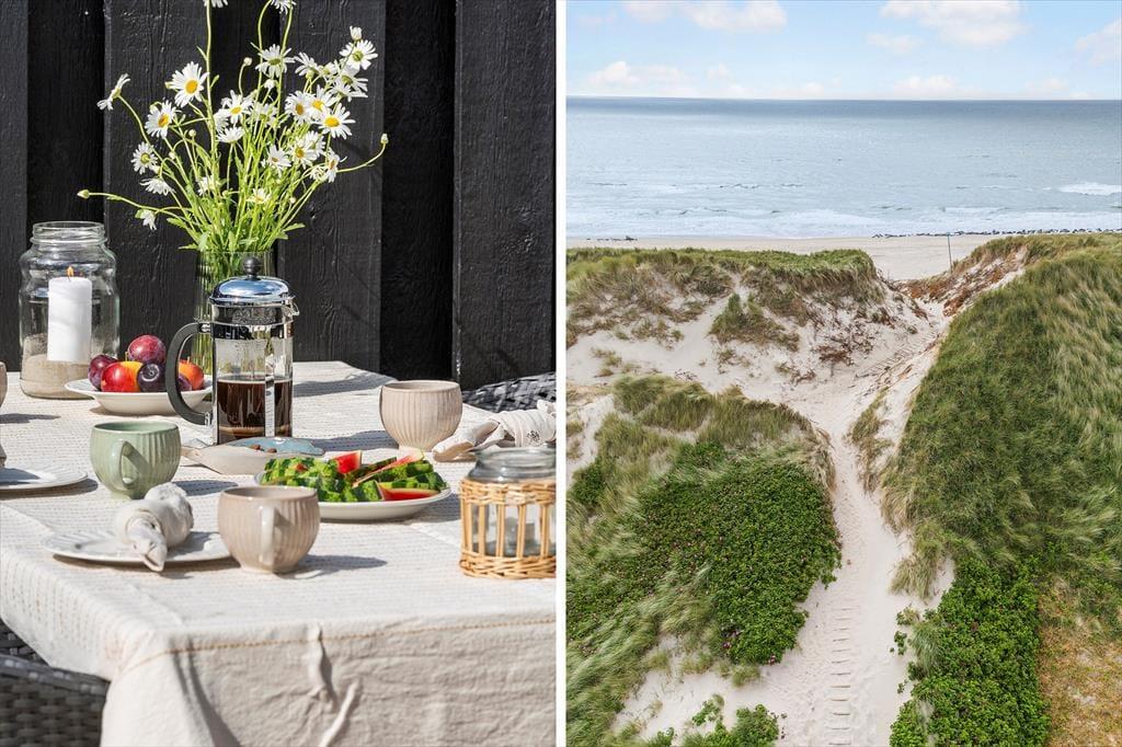 Sommerhuset ligger lige ud til klitfredningslinjen, og der er kun 60 meter til Aargabs smukke sandstrand. Vil I have en opkvikkende dukkert efter en saunatur, kan I hoppe i badetøjet og begive jer mod Vesterhavet, og om aftenen kan I se frem til de flotteste solnedgange fra toppen af klitterne. Fra den lukkede vej har I knap en kilometer til Westwind Syd, der er et af Hvide Sandes gode surfspots ud mod Ringkøbing Fjord. Lystfiskeri kan lade sig gøre i både fjord og hav, og der er også flere put and take-søer, hvis ikke det er ved Hvide Sandes havn, I vil prøve lykken.