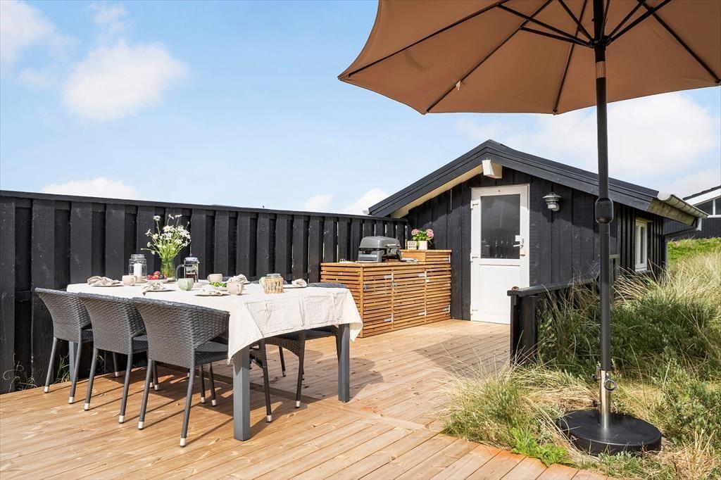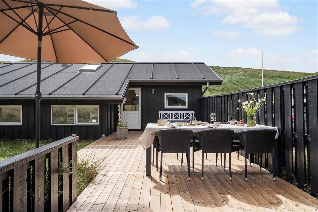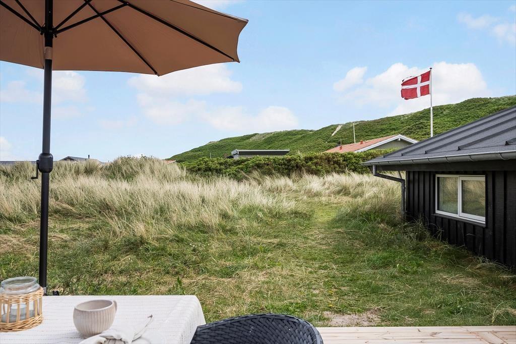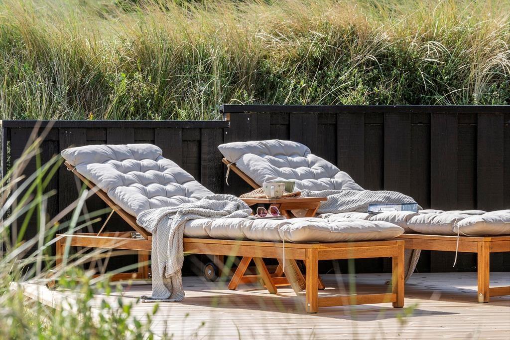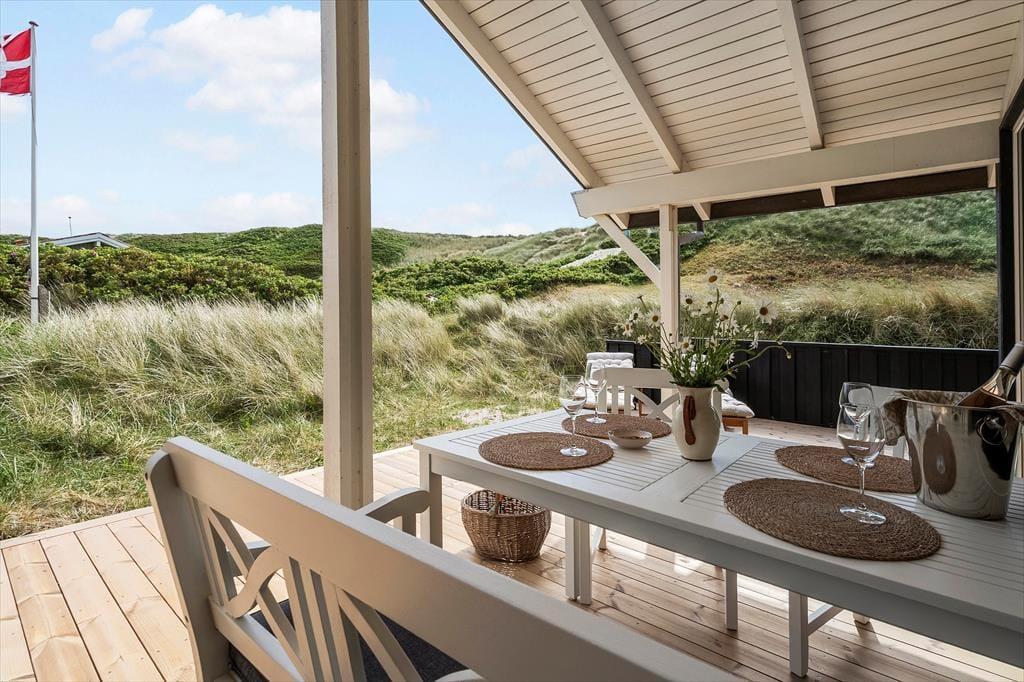 Udsigten til klitterne er flot inde fra huset, og den bliver bestemt ikke mindre betagende, når I opholder jer ude i det fri på den store naturgrund. Fra stuen har I direkte adgang til en skøn og delvist overdækket terrasse, der breder sig mod syd og vest, og mod øst venter endnu en skøn terrasse, som skærmes af et plankeværk mod naboerne. Det er nemt at føle sig fuldstændigt afslappet, når man sidder her i høj sol.