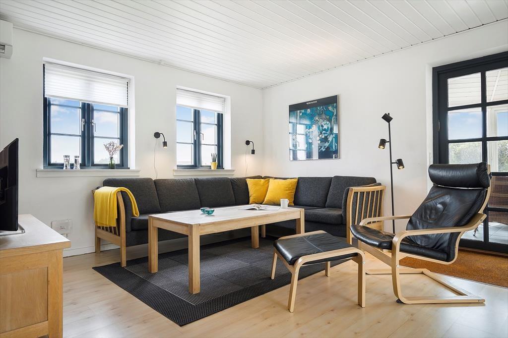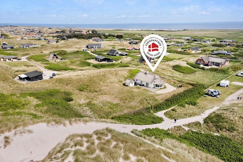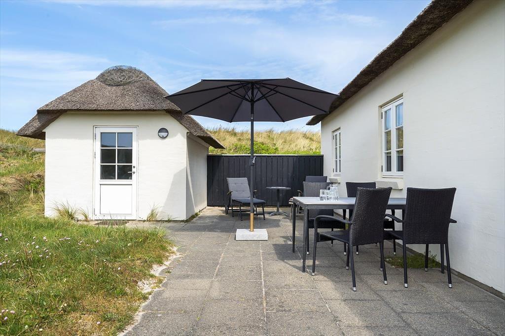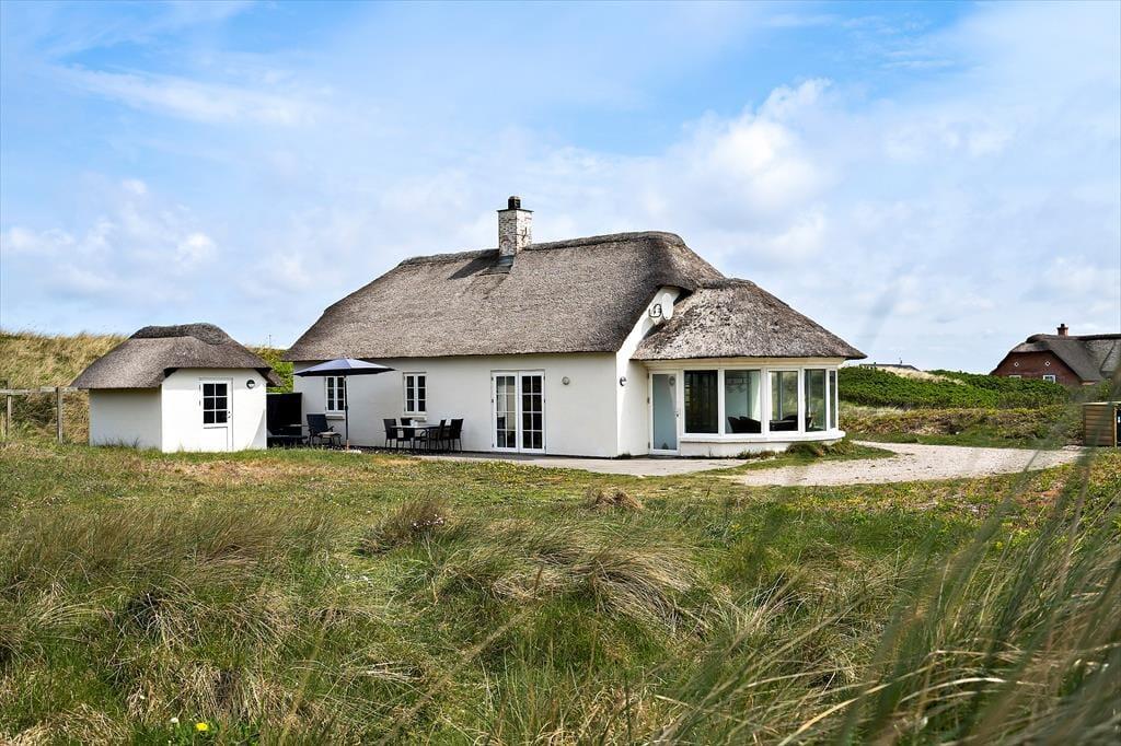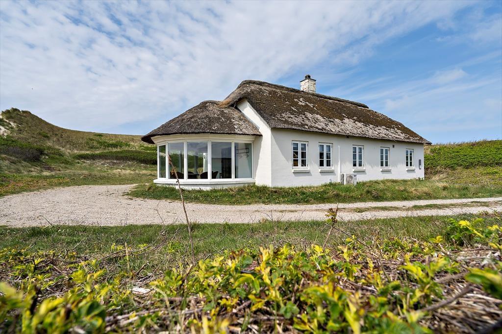 Hvis I drømmer om at holde ferie tæt på stranden, har I kig på det helt rette hus. Dette hyggelige, stråtrækte sommerhus ligger nemlig i først parket til Aargab Strand, og fra opholdsafdelingen, udestuen og solterrassen har I den skønneste udsigt til det kuperede klitlandskab, der strækker sig langs med vestkysten.