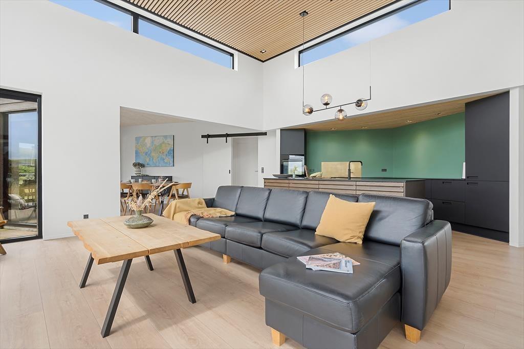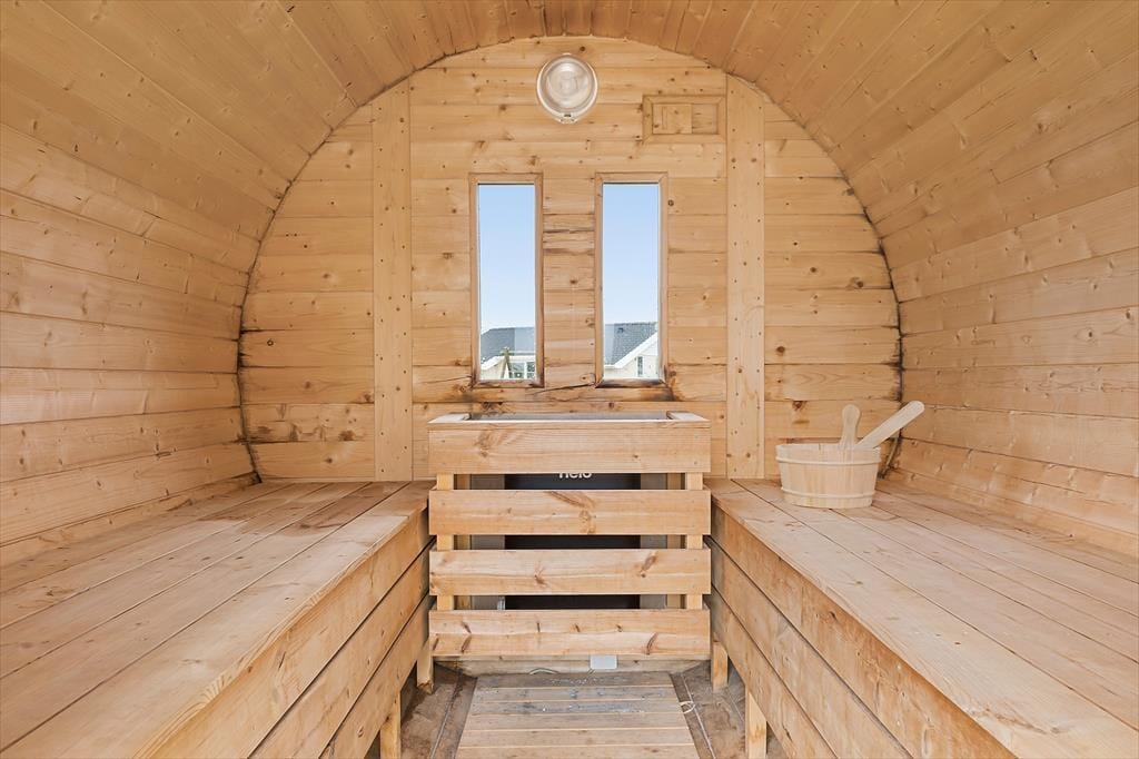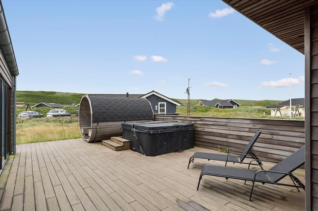 Ikke bare fra stue og aktivitetsrum, men også fra de fire soveværelser er der havedør ud til terrassemiljøet, så det er ingen sag at komme ud i det fri, når solen skinner. Fra spabadeværelset har du også direkte adgang til det udendørs wellnessmiljø, der består af en tøndesauna, en udebruser og et stort spabad. Det er den rene selvforkælelse at sidde her og koble helt af uanset årstiden. Et stort og åbent terrasseareal breder sig syd for sommerhuset, og mod vest venter en overdækket terrasse, hvor I uden problemer kan sidde alle sammen med udsigt til klitterne og det fredfyldte sommerhusområde.