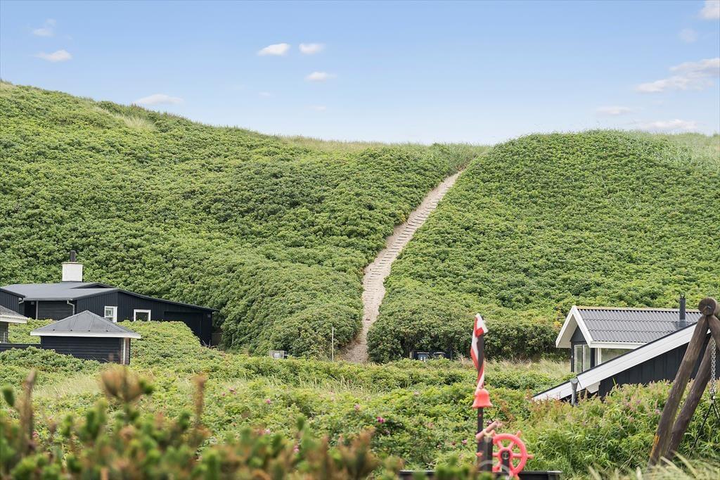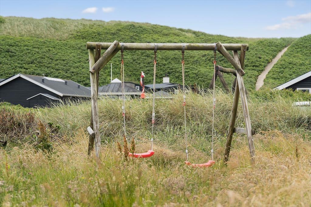 Den lille, lukkede vej, som sommerhuset ligger på, fører lige ud til klitterne, og herfra kan du følge en sti det sidste stykke til Aargab Strand. Gåturen er så kort, at du sagtens kan tilbagelægge distancen flere gange dagligt – så hvis du for eksempel vil begynde dagen med en løbetur i vandkanten og senere vil tage børnene med ned for at bygge sandslotte, kan det nemt lade sig gøre. Sommerhuset ligger for øvrigt ikke kun tæt på Vesterhavet, men også Ringkøbing Fjord, så der er rig mulighed for at surfe og prøve andre vandaktiviteter i løbet af ferien. Cykling og lystfiskeri er også populært på Holmsland Klit – og mon ikke hele familien vil elske at tage den korte tur ind til Hvide Sande for at daske rundt i de hyggelige gader og spise is ved havnen.