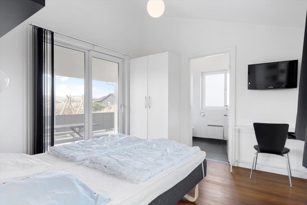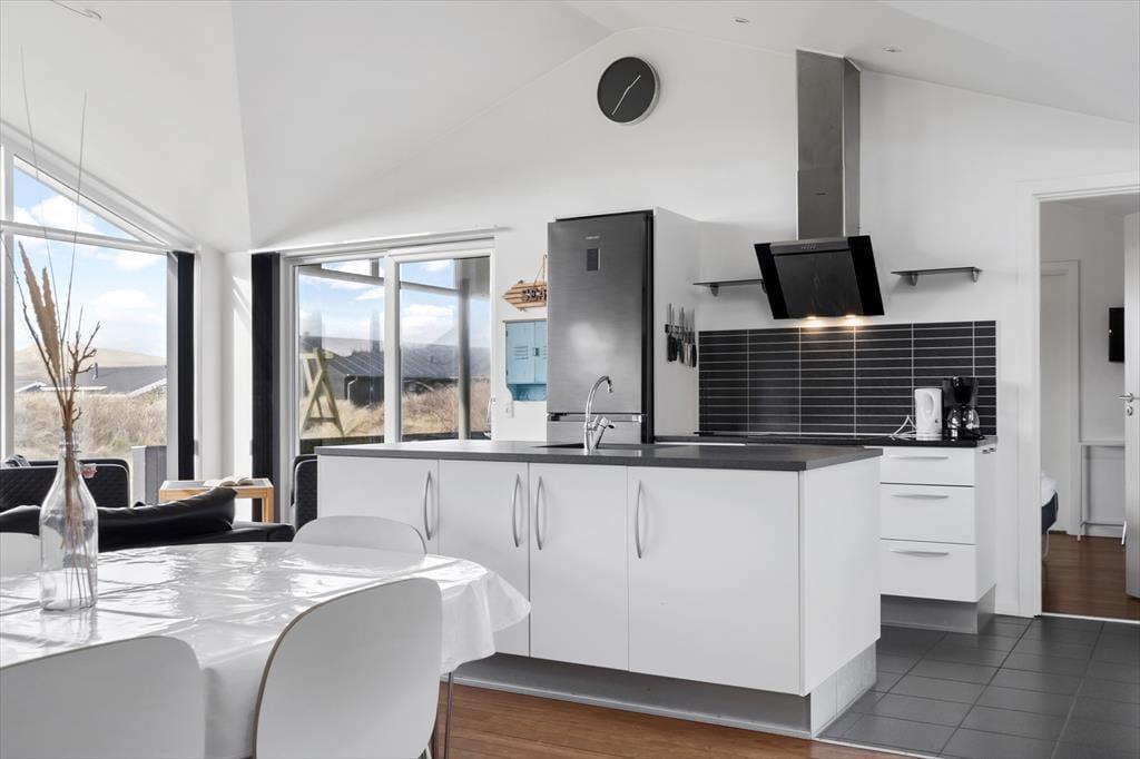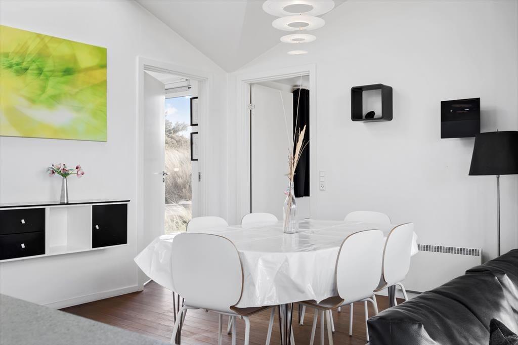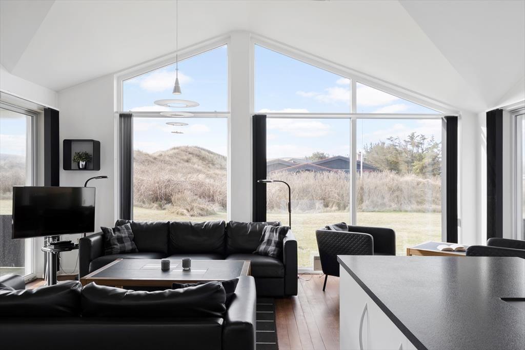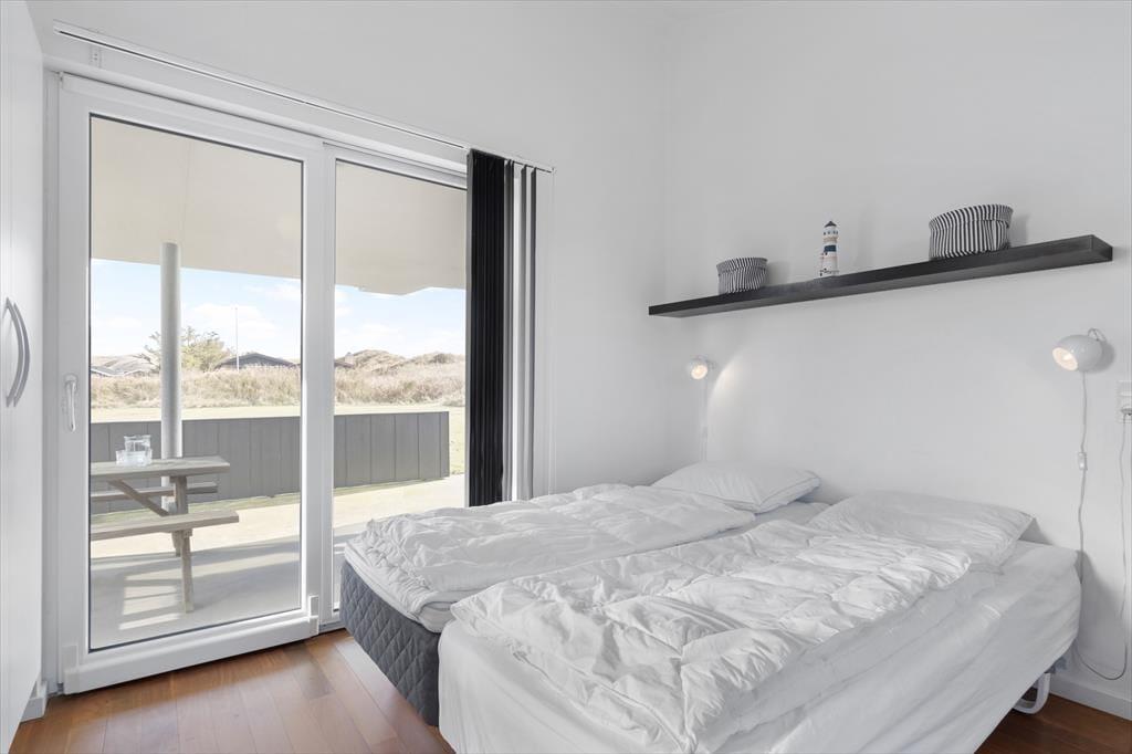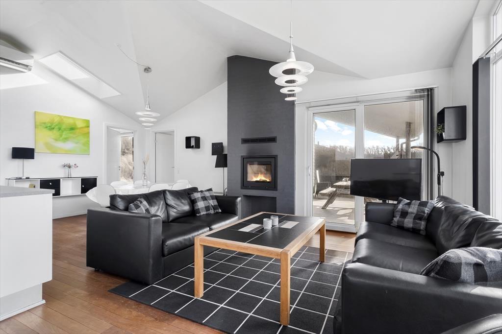Sommerhusets lyse atmosfære, det pæne møblement og det veludstyrede åbne køkken er nogle af de kvaliteter, der først springer i øjnene. Måske vil du også bide mærke i, at der er indbygningspejs i stuen, så du kan skrue op for både varmen og hyggestemningen, når det er tid til brætspil, avislæsning i sofaen eller et velduftende aftensmåltid ved spisebordet. Spabadet og saunaen, der er installeret på det største badeværelse, giver dig mulighed for at fylde dagene med wellness. I det hele taget er det værd at bemærke, at alle tre soveværelser har eget badeværelse – så hvis du holder ferie med gode venner, eller hvis bedsteforældrene ønsker at få lidt privatliv, kan det sagtens lade sig gøre.