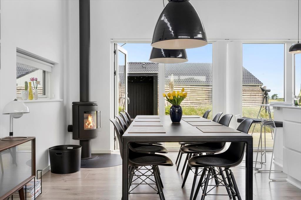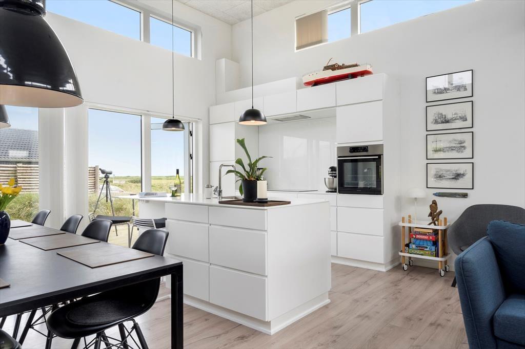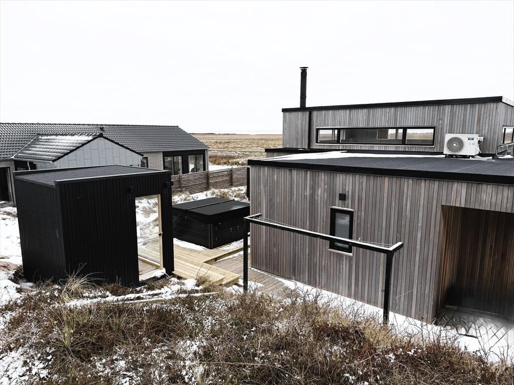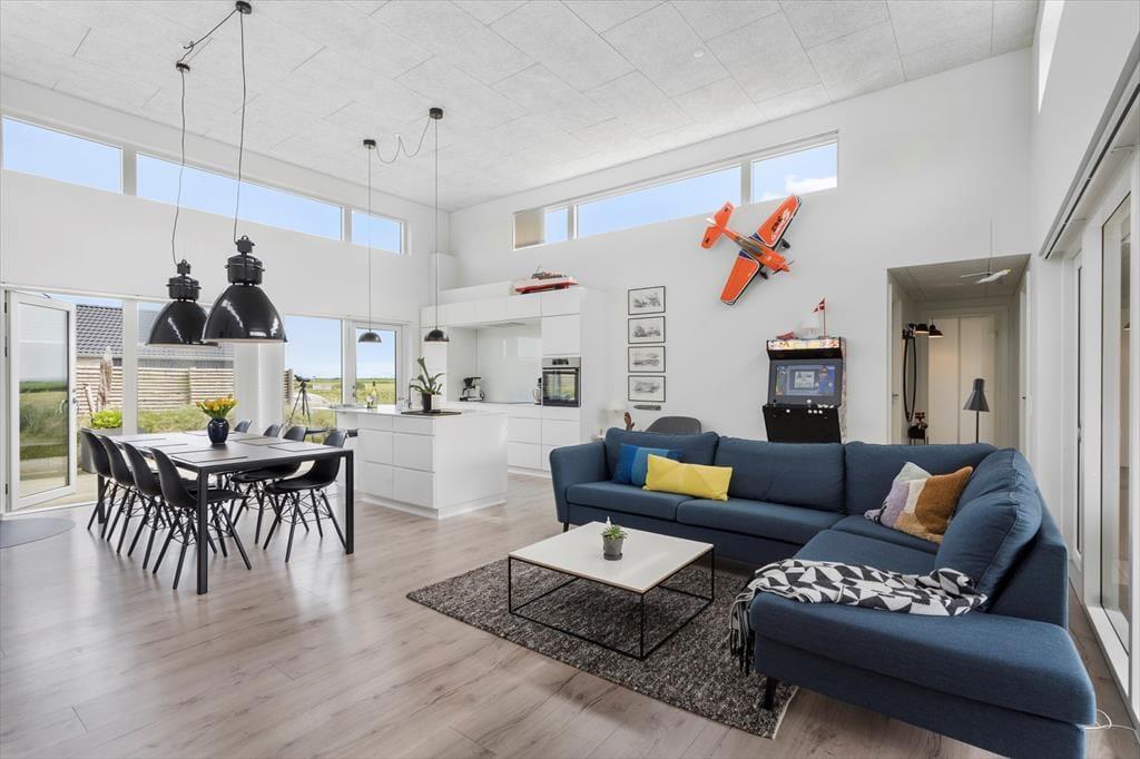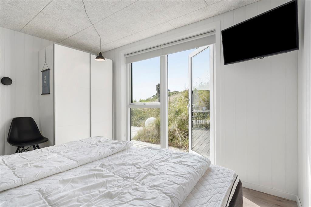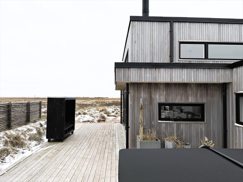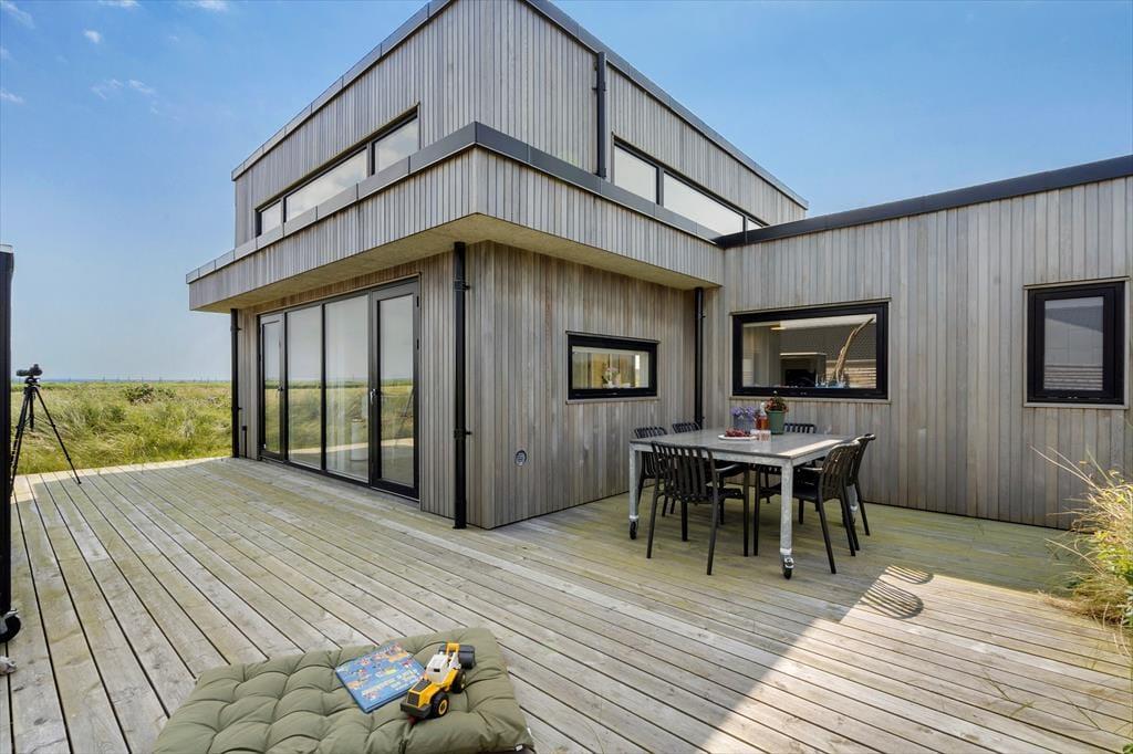 Sommerhuset er opført i 2019 med en flot træfacade, der passer godt ind i Holmsland Klits naturskønne farvepalet. Inden døre sørger de mange vinduespartier for et smukt lysindfald, og fra stuen kan du skue ud over det åbne landskab og skimte fjorden mod øst. Et lækkert køkken er integreret med stuen, så du kan sagtens holde gang i hyggesnakken, selvom du skal røre i gryderne. Den væghængte spillemaskine sørger for masser af underholdning til legebørn i alle aldre, og hvis det er køligt i vejret, kan du tænde op i brændeovnen og lade varmen sprede sig. Planløsningen byder på fire store soveværelser og to gode badeværelser, og rummene er ligeligt opdelt i to afdelinger, så hvis du er ved at arrangere en ferie for to familier, er huset et ideelt match.