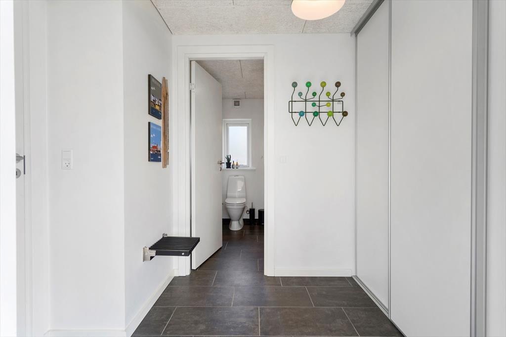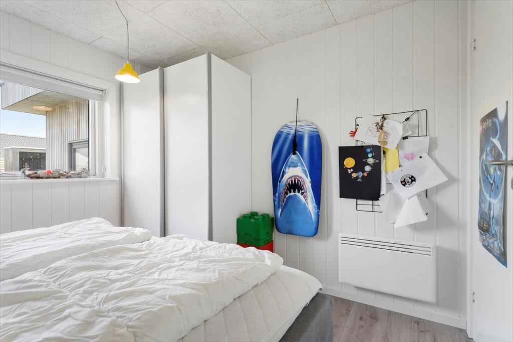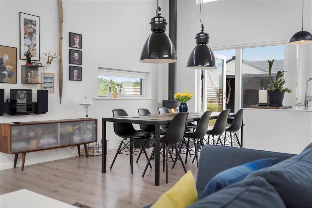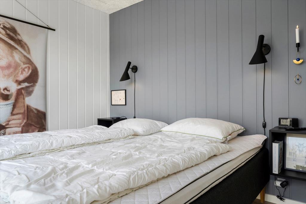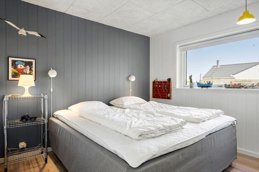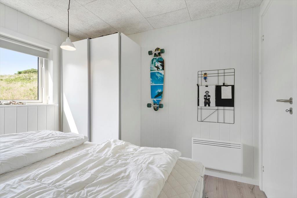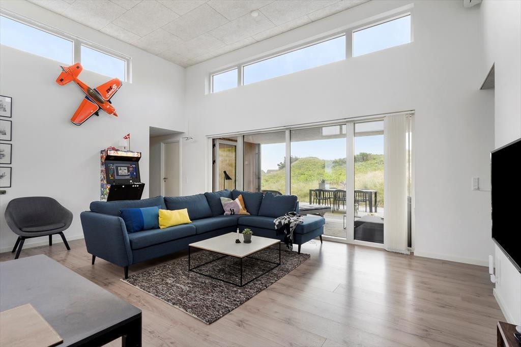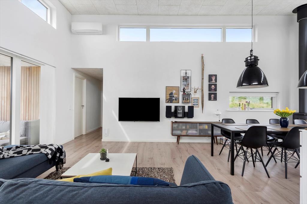 Sommerhuset er opført i 2019 med en flot træfacade, der passer godt ind i Holmsland Klits naturskønne farvepalet. Inden døre sørger de mange vinduespartier for et smukt lysindfald, og fra stuen kan du skue ud over det åbne landskab og skimte fjorden mod øst. Et lækkert køkken er integreret med stuen, så du kan sagtens holde gang i hyggesnakken, selvom du skal røre i gryderne. Den væghængte spillemaskine sørger for masser af underholdning til legebørn i alle aldre, og hvis det er køligt i vejret, kan du tænde op i brændeovnen og lade varmen sprede sig. Planløsningen byder på fire store soveværelser og to gode badeværelser, og rummene er ligeligt opdelt i to afdelinger, så hvis du er ved at arrangere en ferie for to familier, er huset et ideelt match.