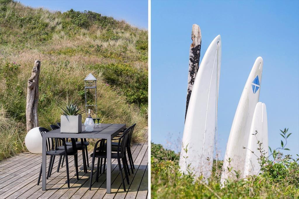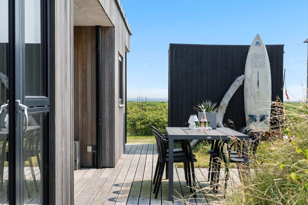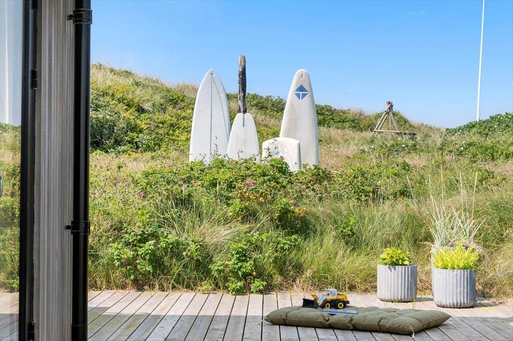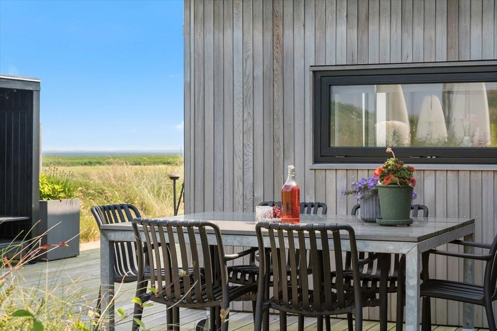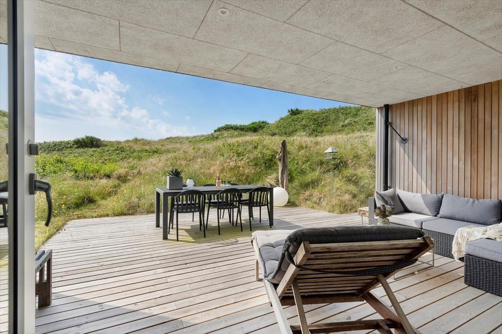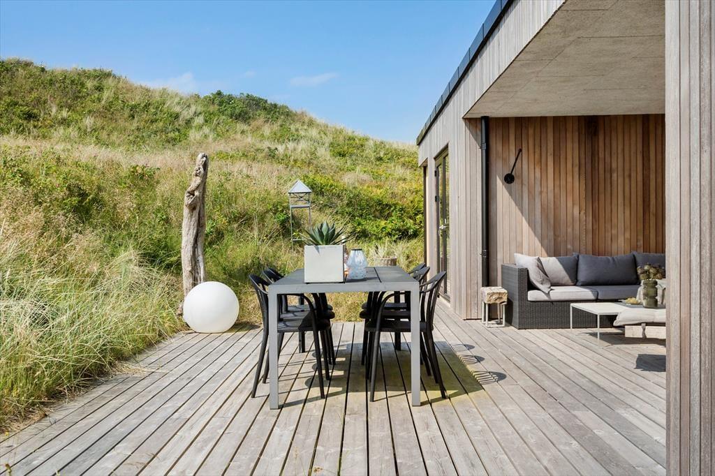 Huset ligger lige på kanten til Mettes Bjerg, som er den høje klit, der har givet vejen sit navn. Går du op til det højeste punkt på naturgrunden, kan du sætte dig på en bænk og lade blikket vandre over det smukke landskab. Her fra toppen er udsigten til Ringkøbing Fjord betagende, og fra de nordlige og østlige terrasser kan du også skimte vandet, når du slapper af i de rare omgivelser. Sommerhusets tredje terrasse er orienteret mod syd, og den skærmes lidt af klitterne, så det er et skønt sted at sole sig. En del af sydterrassen er for øvrigt overdækket, og den ligger i et indhak ind mod stuen, så her kan du sidde trygt og godt i læ.