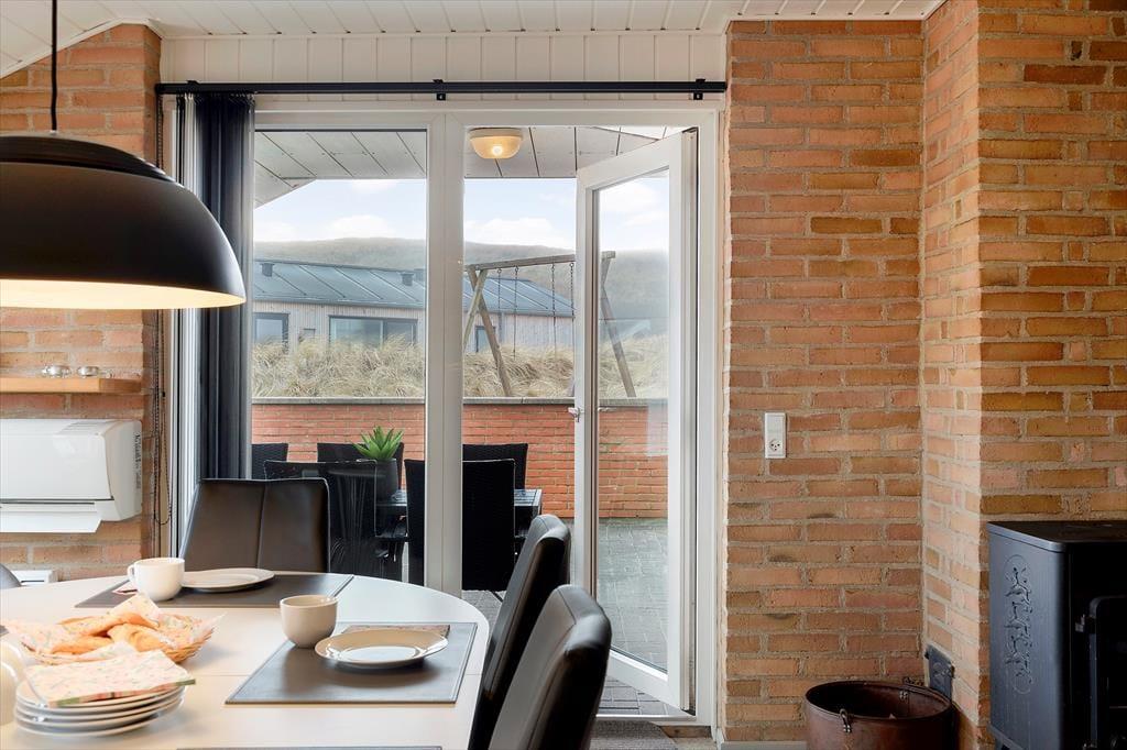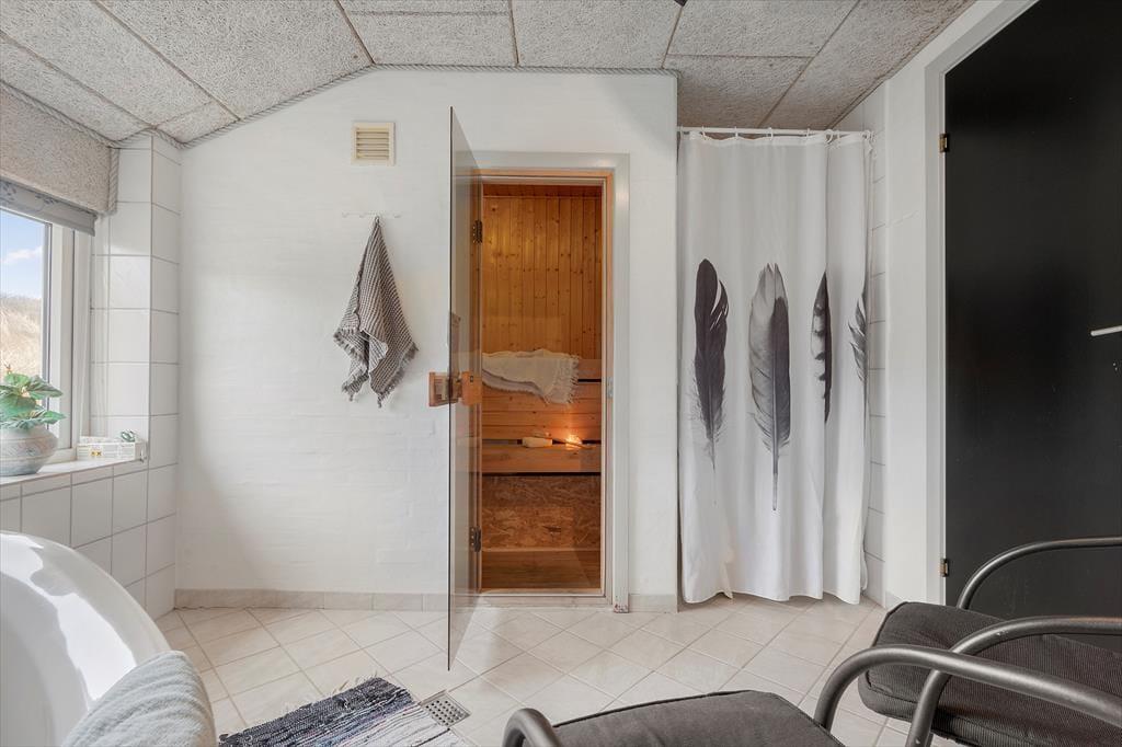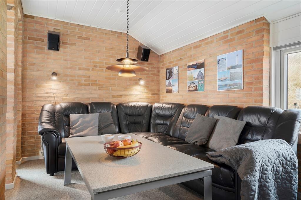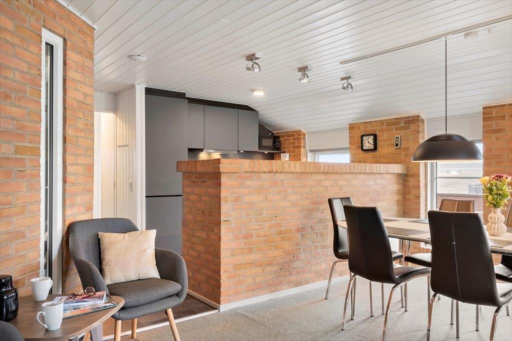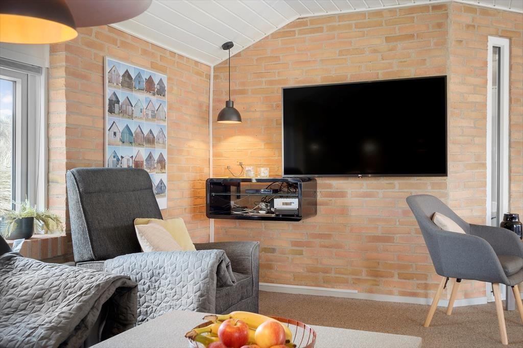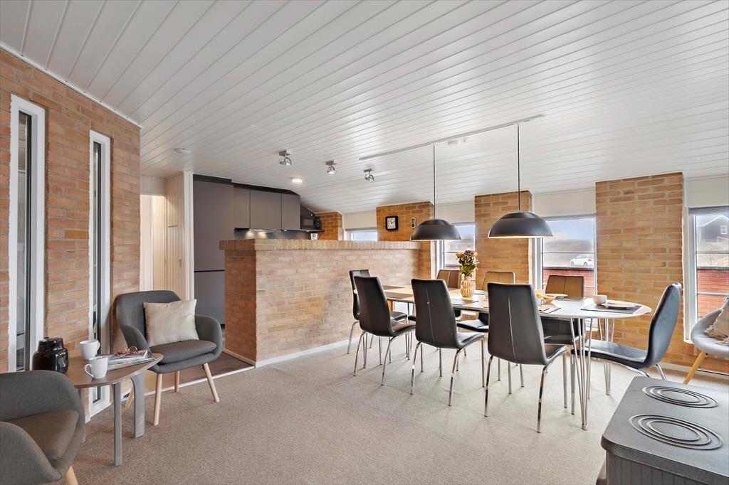 Som du træder ind i sommerhuset på Mettes Bjerg 30, bliver du mødt af et lyst og åbent rum, hvor naturen træder ind gennem de store vinduer og skaber en lys og indbydende stemning. Indretningen med den rå mursten på væggene blandet med de hyggelige og komfortable møbler, giver et nordisk og hyggeligt præg. I stuen kan du nemt finde dig til rette foran brændeovnen, hvor du kan nyde roen, eller måske tage en pause i den komfortable sofa, mens du ser ud over den smukke natur. Køkkenet er funktionelt og indbydende, og der er gode muligheder for at lave både hurtige feriemåltider eller en lækker middag, som kan nydes sammen med familien. De tre soveværelser er rummelige og giver plads til ro og afslapning, mens badeværelset med spabad og sauna giver den perfekte mulighed for at forkæle sig selv efter en dag i naturen.