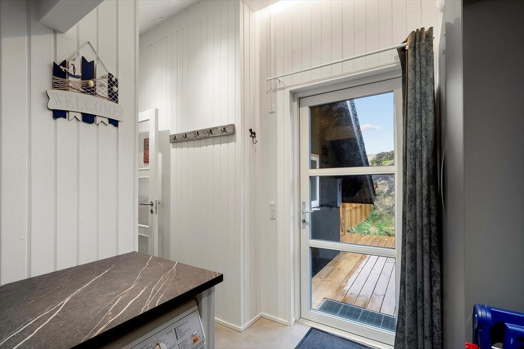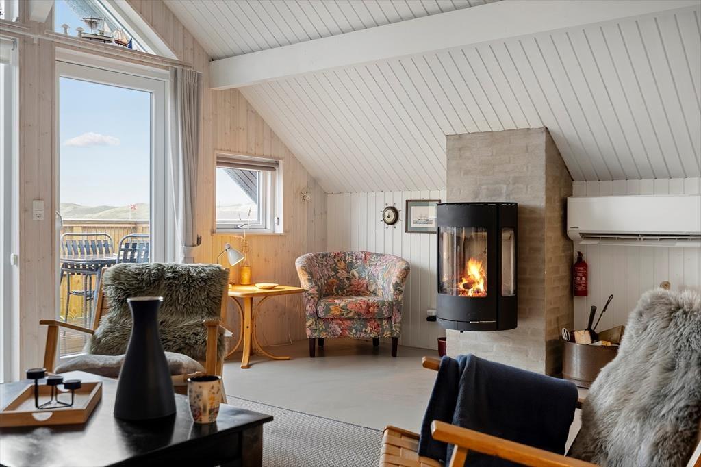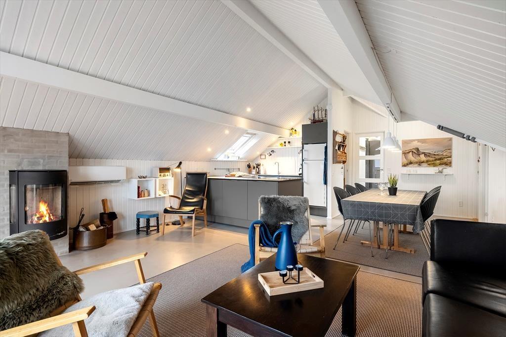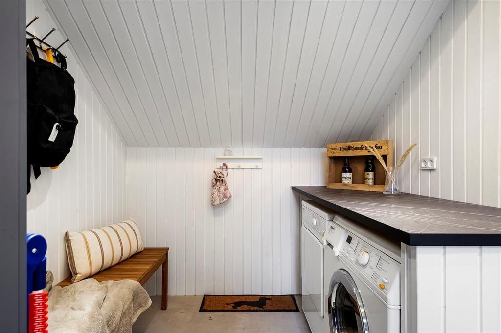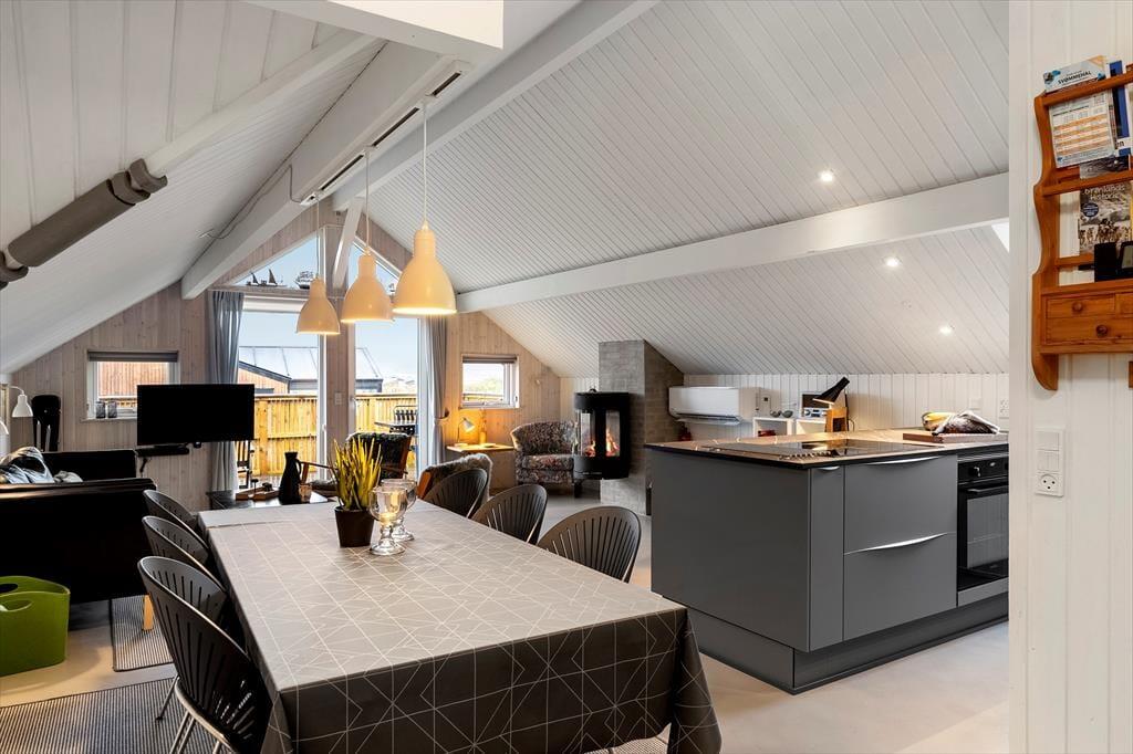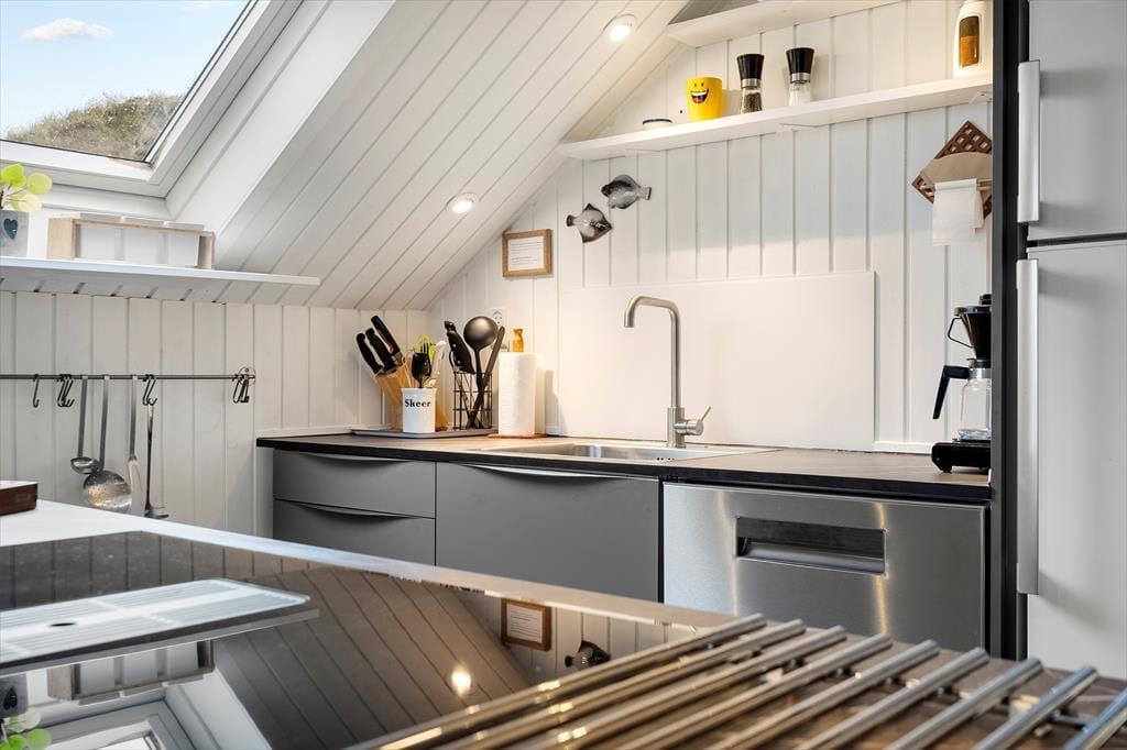 Når I træder ind, mærker I straks følelsen af nyt og veludført håndværk. Den store entre rummer både vaskemaskine og tørretumbler – praktisk efter en dag på stranden. Det moderne køkken imponerer med emhætten elegant integreret i bordet, og her er masser af plads til madlavning og hyggesnak omkring gryderne. Stuen er et sandt samlingspunkt, hvor den nye brændeovn med glas til alle sider spreder varme og skaber rolig atmosfære på kølige dage. Alt er holdt i lyse, naturlige farver, og de tre soveværelser byder på rigelig skabsplads, så I kan pakke ud og føle jer hjemme fra første dag. Her får I et sommerhus, hvor alt er tænkt til mindste detalje – både praktisk og æstetisk.