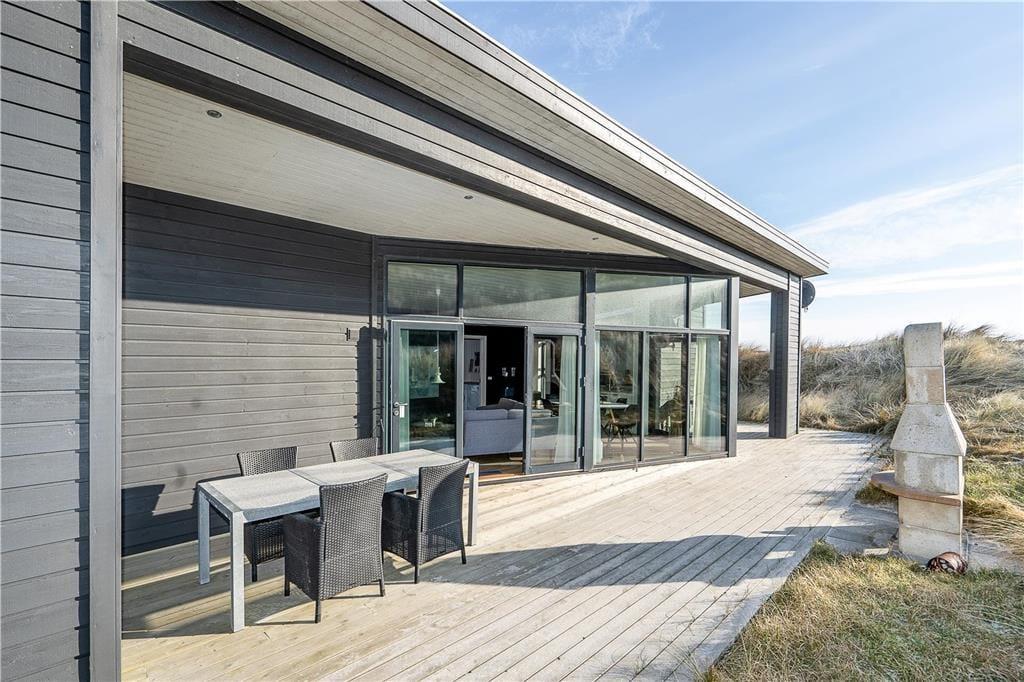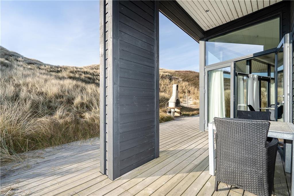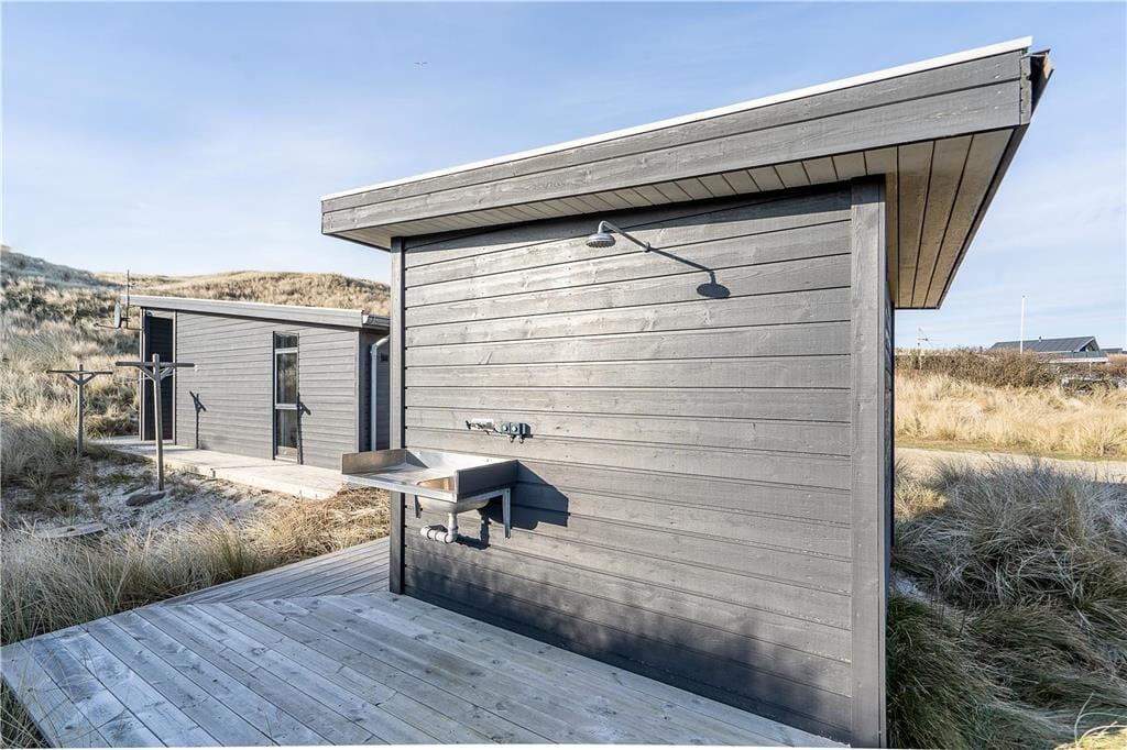 En træterrasse breder sig rundt om sommerhuset, og det gør det nemt at finde en opholdsplads med sol og læ uanset tidspunktet. En del af terrassen er overdækket, og når I sidder her og griller, har I den smukkeste udsigt til klitterne og aftenhimlens nedadgående sol. Om morgenen kan I starte dagen med et opkvikkende brusebad under udebruseren, og den kan også tages i brug, når I vender hjem fra strandturen. Har I surfet, kan I tørre våddragter og opbevare udstyr i husets opvarmede og isolerede skur. Endelig kan det nævnes, at der er udendørs fiskerensebord samt mulighed for at oplade elbilen på klitgrunden.