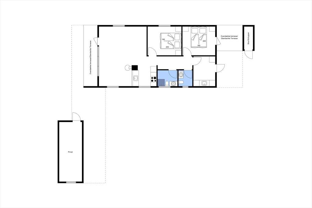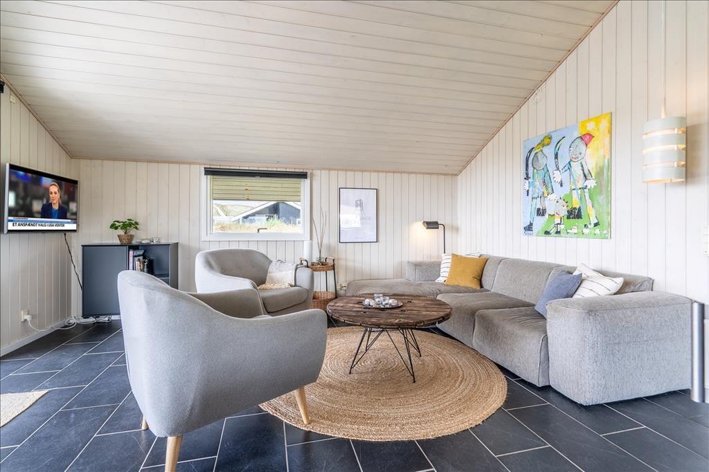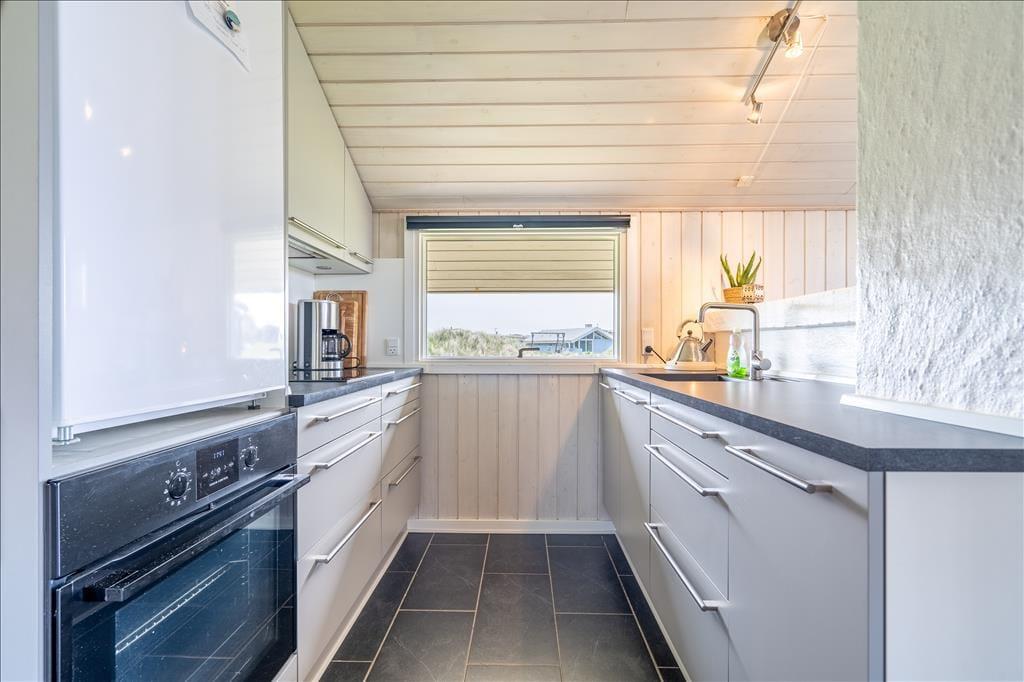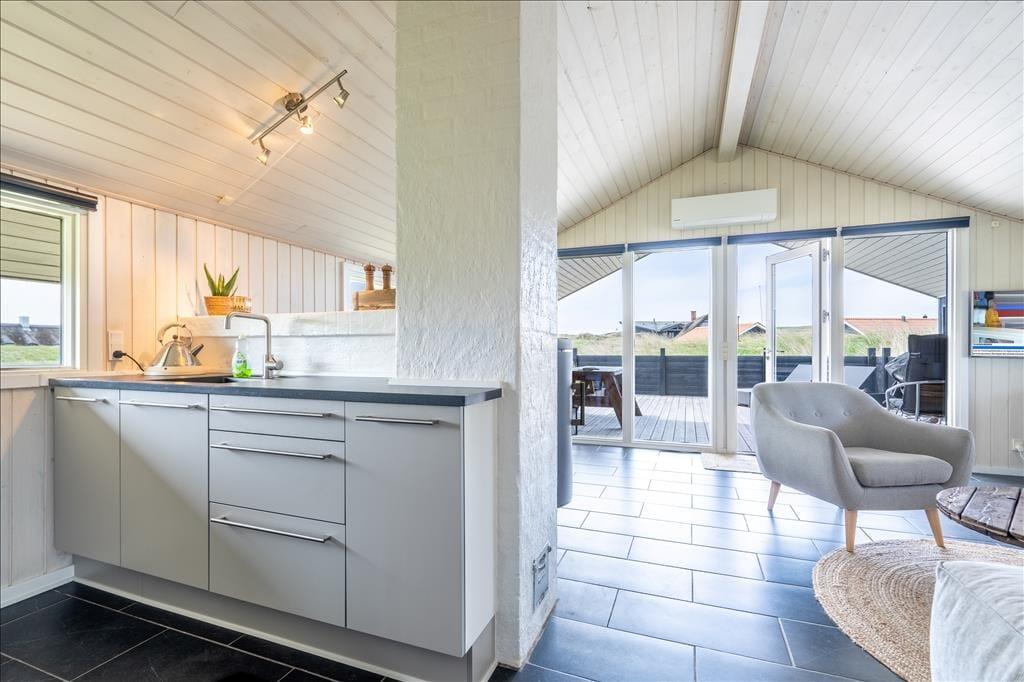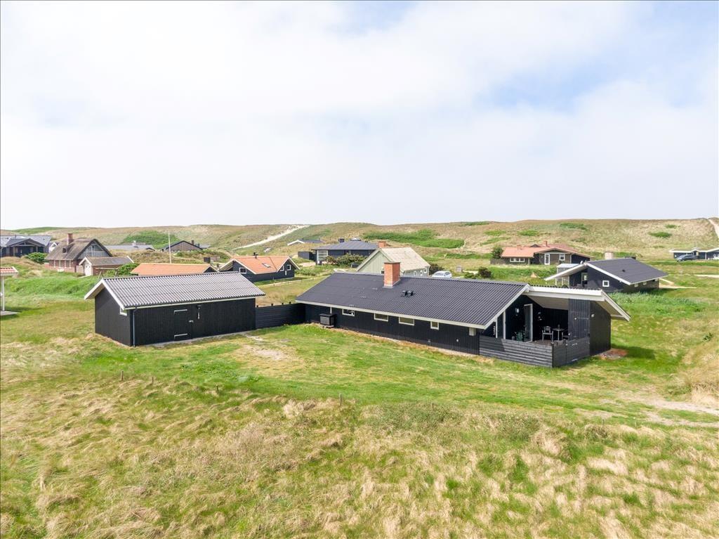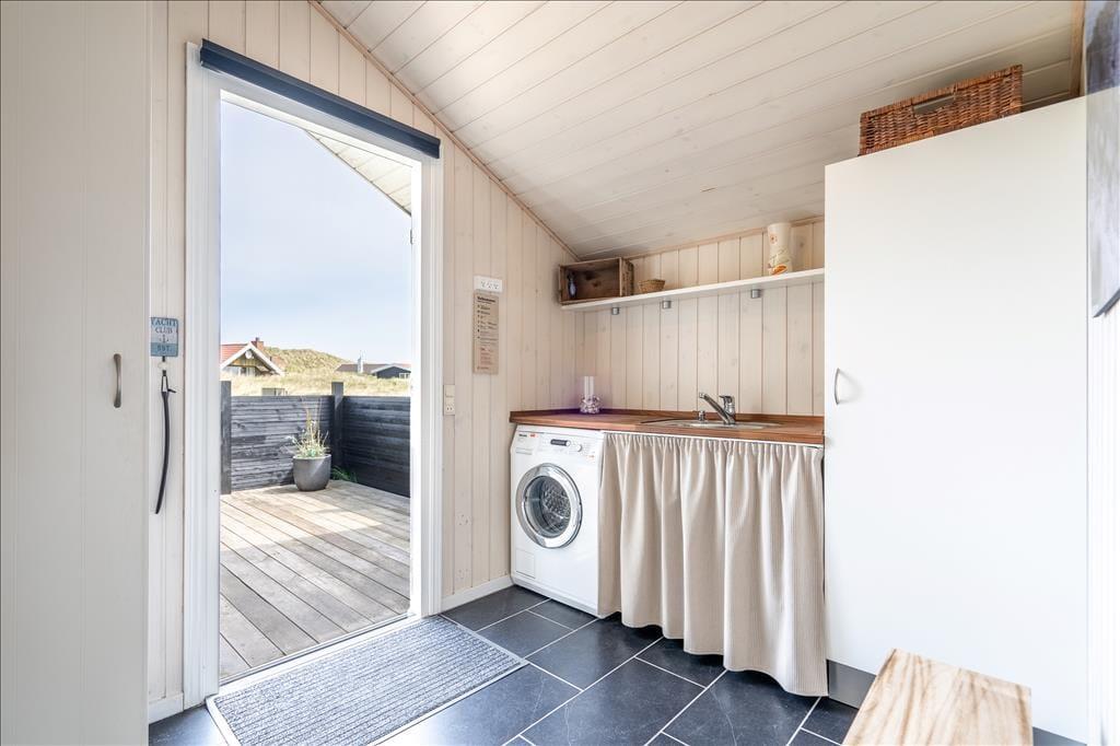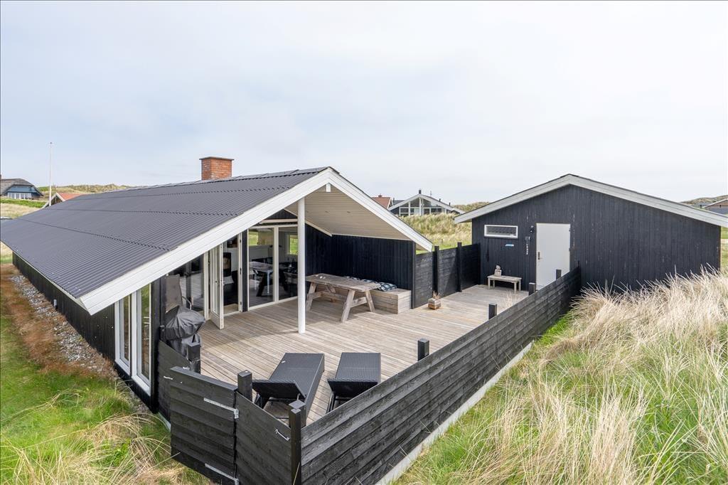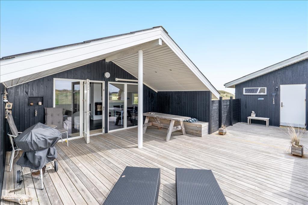 Udearealerne på den store naturgrund fungerer mindst lige så godt som husets indre. Fra stuen har I adgang til en stor og delvist overdækket terrasse, der vender mod syd. Terrassen er helt aflukket, og der er ruder i afdækningen mod vest, så I kan finde læ og samtidig nyde udsigten til klitterne. På den anden side af huset venter også en aflukket og delvist overdækket terrasse, så uanset om I vil drikke morgenkaffe i solen, have en middagslur eller grille friskfangede fisk om aftenen, kan I finde en god opholdsplads.