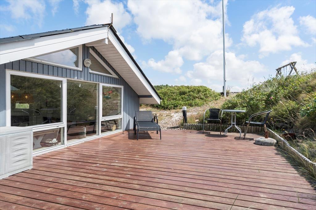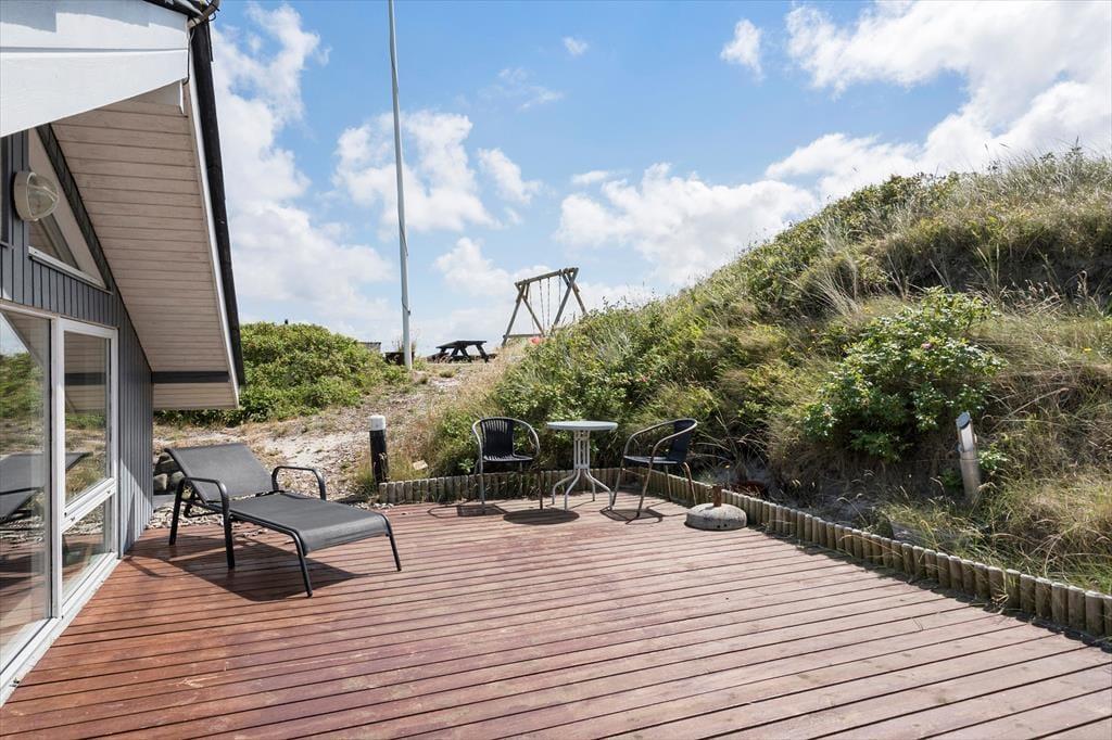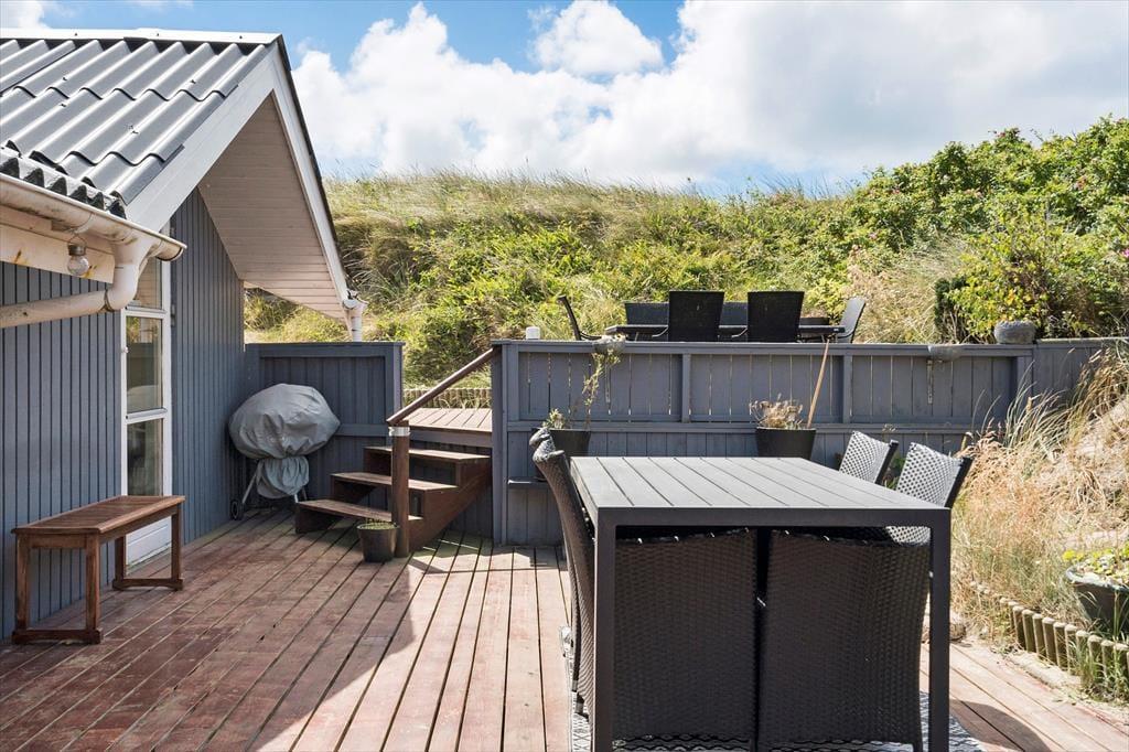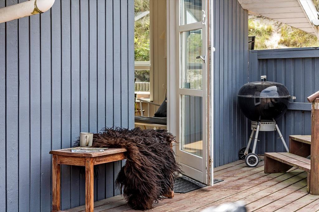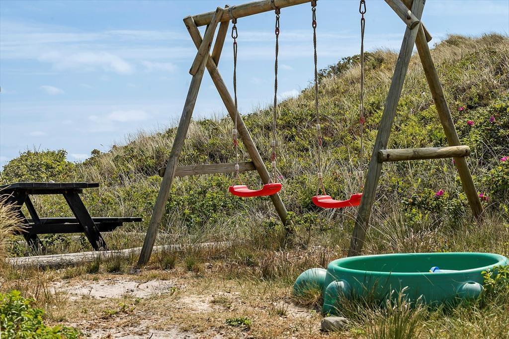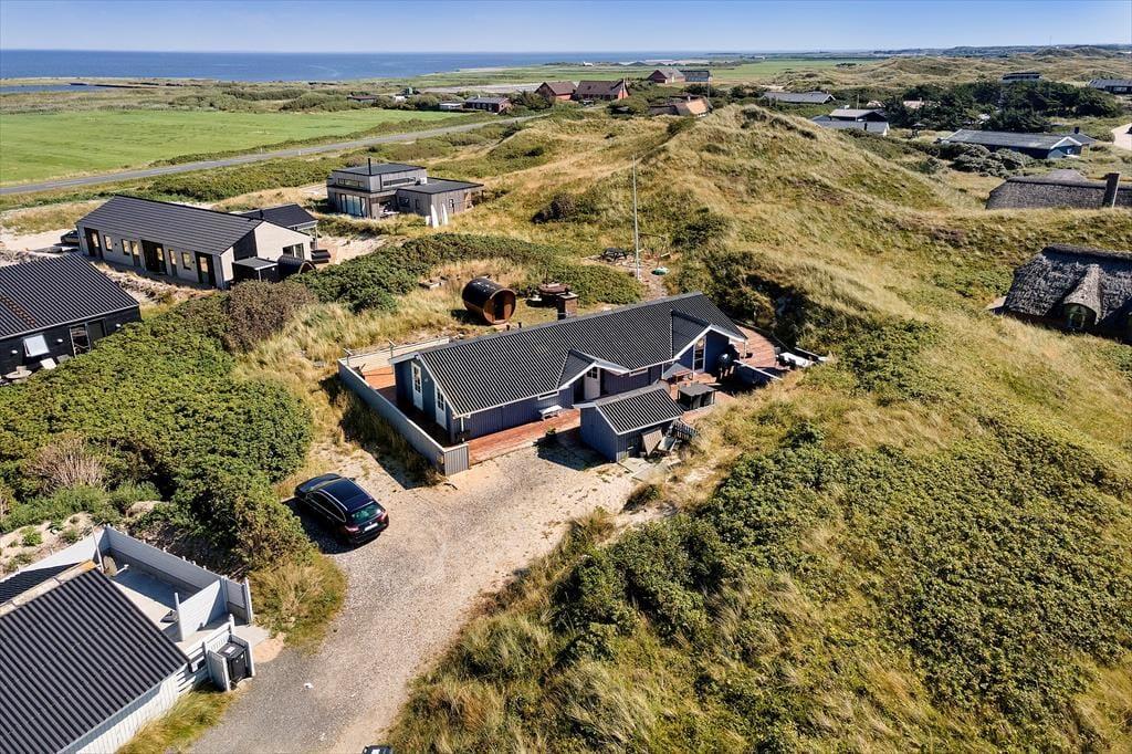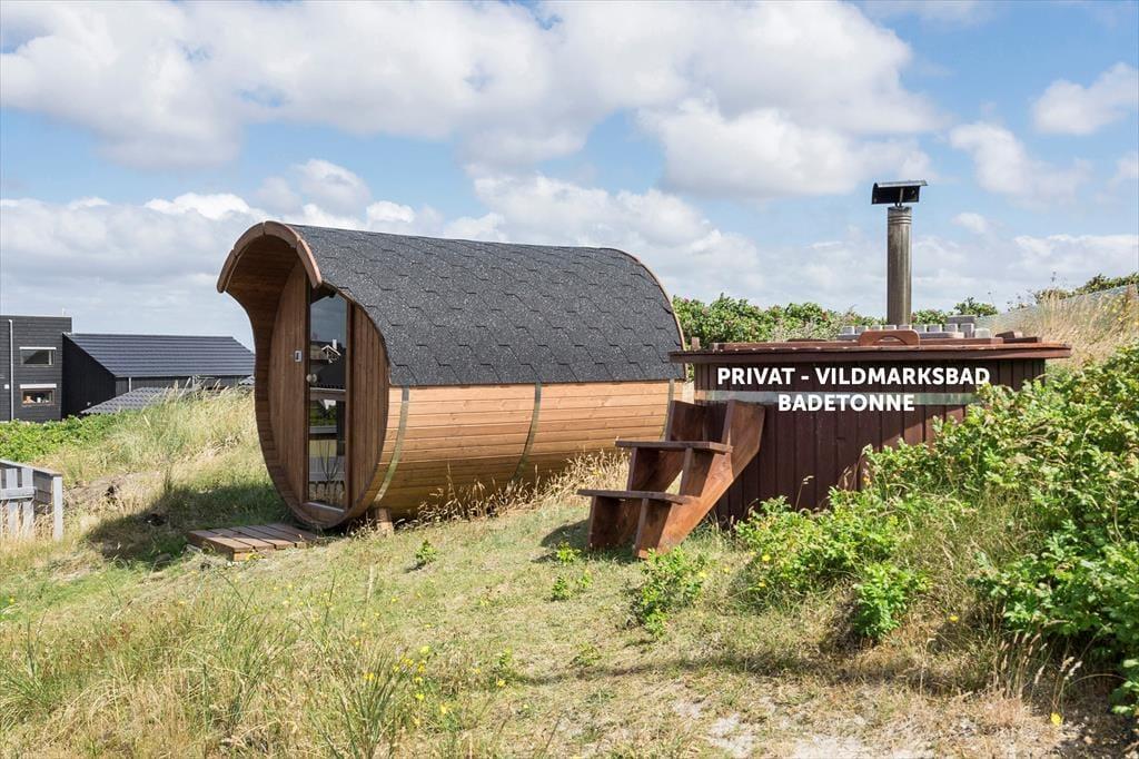 Også ude i det fri er opholdsarealerne særdeles skønne, for her finder I et herligt terrassemiljø, der er hyggeligt opdelt i flere niveauer. Nogle af terrasseområderne er skærmet af klitterne, og går I op på grundens højeste punkt, kan I nyde udsigten over landskabet helt til Ringkøbing Fjord. På klitgrunden er der desuden sandkasse og gyngestativ til børnene og en tøndesauna til hele familien. Saunaen er med til at udvide udesæsonen, for selv på en kølig og blæsende dag føles det magisk at sidde her i varmen.