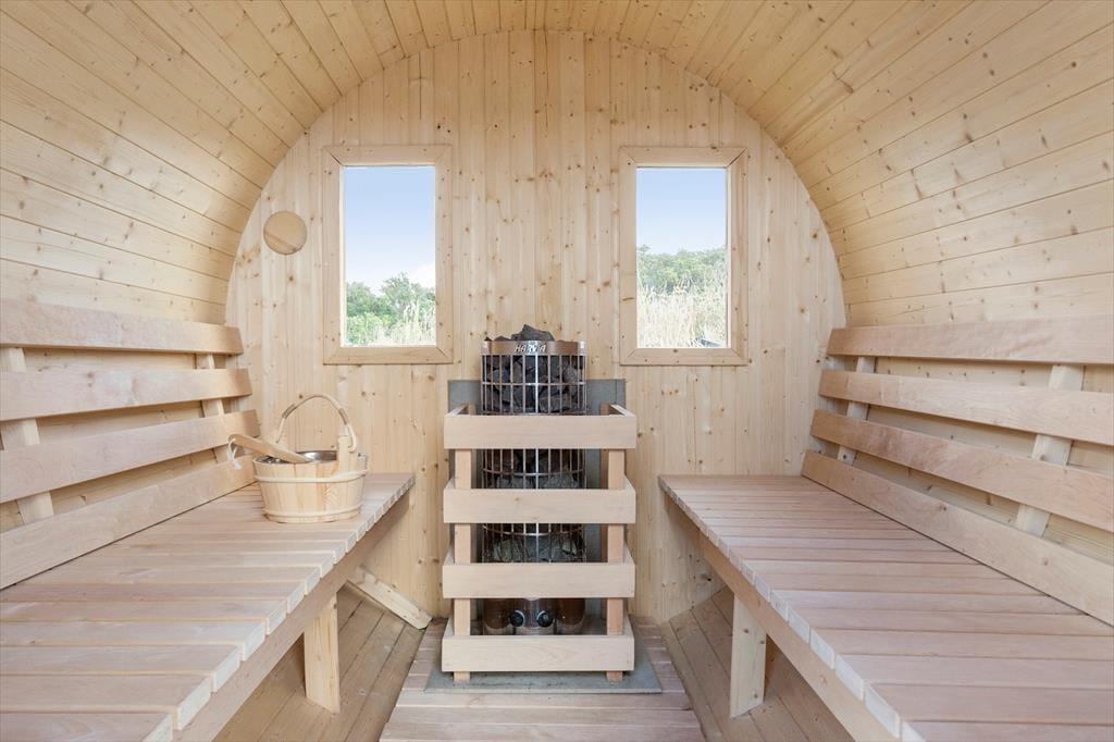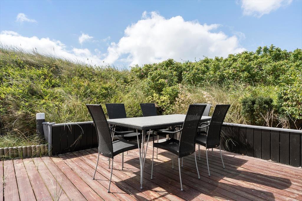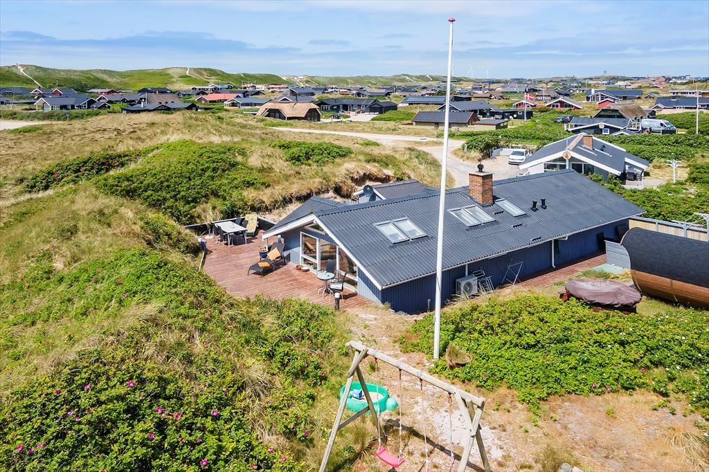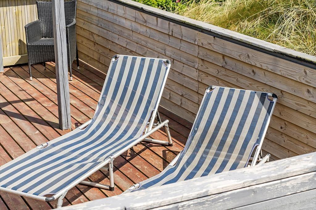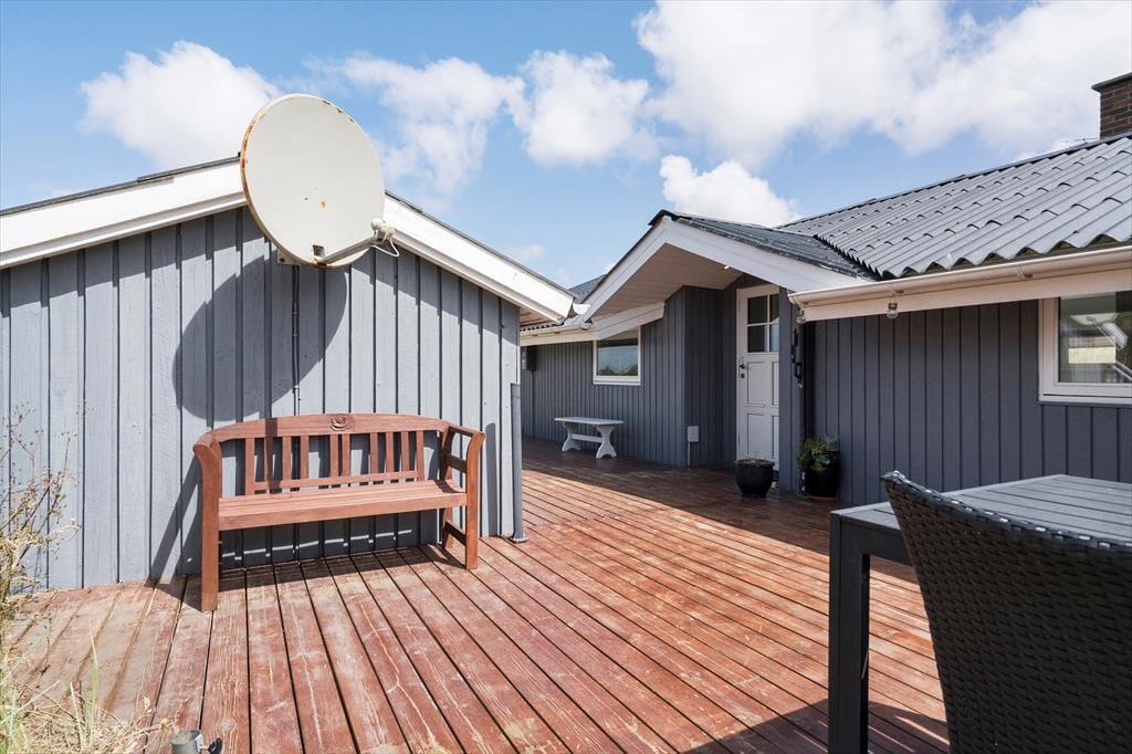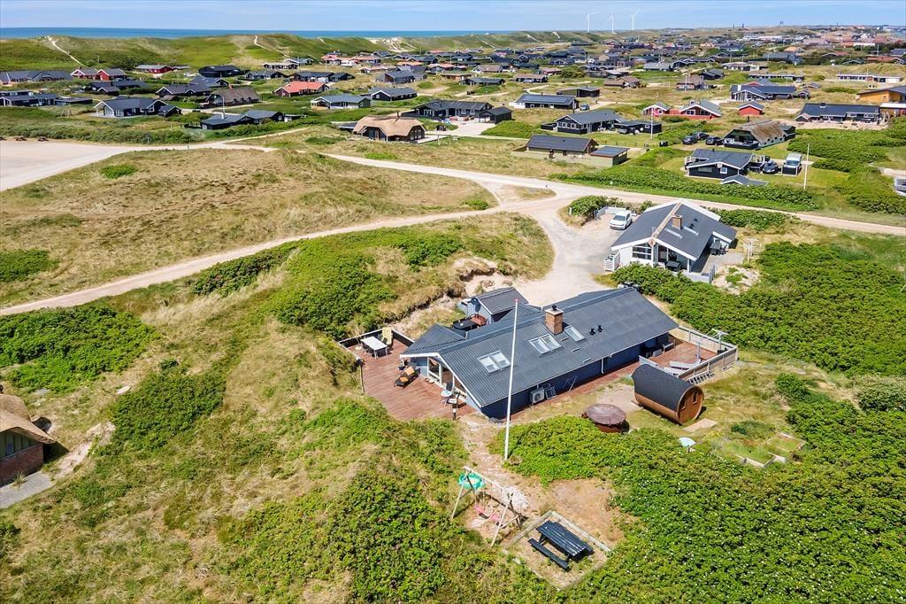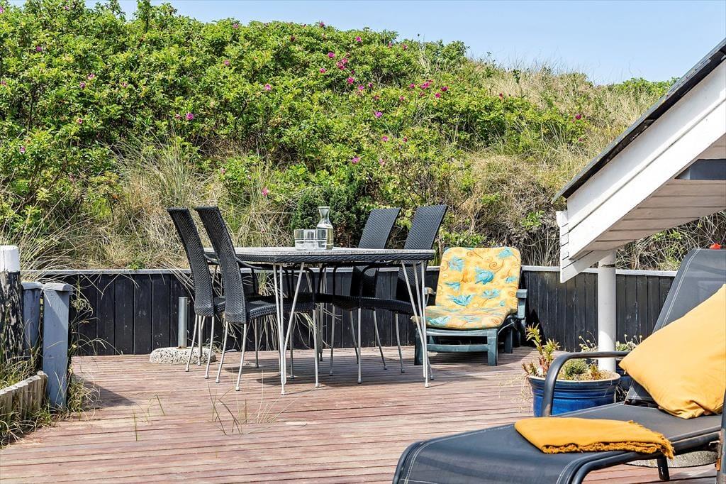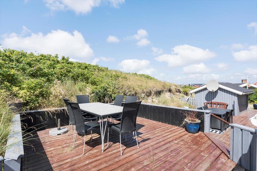 Også ude i det fri er opholdsarealerne særdeles skønne, for her finder I et herligt terrassemiljø, der er hyggeligt opdelt i flere niveauer. Nogle af terrasseområderne er skærmet af klitterne, og går I op på grundens højeste punkt, kan I nyde udsigten over landskabet helt til Ringkøbing Fjord. På klitgrunden er der desuden sandkasse og gyngestativ til børnene og en tøndesauna til hele familien. Saunaen er med til at udvide udesæsonen, for selv på en kølig og blæsende dag føles det magisk at sidde her i varmen.