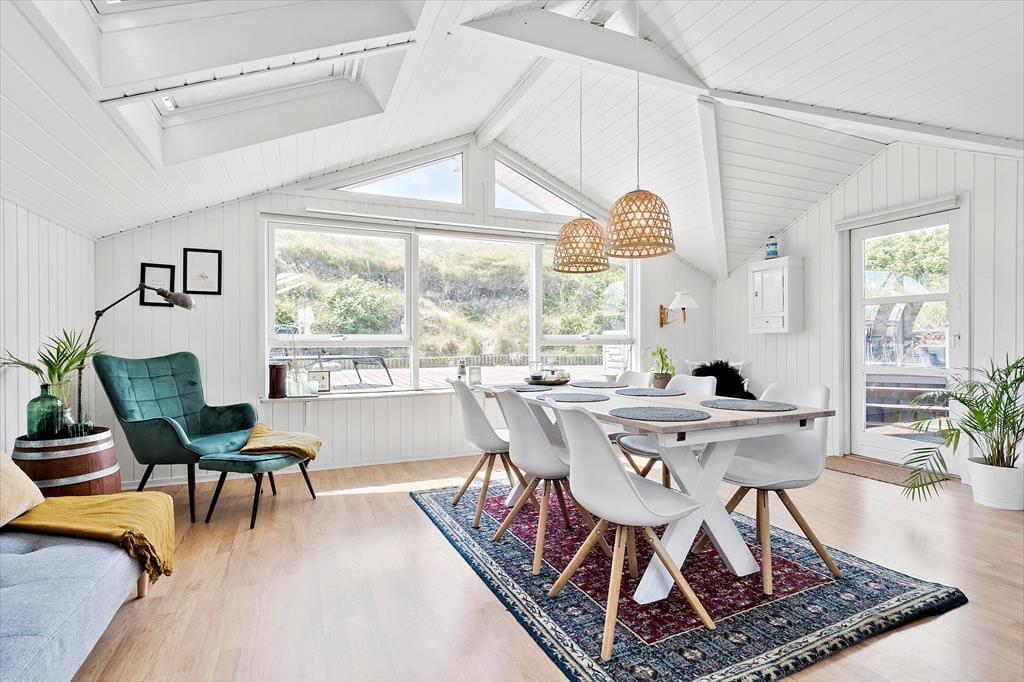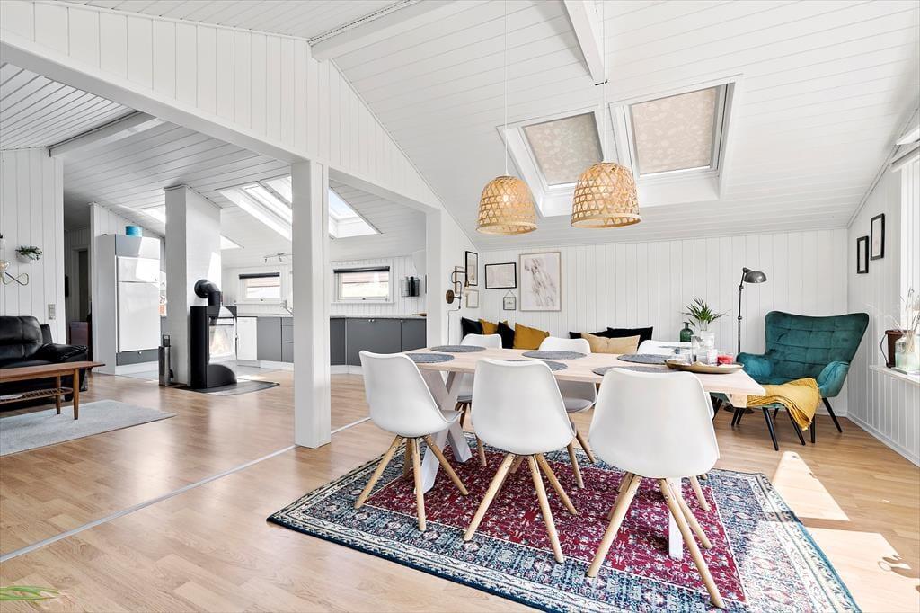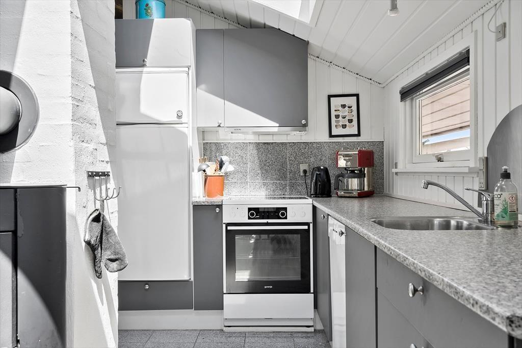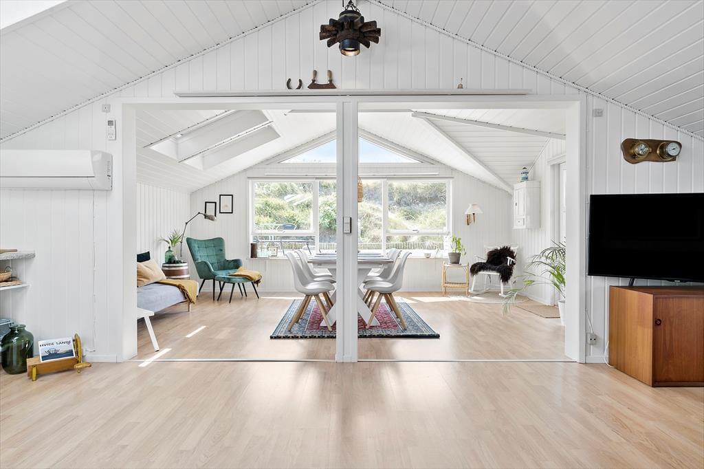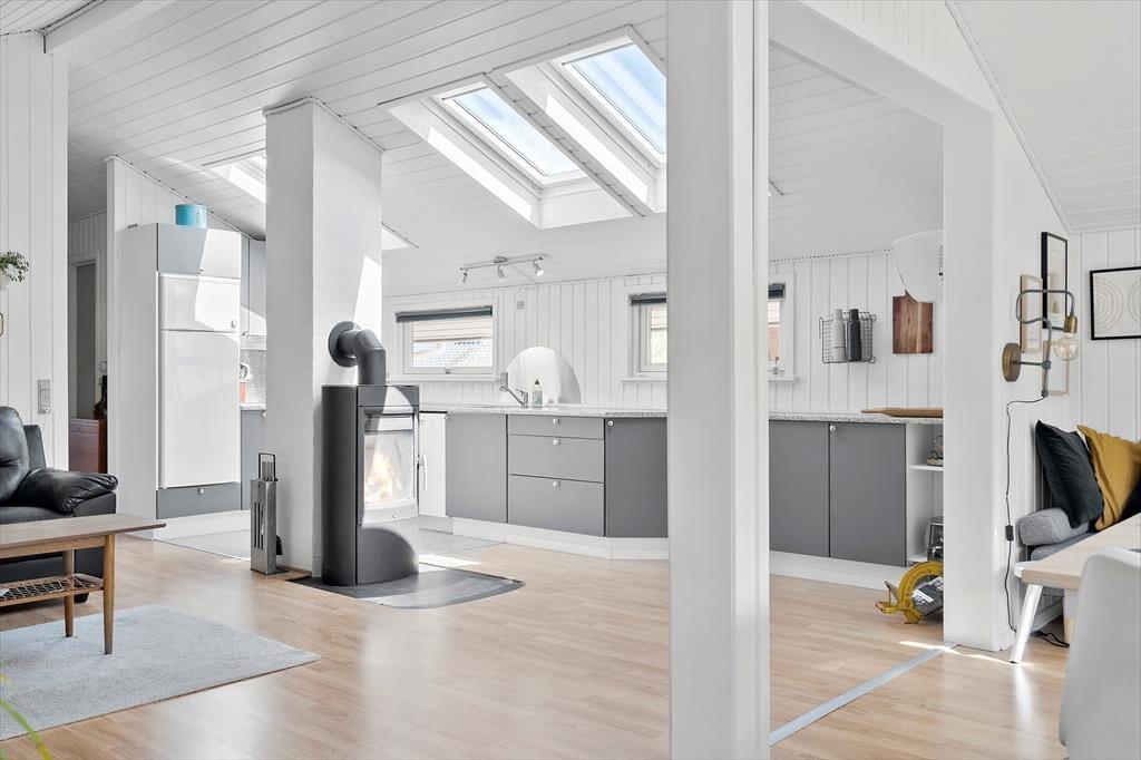 Sommerhuset er et pænt renoveret og utroligt charmerende hus med en fin planløsning til seks personer – plus to hunde, hvis de firbenede familiemedlemmer skal med på ferie. Rummene er lyse og indbydende, og mon ikke I straks kan mærke roen sænke sig, når I træder ind i stuen for første gang. Feriefornemmelsen er i hvert fald i top i opholdsrummet, der har brændeovn, varmepumpe og komfortabelt møblement. Køkkenet ligger for øvrigt som en integreret del af opholdsrummet, så selvom der skal laves mad, behøver I ikke at opdele jer i madlavnings- og sofahyggehold, men kan sagtens småsnakke på tværs af rummet. Planløsningen byder desuden på et pænt badeværelse med bruser og vaskemaskine samt tre gode soveværelser, hvoraf to er med dobbeltseng og det tredje med to enkeltsenge.