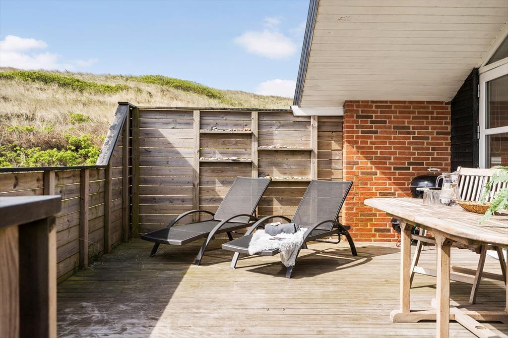 Ude i det fri kan børnene gynge og boltre sig på naturgrunden, der grænser lige op mod de høje klitter. Indbyder vejret til at spise frokost under åben himmel, kan I dække op i solen på det store terrassemiljø, der breder sig mod øst og syd. En mindre del af terrassen er overdækket, og hegn og havelåger lukker opholdsmiljøet helt af, hvilket småbørnsforældre og hundeejere sikkert kan blive glade for. Ved huset er der mulighed for at oplade elbilen, hvis I blot medbringer et kabel.