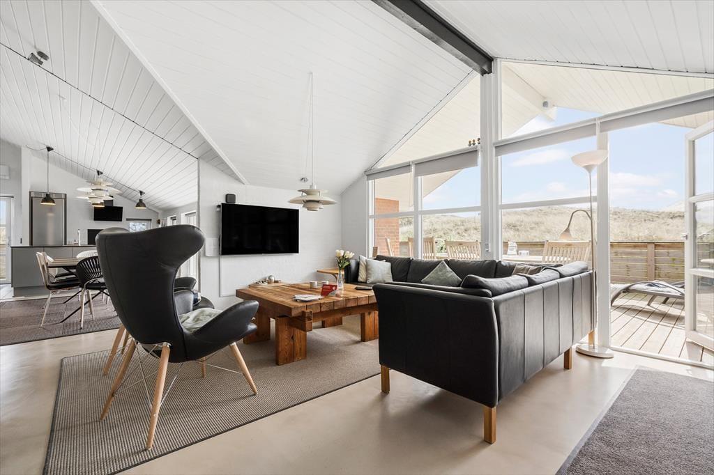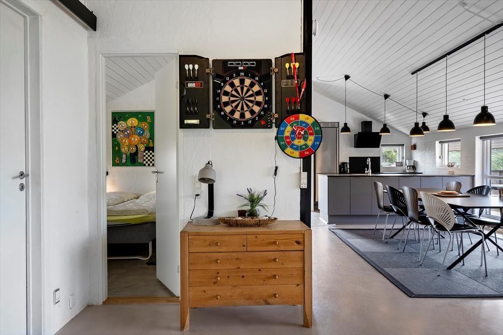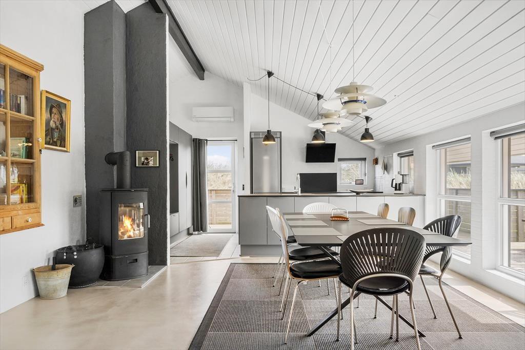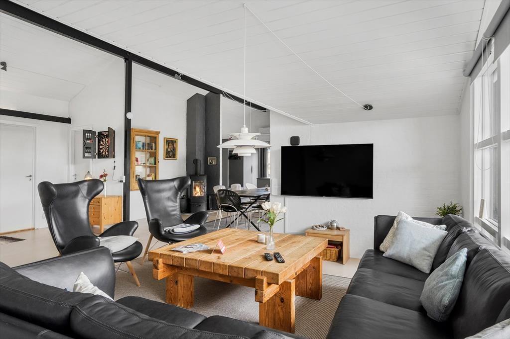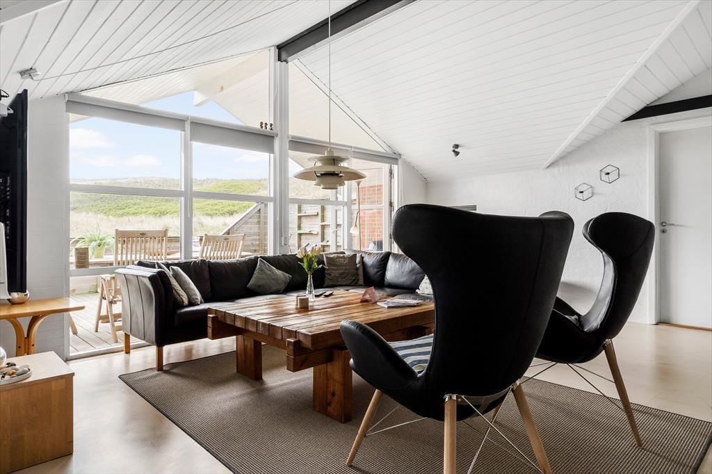 Inden døre får I 130 m2 at brede jer på, og de mange kvadratmeter er godt udnyttet, så I nemt og bekvemt kan være otte personer. Fire soveværelser er ligeligt fordelt i begge ender af sommerhuset, og med to badeværelser slipper I for at stå i kø for at få et morgenbrusebad. Fra det ene badeværelse har I endda adgang til en sauna, og hvis I trænger til afslapning og selvomsorg, er det perfekt med en tilbagelænet pause i varmen. De sociale hyggestunder kan oplagt foregå i opholdsafdelingen, hvor køkken-alrum og stue er forbundet. Vinduerne giver jer udsigt til det flotte klitlandskab og sørger for et fint lysindfald i løbet af dagen, og om aftenen kan I skrue op for hyggestemningen ved at tænde op i brændeovnen og sætte en god film på fladskærmen. Stuen byder for øvrigt på både bordfodbold og dart, så både børn og voksne kan se frem til mange timers sjov og underholdning.