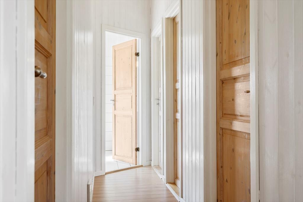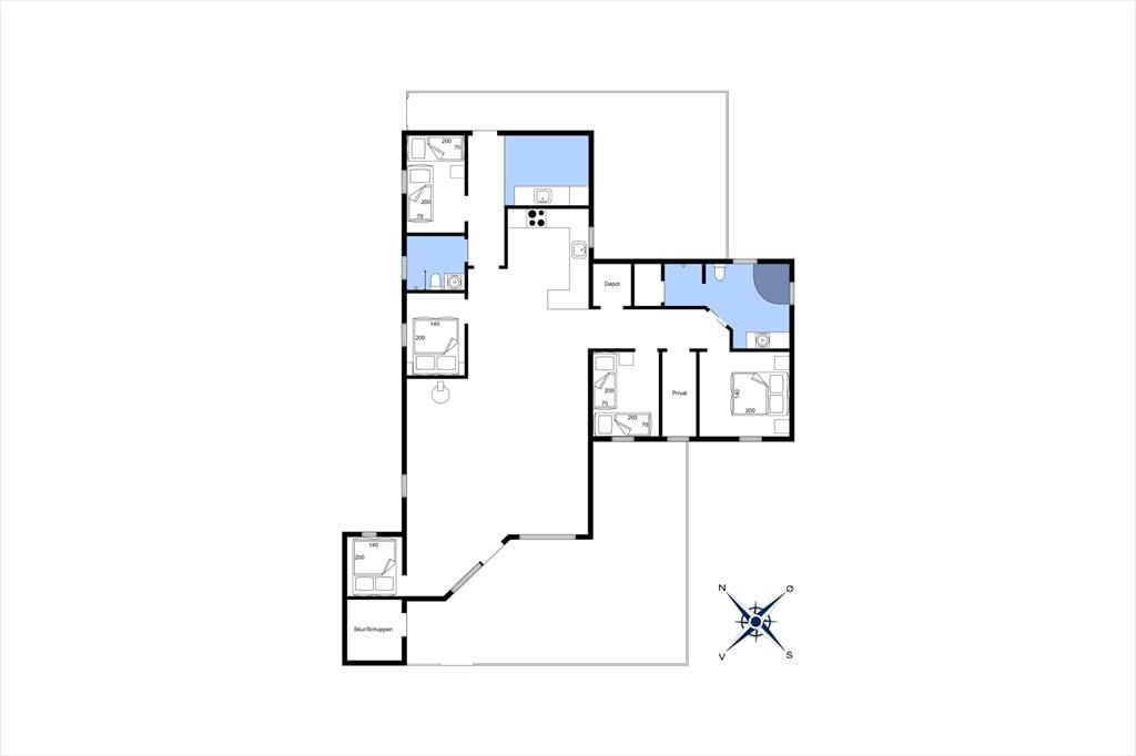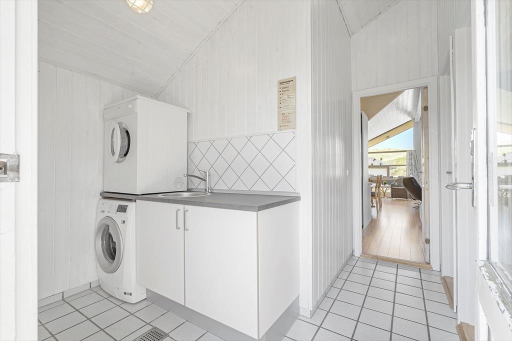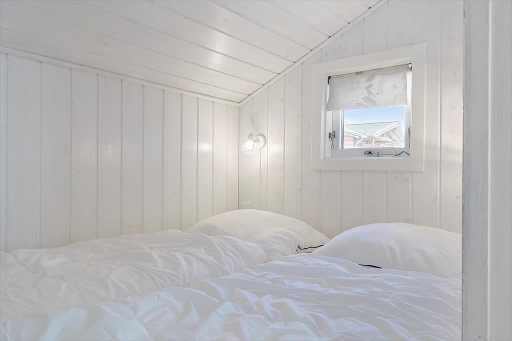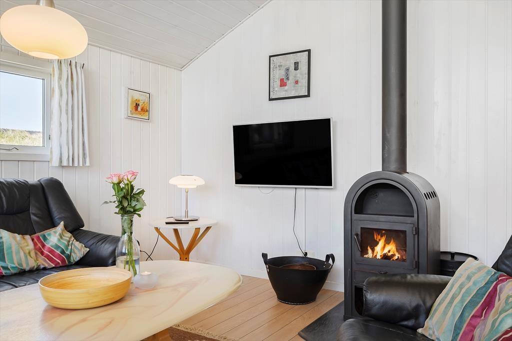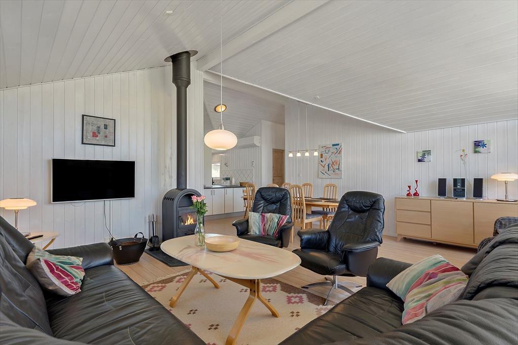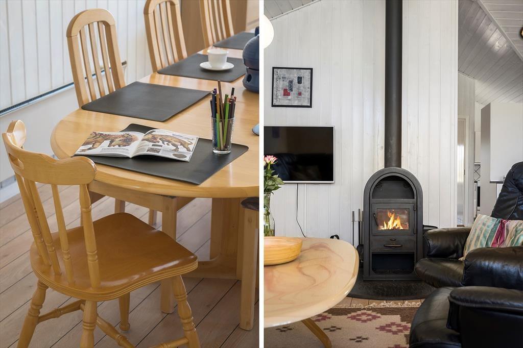 I det 115 m2 store sommerhus er der sovepladser til 10 personer. To personer kan overnatte i stuens alkove, mens resten kan finde sig til rette på de fire soveværelser, så huset egner sig godt til otte voksne og to børn. I løbet af dagen fungerer alkoven også som en god krog, hvor børnene kan sidde med tegneserier og mobilspil, mens de voksne hyggesnakker i sofaafdelingen eller sidder længe ved spisebordet efter frokosten. I stuen er der brændeovn og fladskærms-tv, og den åbne forbindelse til køkkenet gør det let at kalde på forstærkning, når der skal dækkes bord inden næste måltid. Et rummeligt bryggers byder på vaskemaskine og tørretumbler, og på det største af husets to badeværelser kan I forkæle jer selv med et varmt spabad og en tur i sauna.