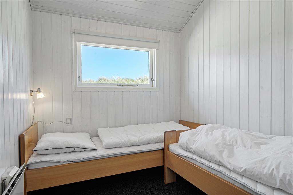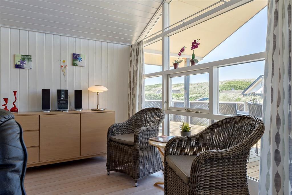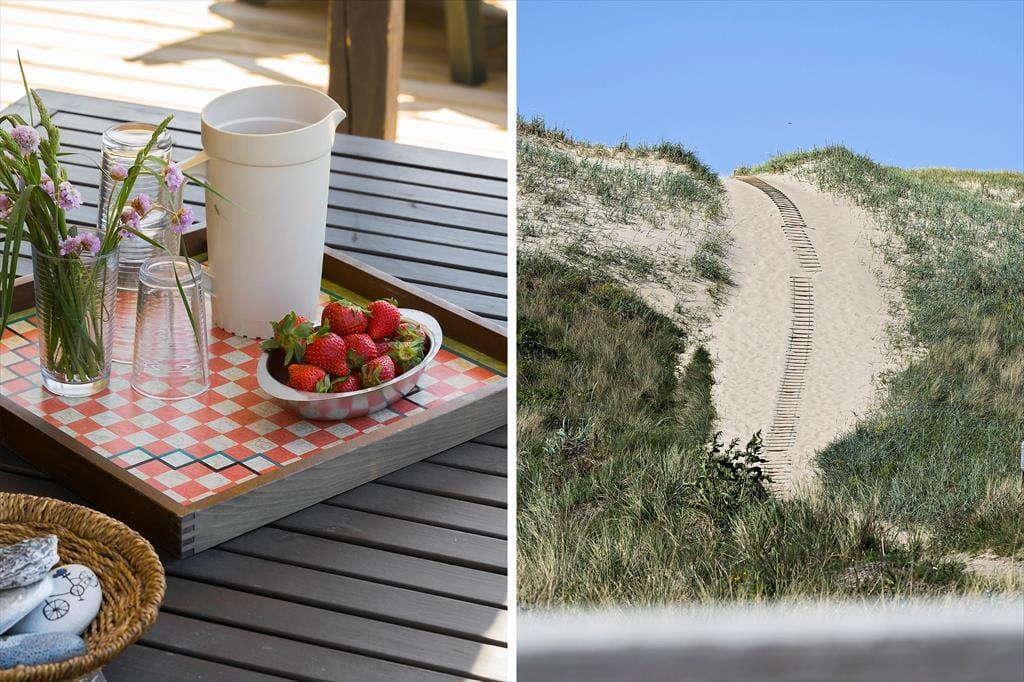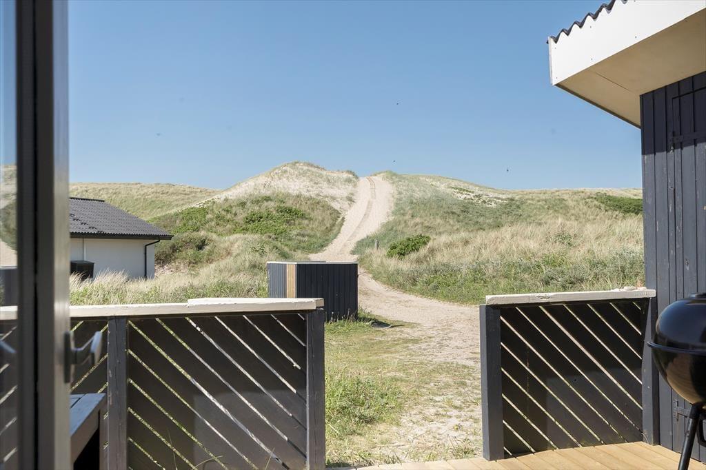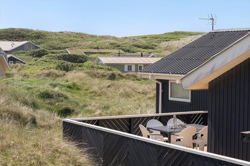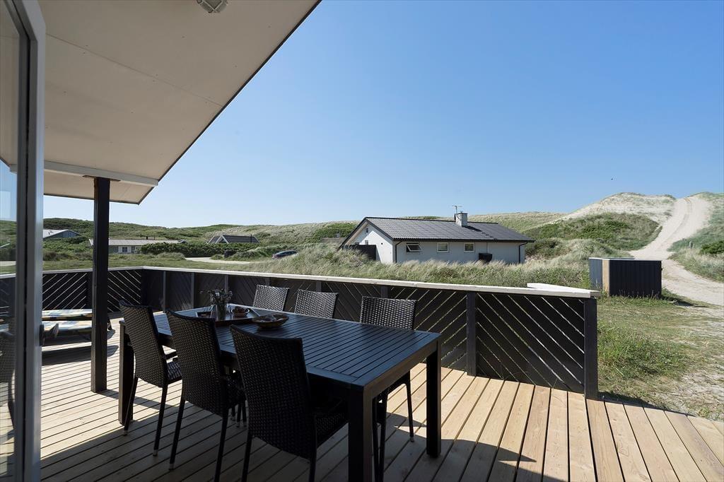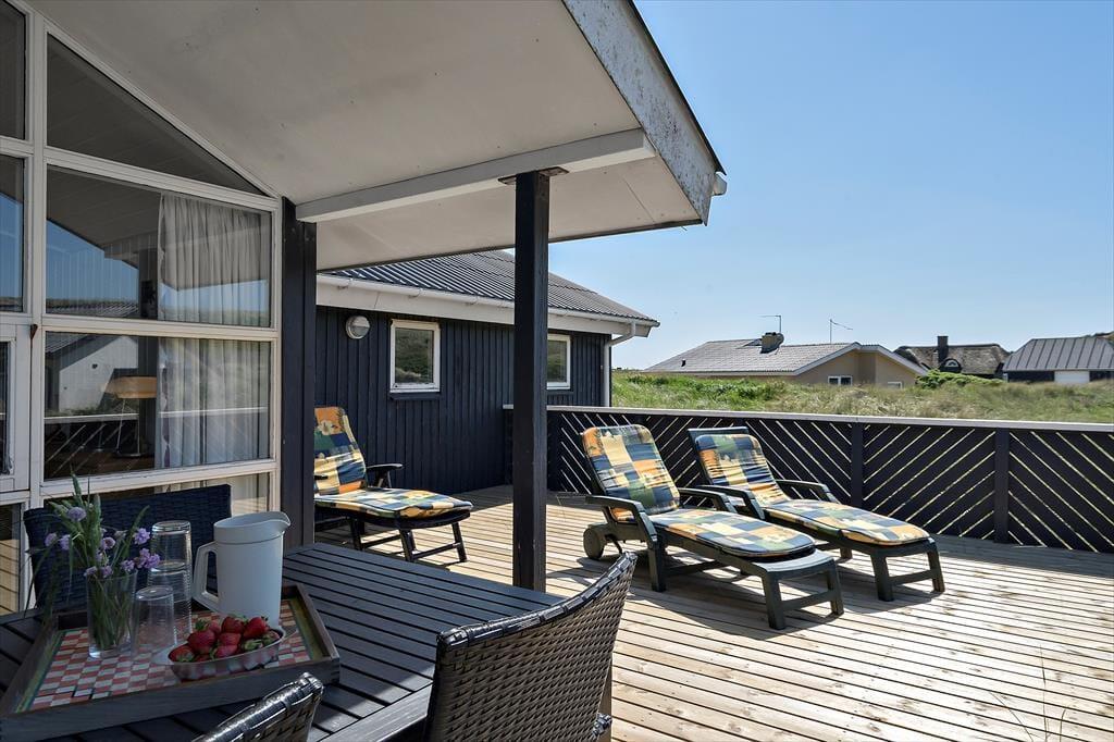 Sommerhuset byder på to gode terrasseområder, der begge skærmes af hegn. Mod øst kan I sidde i dagens første solstråler på den helt åbne terrasse, mens den delvist overdækkede vestterrasse har udsigt til solnedgangen og de høje klitter, der rejser sig bare 100 meter fra huset.