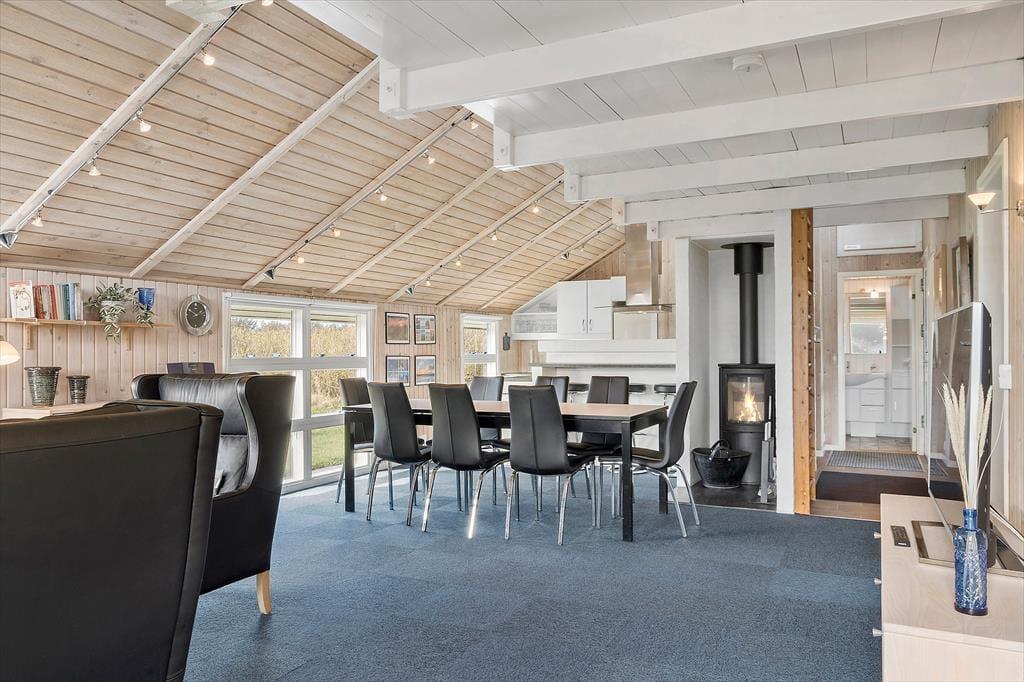 Her på Tingodden 260 finder I et pænt træhus til otte personer, og det har tilmed en spændende arkitektur med flot loftshøjde og godt lysindfald i stuen. Atmosfæren er lys og venlig, så man bliver hurtigt fristet til at slænge sig i sofaen eller samles ved spisebordet for at spille kort – og børnene vil måske hurtigt kravle op på hemsen for at lege. I stuen er der brændeovn og fladskærms-tv med Chromecast, og i den ene ende af rummet ligger et godt køkken med opvaskemaskine, mikroovn og andre gode hvidevarer. Mod øst ligger fire soveværelser side om side, og sommerhuset byder også på et rummeligt badeværelse med bruser, gulvvarme, vaskemaskine og tørretumbler.