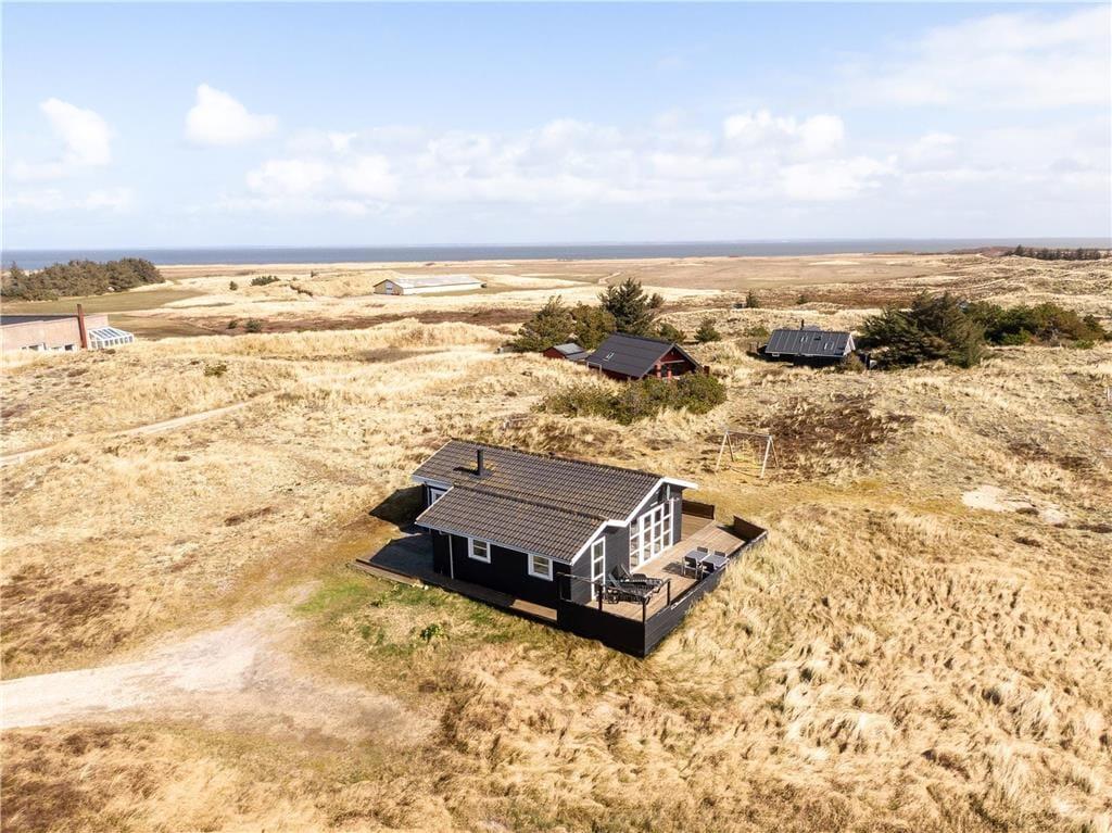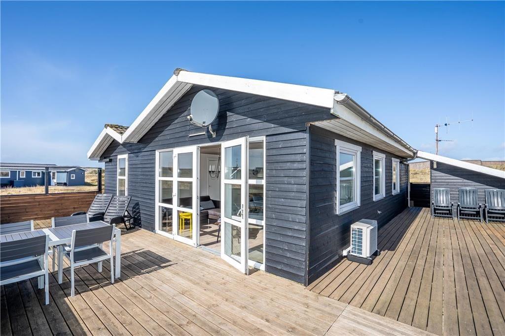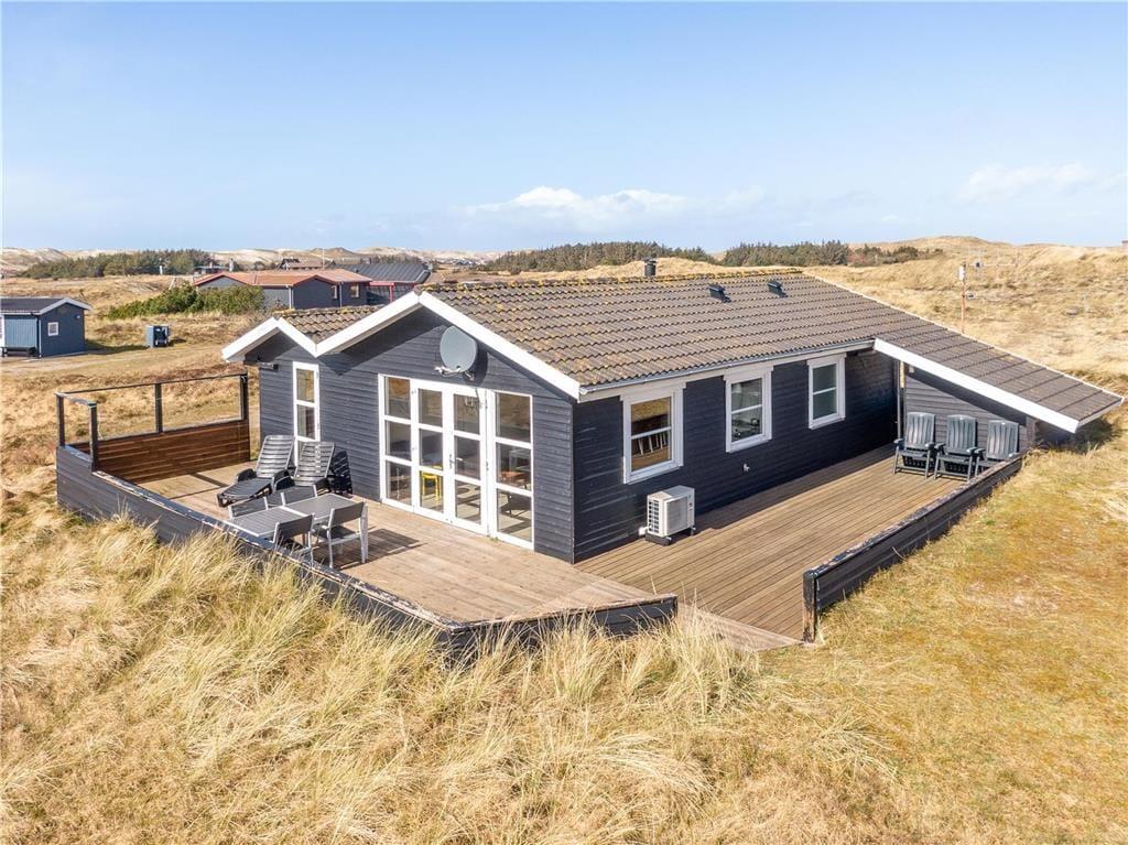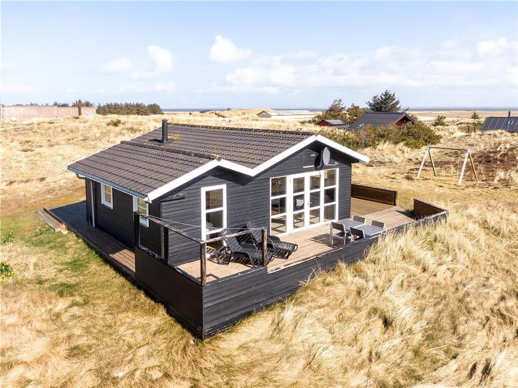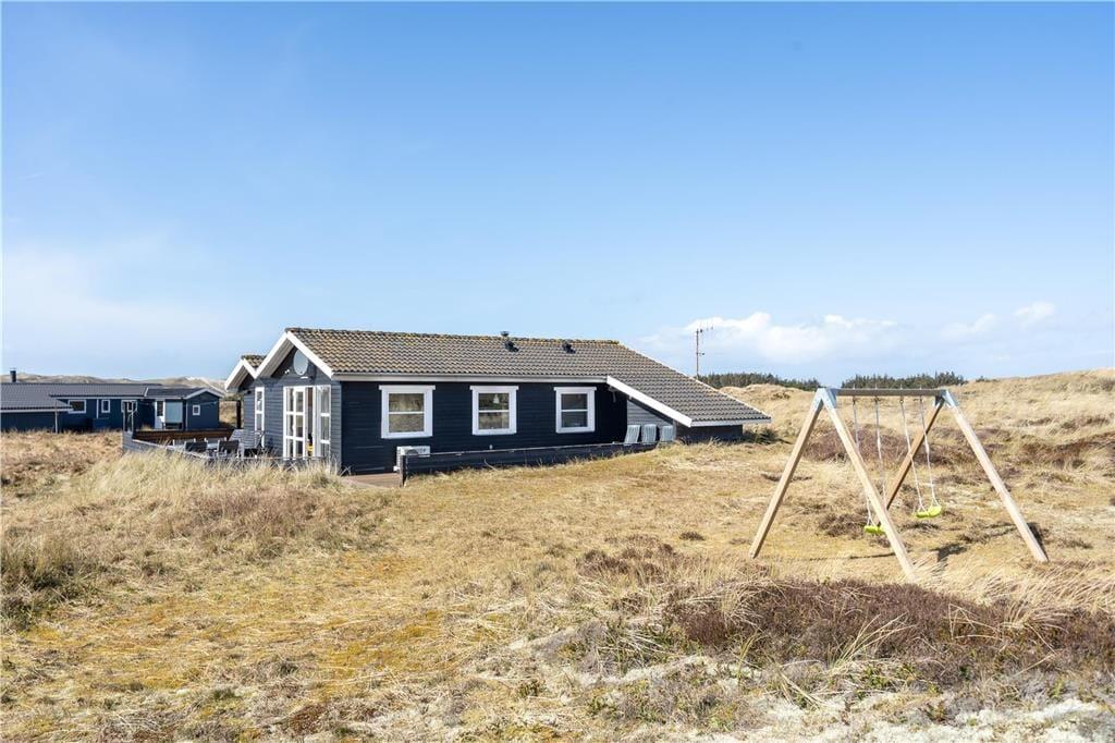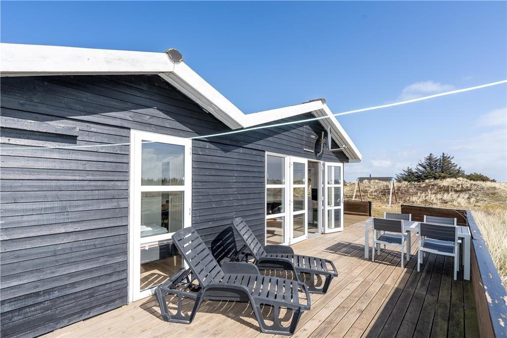 En dejlig træterrasse breder sig rundt om sommerhuset, så I får nemt ved at finde den helt rette opholdsplads uanset tidspunktet. Mod syd skærmes en del af terrassen af, og derfor kan I stadig sole jer, selvom der skulle komme en brise fra vest. Det er skønt at slappe af i så smukke naturomgivelser, ikke mindst om aftenen, når den nedadgående sol ændrer klitlandskabets farvetoner. I løbet af dagen kan børnene gynge og lege i sandkassen, hvis ikke I begiver jer ud på eventyr i Aargab og omegn.