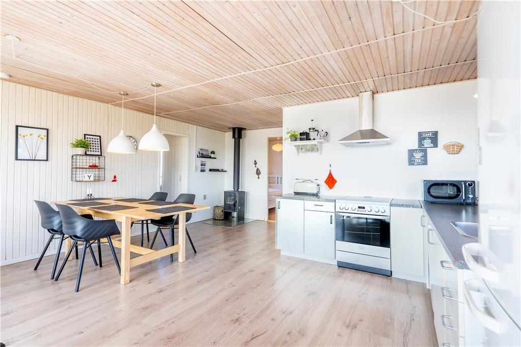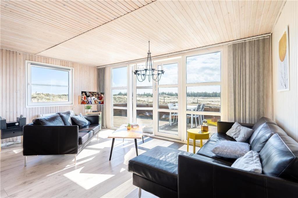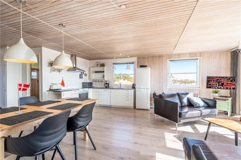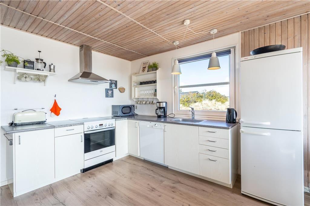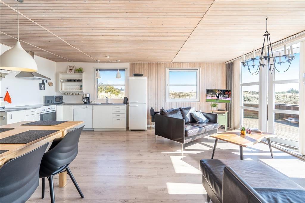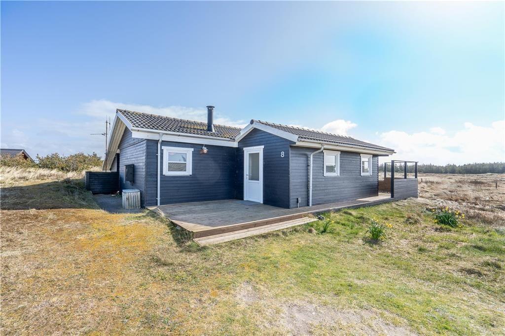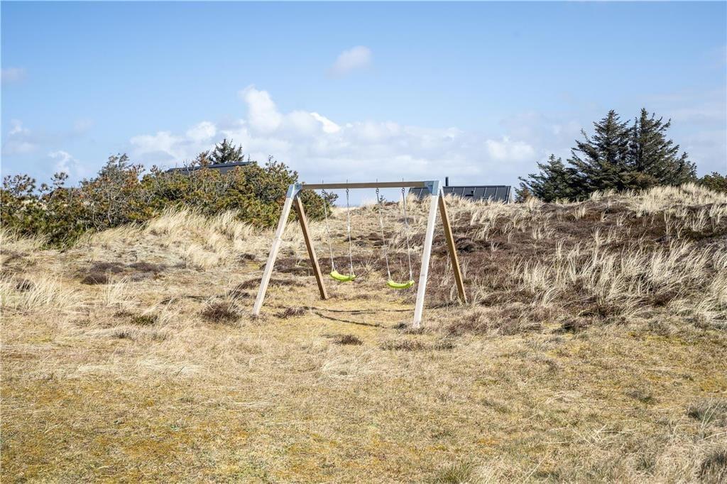 En dejlig træterrasse breder sig rundt om sommerhuset, så I får nemt ved at finde den helt rette opholdsplads uanset tidspunktet. Mod syd skærmes en del af terrassen af, og derfor kan I stadig sole jer, selvom der skulle komme en brise fra vest. Det er skønt at slappe af i så smukke naturomgivelser, ikke mindst om aftenen, når den nedadgående sol ændrer klitlandskabets farvetoner. I løbet af dagen kan børnene gynge og lege i sandkassen, hvis ikke I begiver jer ud på eventyr i Aargab og omegn.