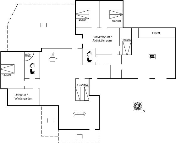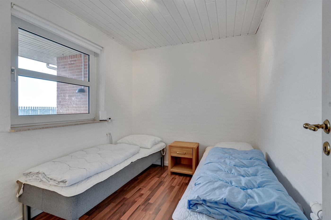 Der er i alt 5 soveværelser. Sovepladserne fordeler sig på: 6 sovepladser i dobbeltsenge. 4 sovepladser i enkeltsenge. Derudover er der 1 stk. barneseng.
