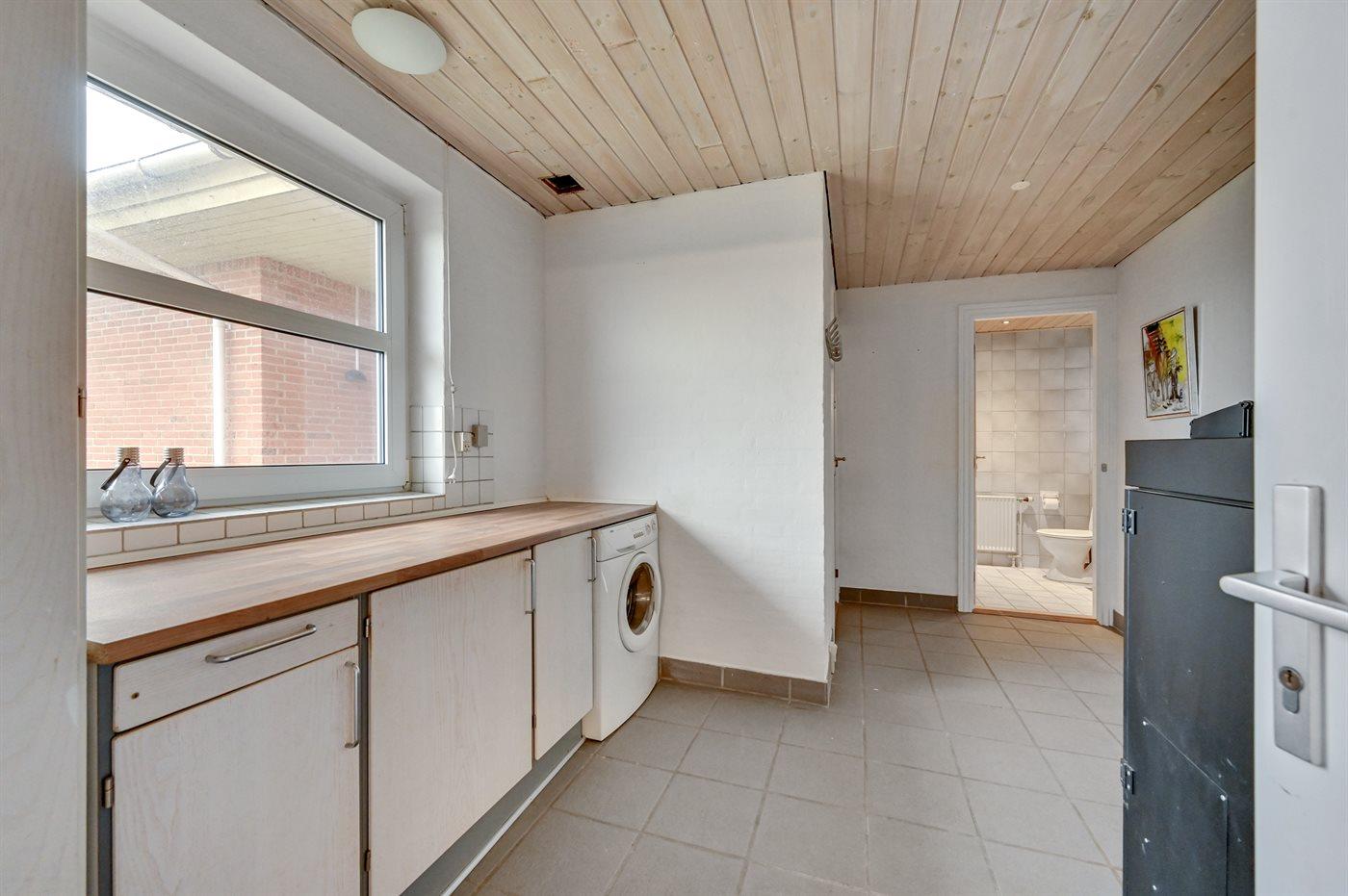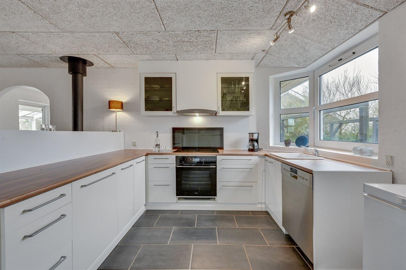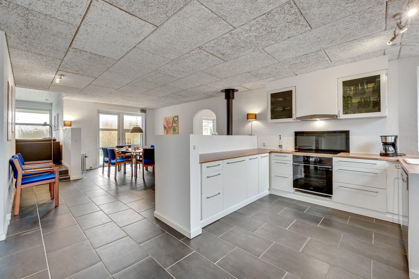 Køkkenet er udstyret med 1 køleskab. Der er 4 keramiske kogeplader, varmluftovn, mikrobølgeovn samt opvaskemaskine Der er gulvvarme i køkkenet.