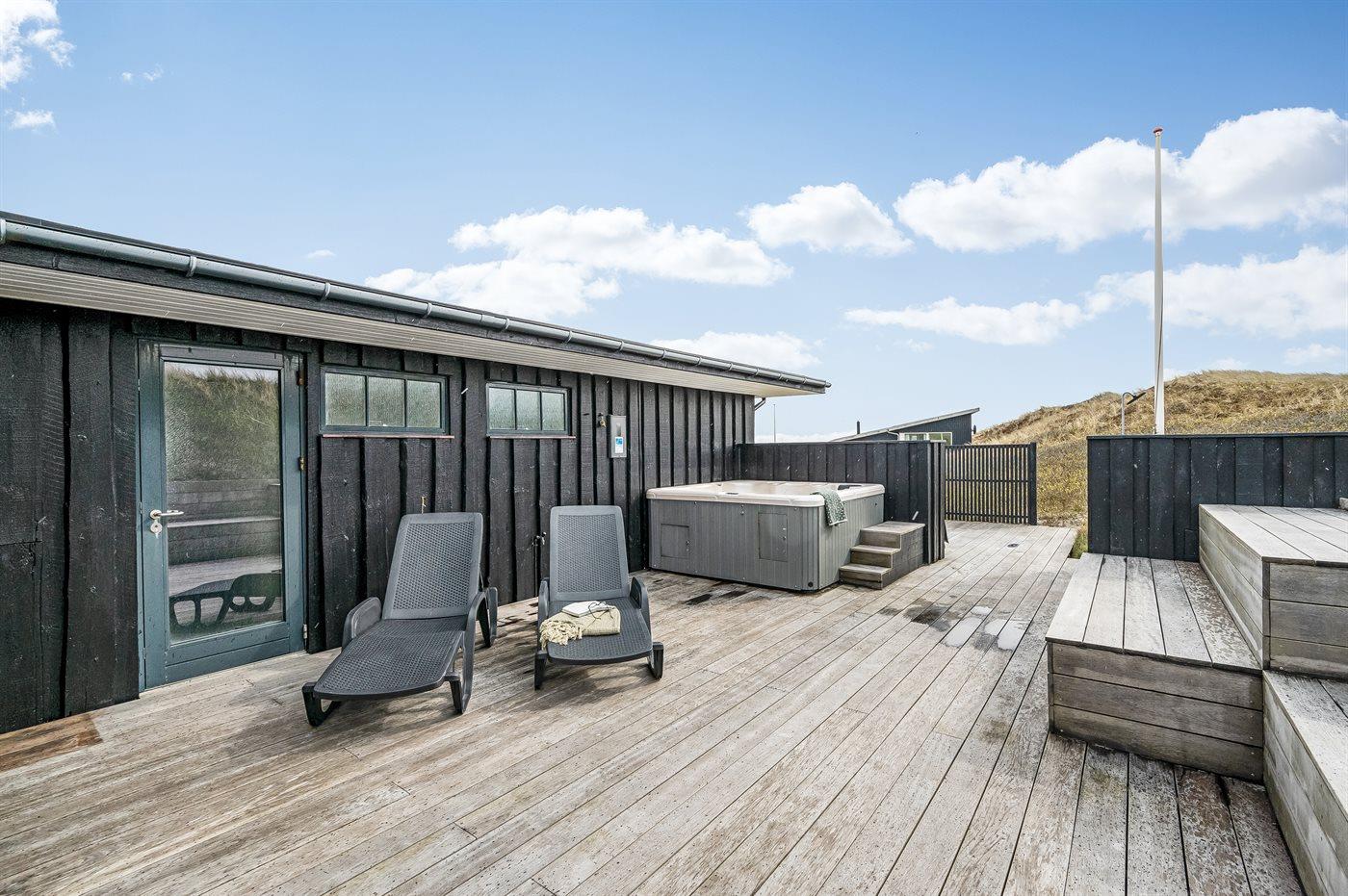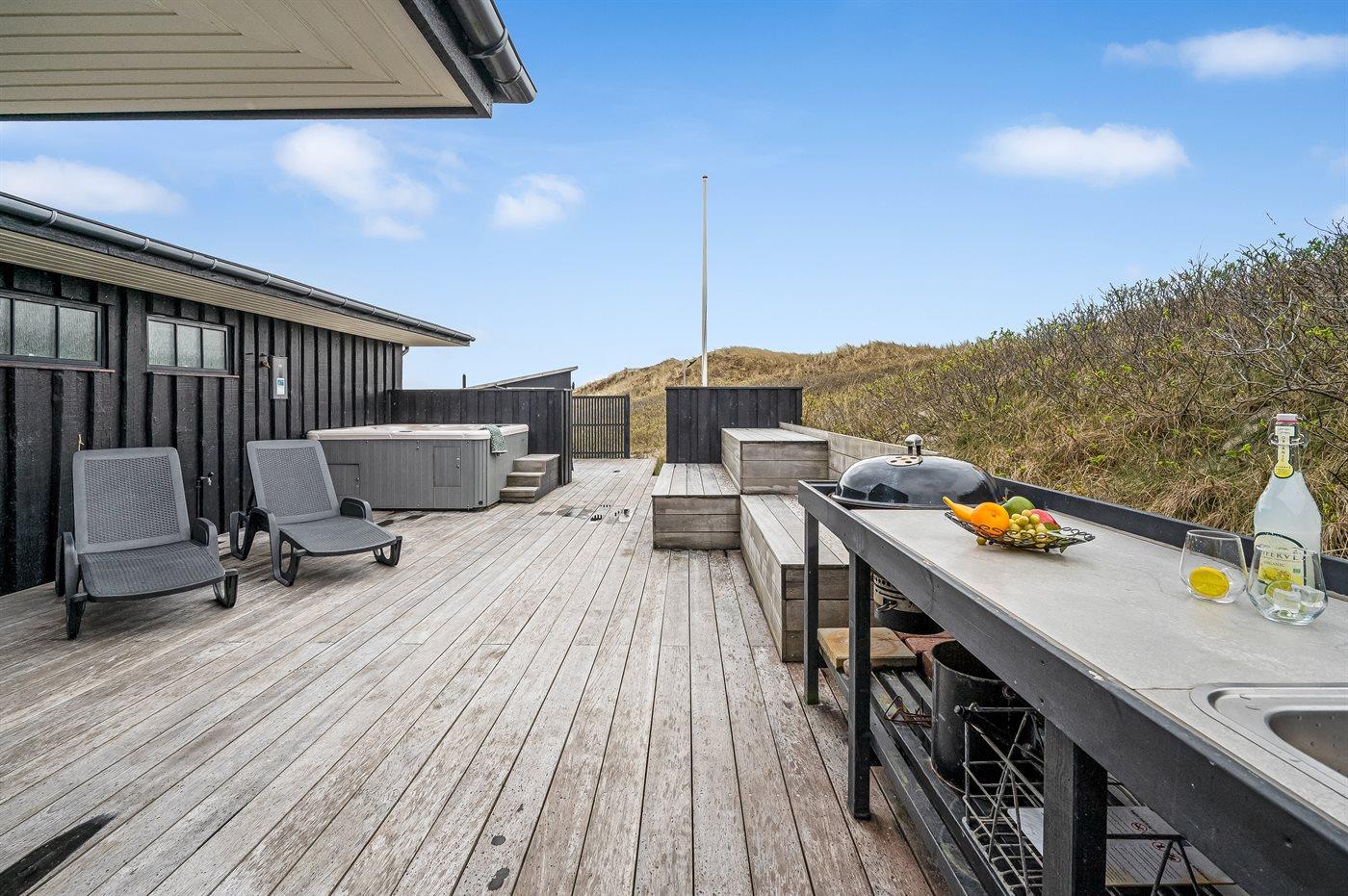 Fra den ugenerede og delvist overdækkede terrasse kan du nyde udsigten over landskabet. Og vil du for alvor skrue op for luksussen, skal du tænde for den udendørs spa. Dækket af det varme vand kan du slappe fuldstændig af, og om aftenen er der frit udsyn til den smukke, klare stjernehimmel. På terrassen finder du også en udendørs bruser, hvor du kan skylle saltvandet af kroppen og sandet af fødderne, når du har taget en dukkert i Vesterhavet. Du kan også vælge at tage dit morgenbad under åben himmel. Udendørsbruseren kan benyttes fra april til november.