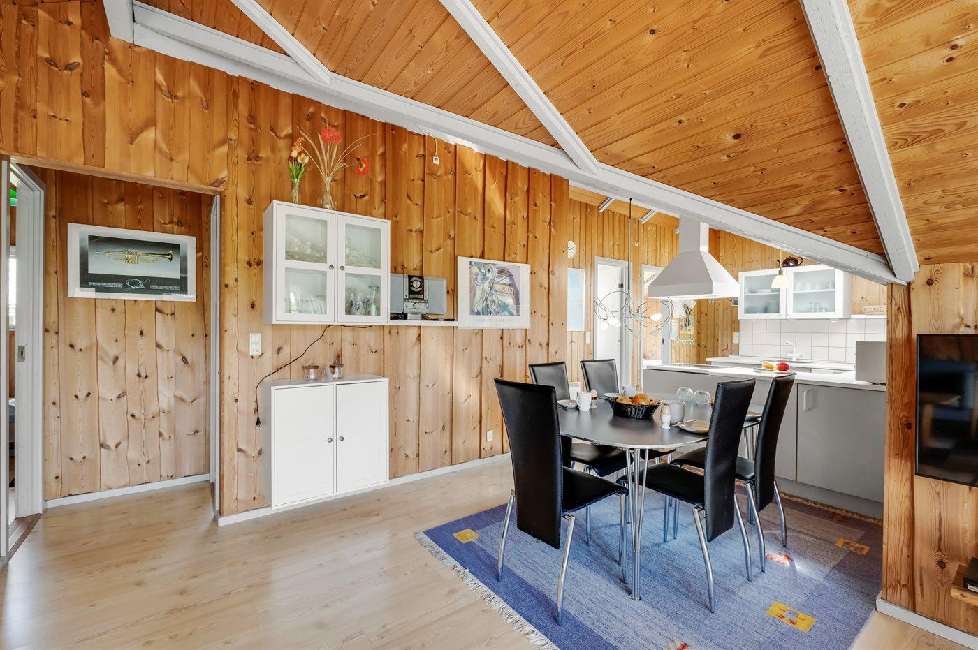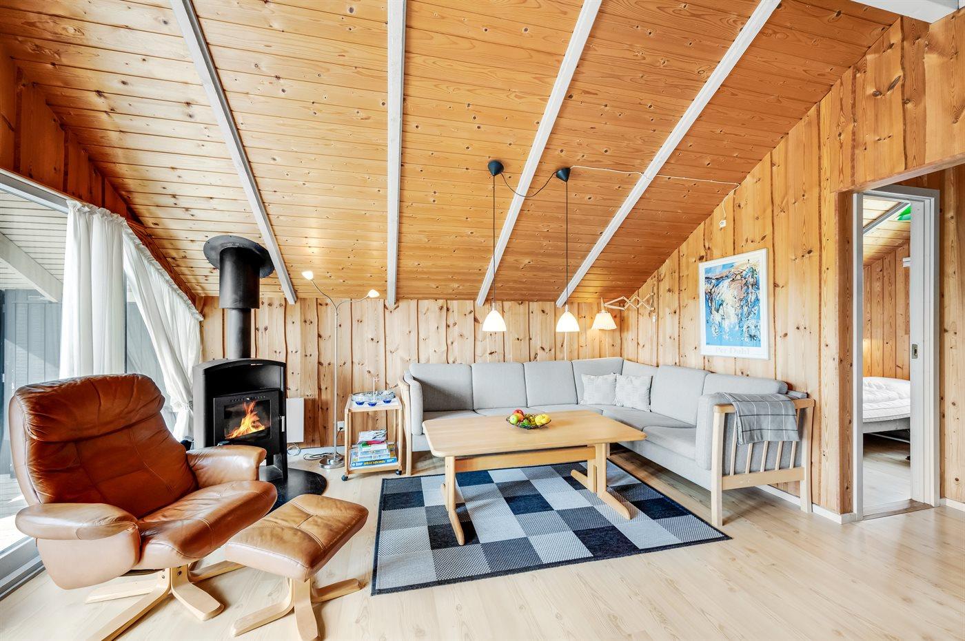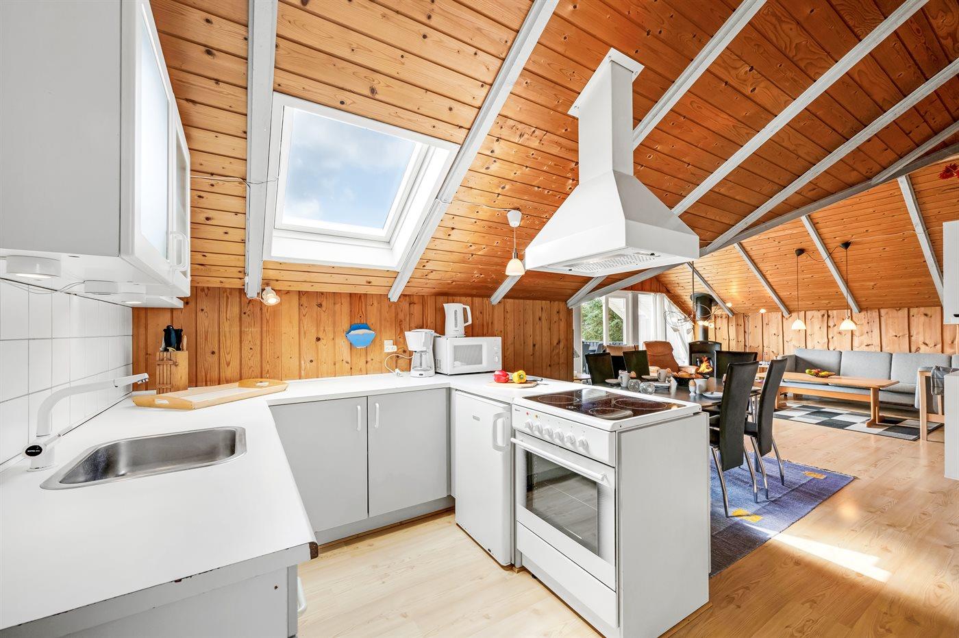 Det lyse og hyggelige køkken-alrum, indrettet i dansk stil, indbyder til hygge, afslapning og samvær. I den store komfortable sofa kan du slænge dig med en god bog samtidig med at du kan høre brændeovnen knitre i baggrunden. Gennem det store vinduesparti har du direkte adgang til den store og delvist overdækkede træterrasse og den smukke klitgrund. Her kan du med udsigt til klitterne slappe af, spille spil eller lege med hunden.