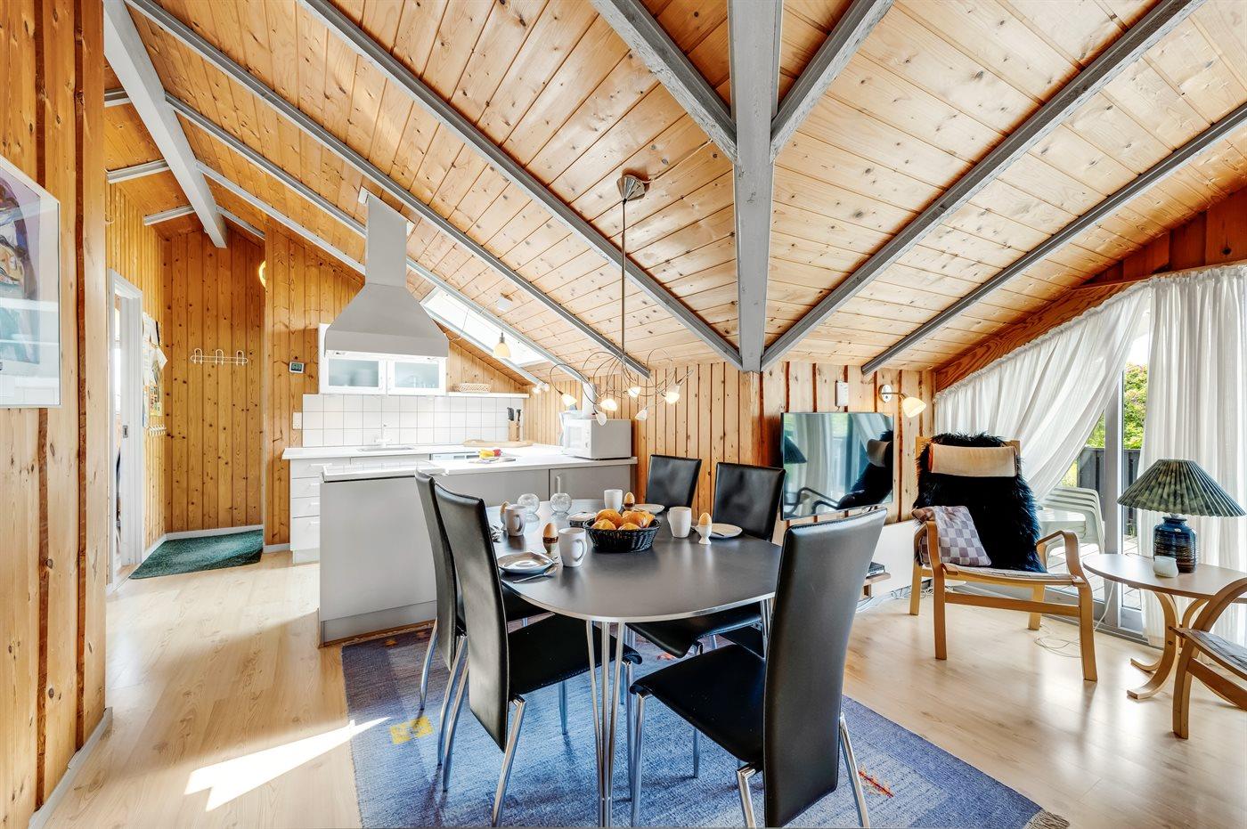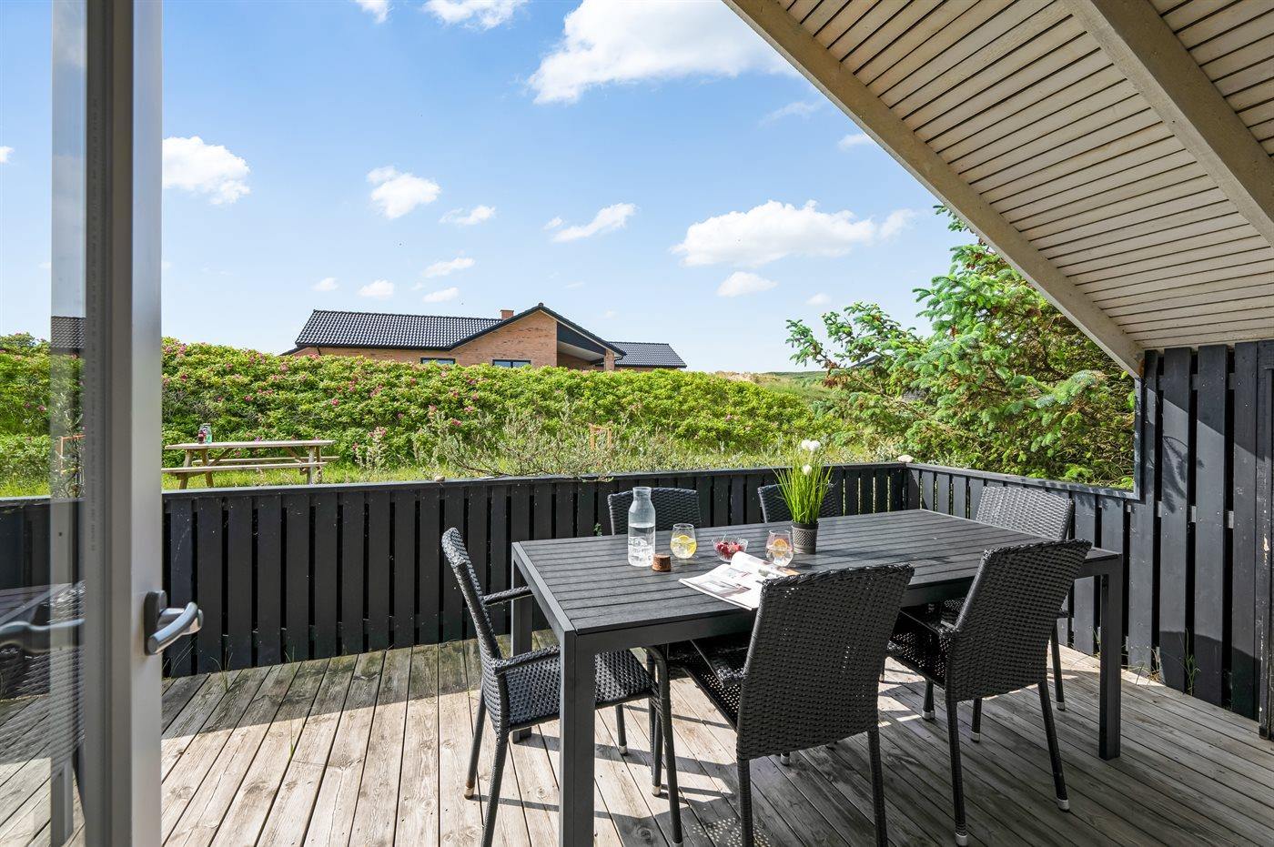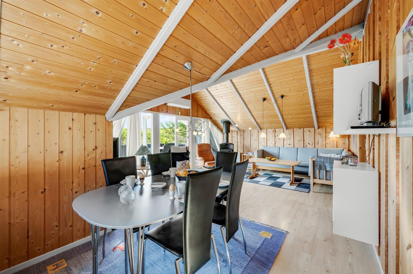 Det lyse og hyggelige køkken-alrum, indrettet i dansk stil, indbyder til hygge, afslapning og samvær. I den store komfortable sofa kan du slænge dig med en god bog samtidig med at du kan høre brændeovnen knitre i baggrunden. Gennem det store vinduesparti har du direkte adgang til den store og delvist overdækkede træterrasse og den smukke klitgrund. Her kan du med udsigt til klitterne slappe af, spille spil eller lege med hunden.