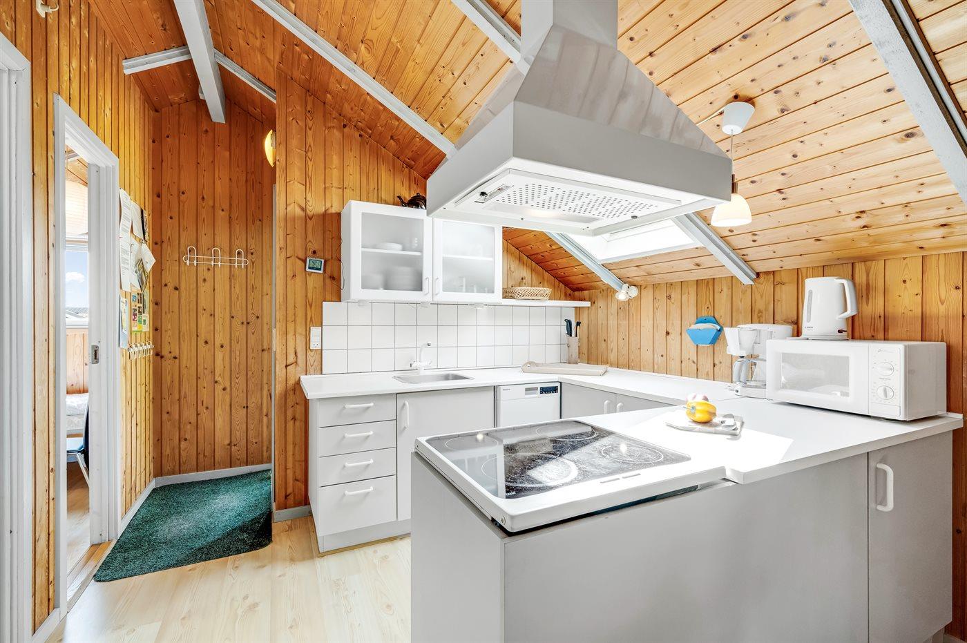 Køkkenet er udstyret med 1 køleskab. Der er 4 keramiske kogeplader, varmluftovn, mikrobølgeovn samt opvaskemaskine.