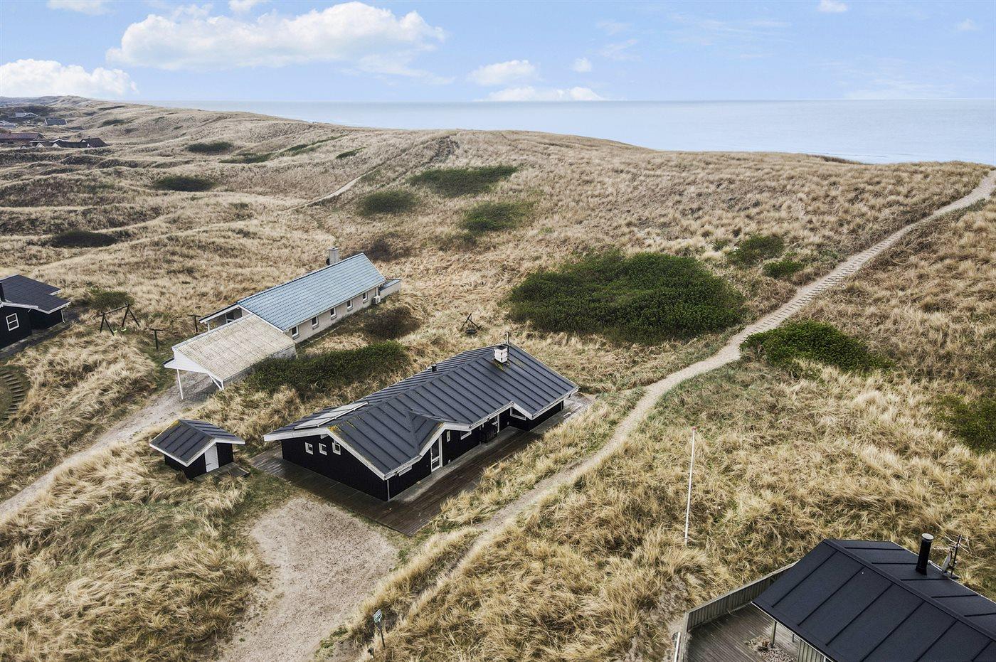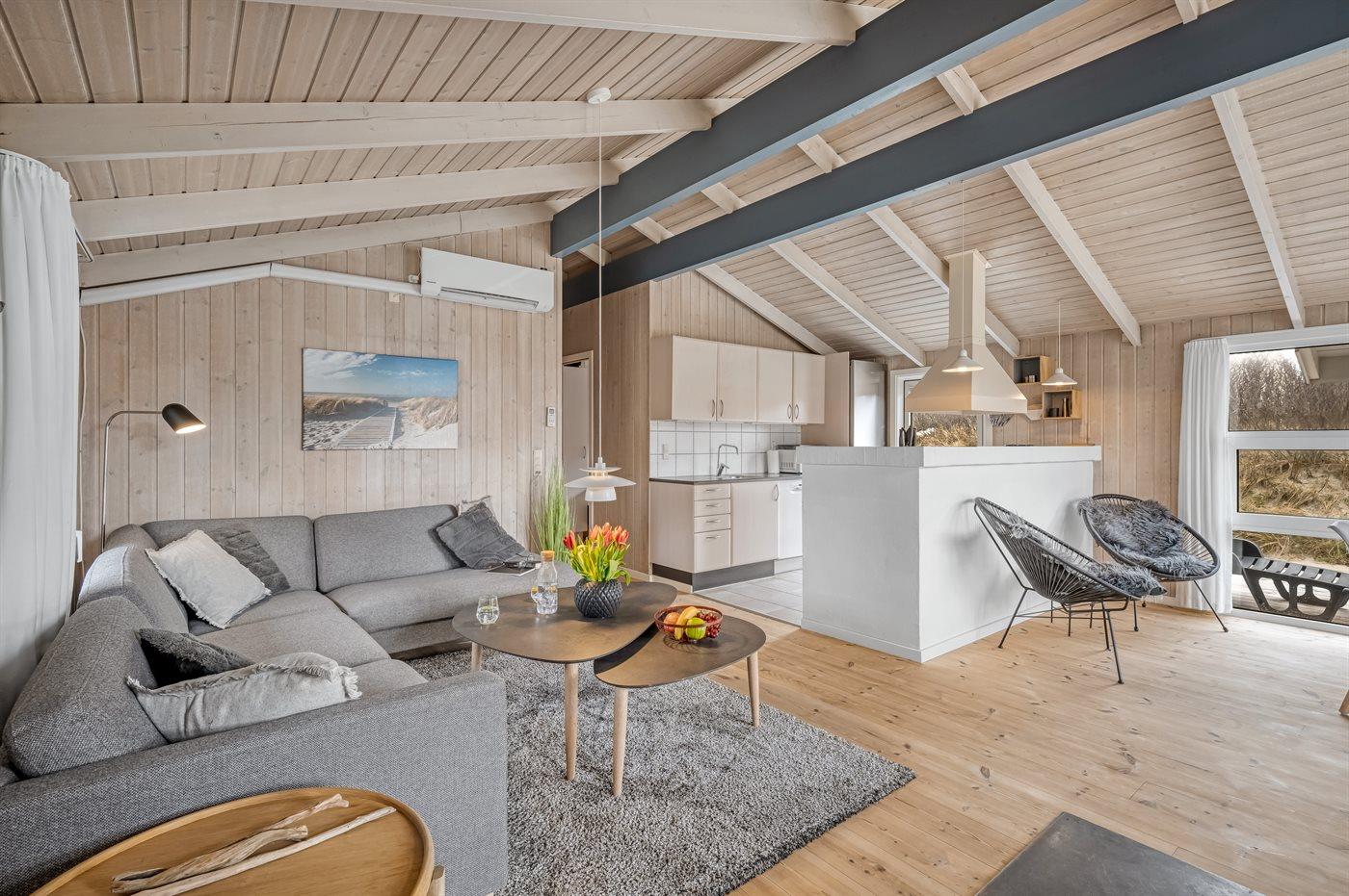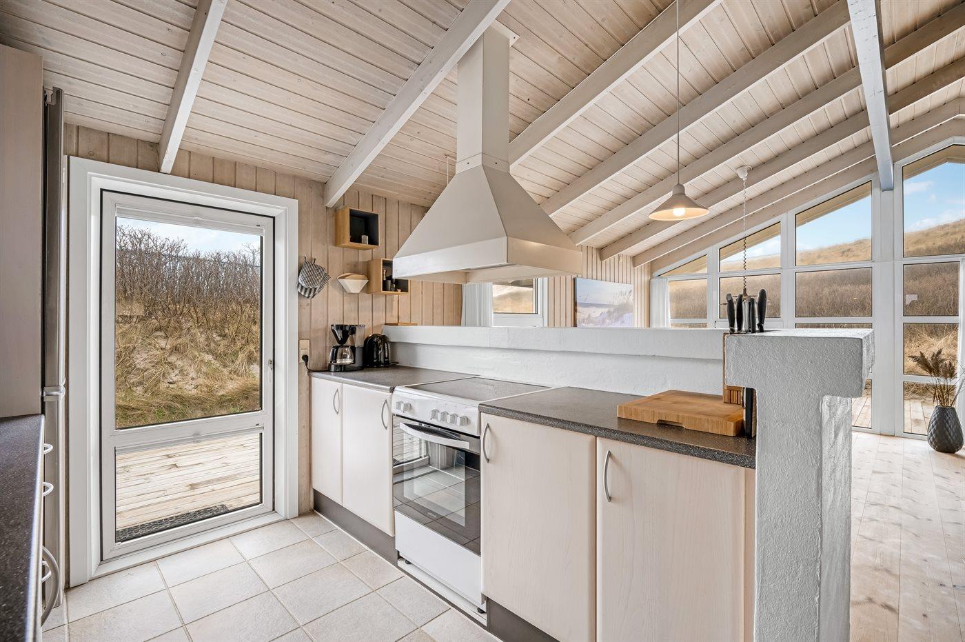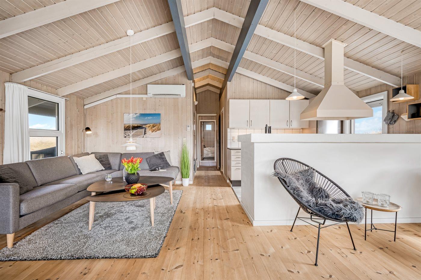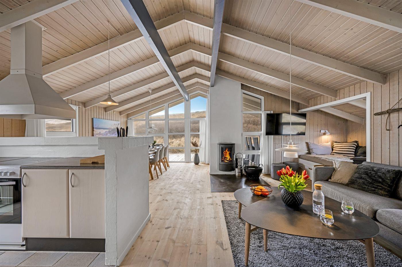 Fra sommerhusets køkkenalrum er der loft til kip og store vinduespartier med en pragtfuld udsigt til klitlandskabet. Selvom du sidder indenfor, føler du, at du stadig er midt i det smukke klitlandskab. I den hyggelige stue kan du sidde i de bløde sofaer, nyde ilden i pejsen eller slænge dig i alkoven med en god bog. Er du mere til udeliv kan du nyde terrasserne hele vejen rundt om huset, og på den overdækkede terrasse mod vest vil du føle dig i et med naturen. Med Vesterhavet på den anden side af klitten kan den smukke danske Vestkyst nydes uanset vind og vejr.