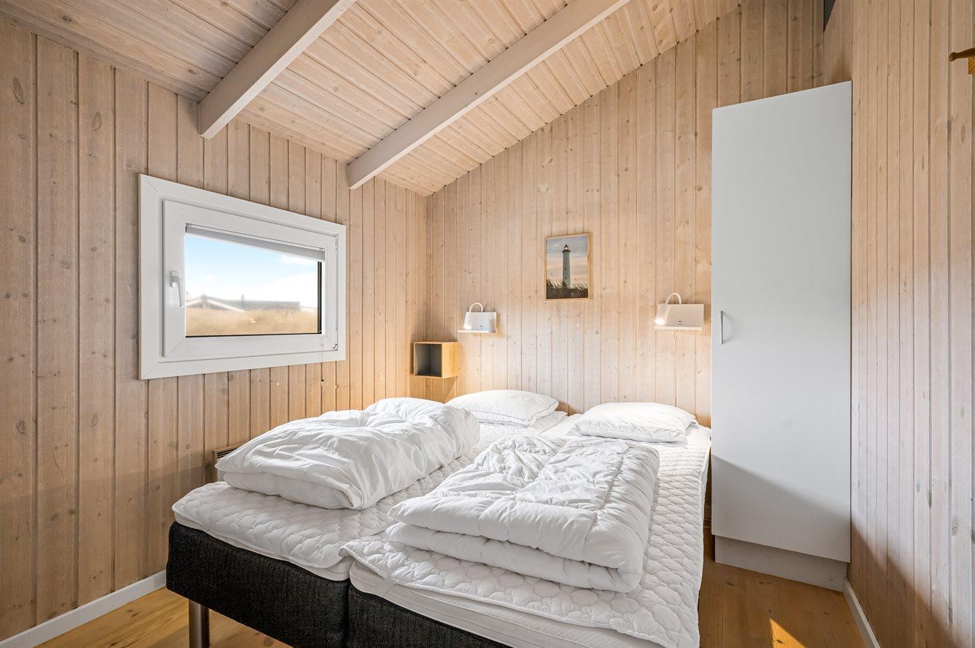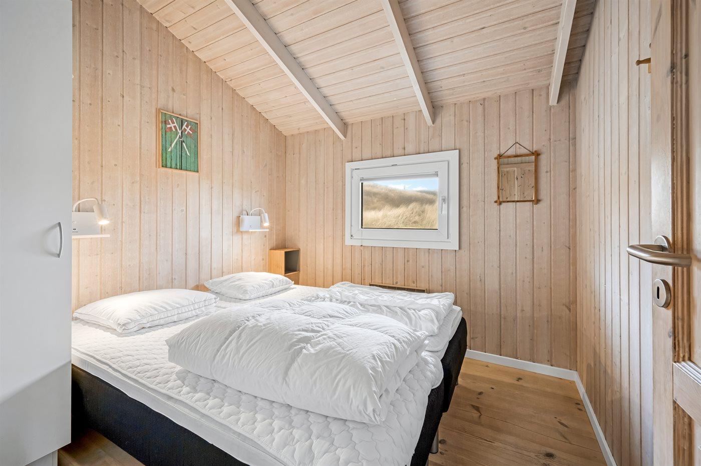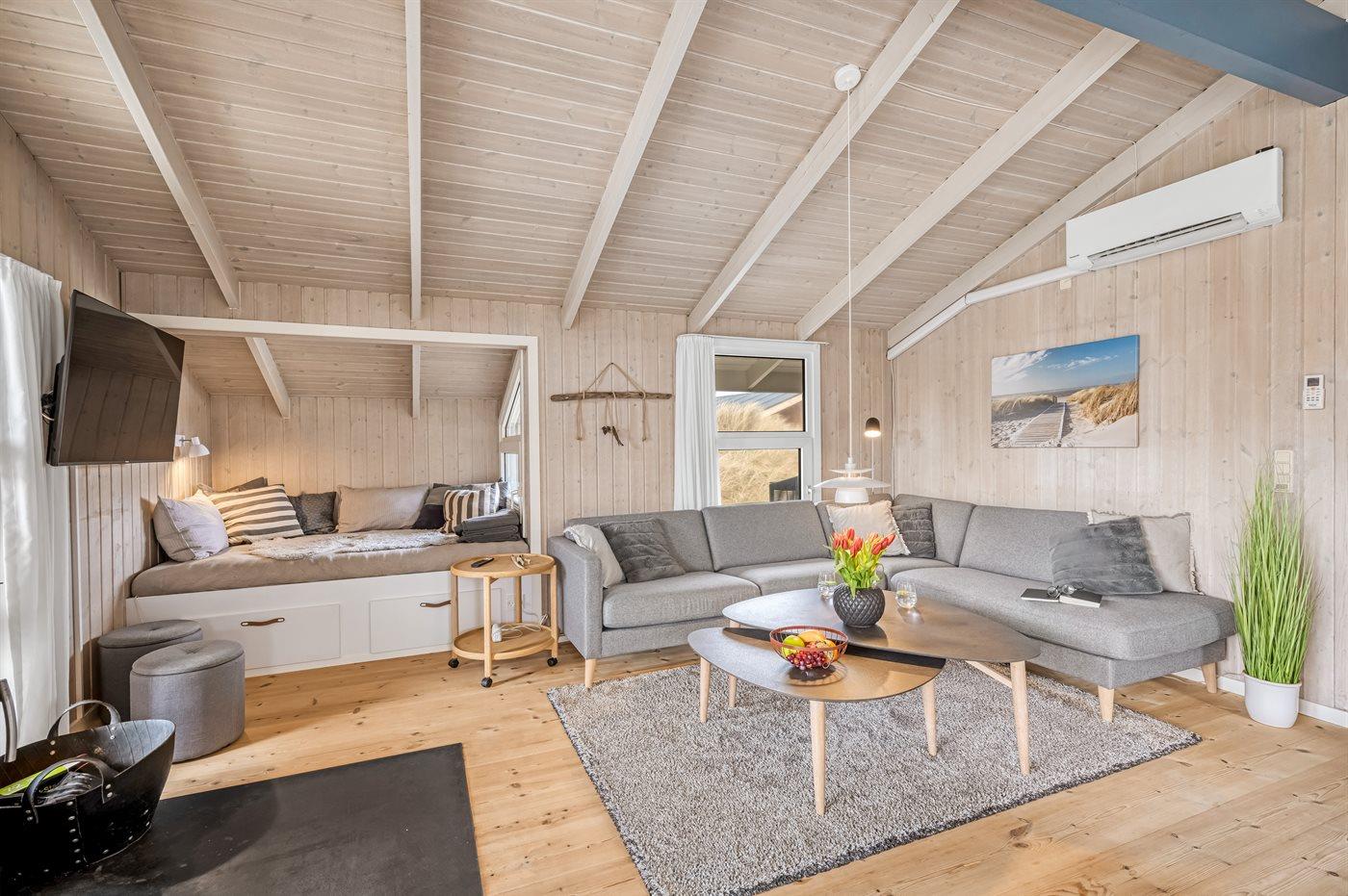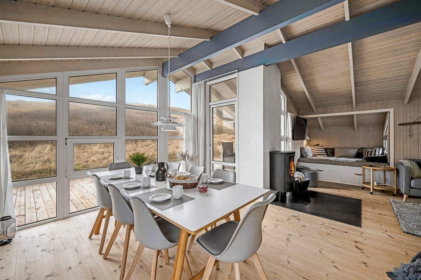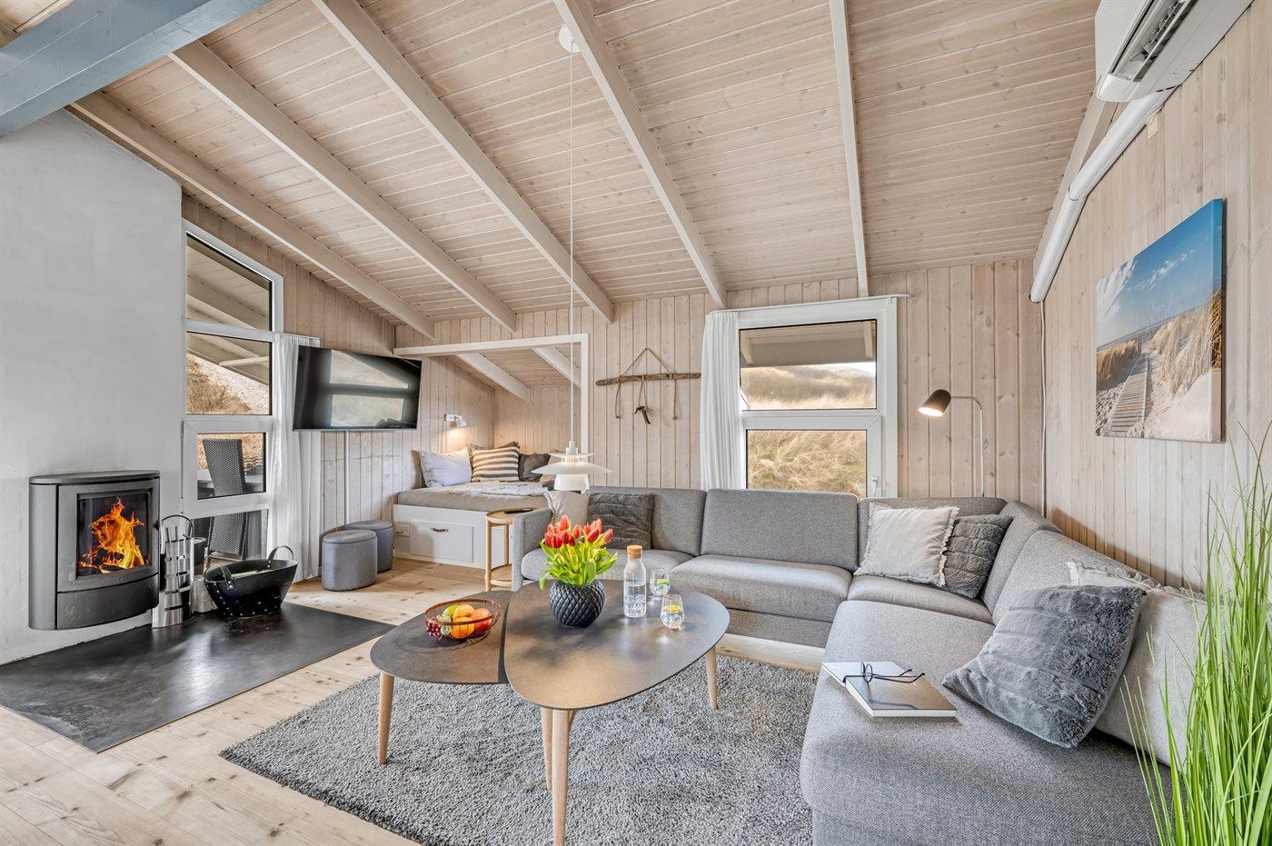 Fra sommerhusets køkkenalrum er der loft til kip og store vinduespartier med en pragtfuld udsigt til klitlandskabet. Selvom du sidder indenfor, føler du, at du stadig er midt i det smukke klitlandskab. I den hyggelige stue kan du sidde i de bløde sofaer, nyde ilden i pejsen eller slænge dig i alkoven med en god bog. Er du mere til udeliv kan du nyde terrasserne hele vejen rundt om huset, og på den overdækkede terrasse mod vest vil du føle dig i et med naturen. Med Vesterhavet på den anden side af klitten kan den smukke danske Vestkyst nydes uanset vind og vejr.