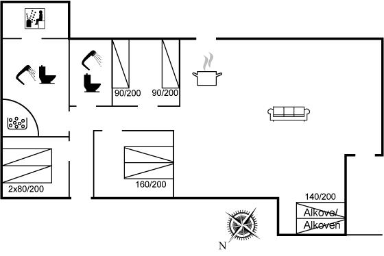 Køkkenet er fuldt udstyret med køleskab (frys 40 l), 4 keramiske kogeplader, ovn og mikrobølgeovn samt opvaskemaskine. Der er 3 soveværelser, 2 med dobbeltsenge og 1 med enkeltsenge. I sommerhuset er der 2 toiletter. Det ene er med spa, sauna og bruser og det andet med bruser. I bryggerset er der både vaskemaskine og tørretumbler.
