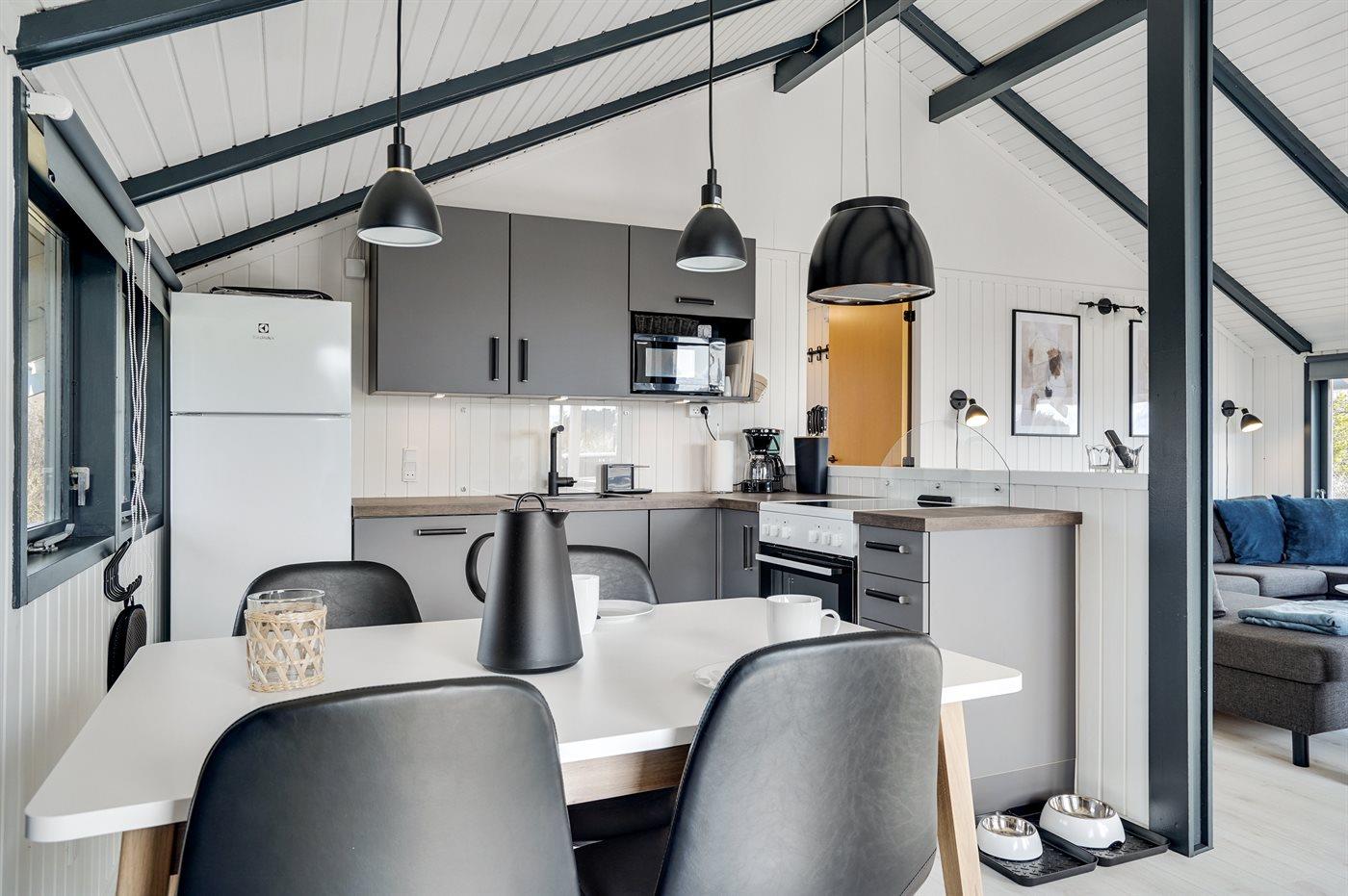 Huset er 61 m2 og er bygget i 1985. Køkkenet er udstyret med køleskab med 40 l frysekapacitet, keramisk kogeplade med varmluft ovn, mikroovn, samt opvaskemaskine. Lækkert badeværelse med bruseniche, toilet og gulvvarme. Huset opvarmes med varmepumpe og brændeovn, der forefindes også 3 varmepaneler.
