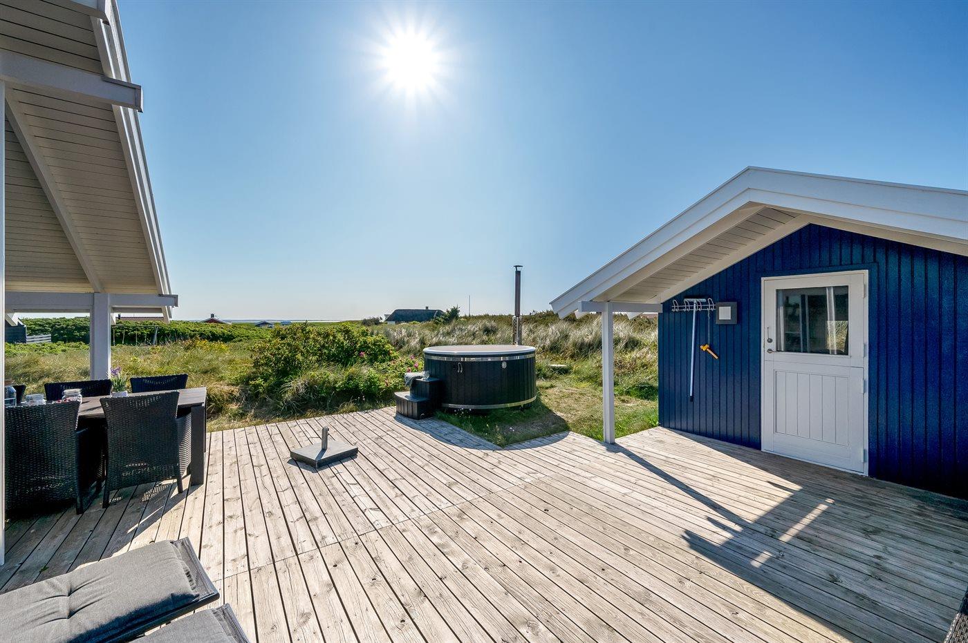 Til huset hører også et udendørs vildmarkskar til 4 pers og en udendørs bruser. 10 m2 overdækket terrasse, grill, og forskellige udendørs aktiviteter som f.eks. bolde, badmintonsæt, stangtennis, stigegolf og drager.