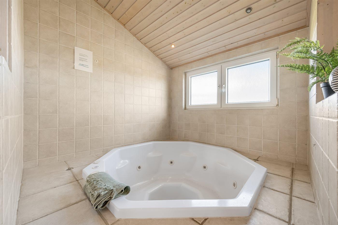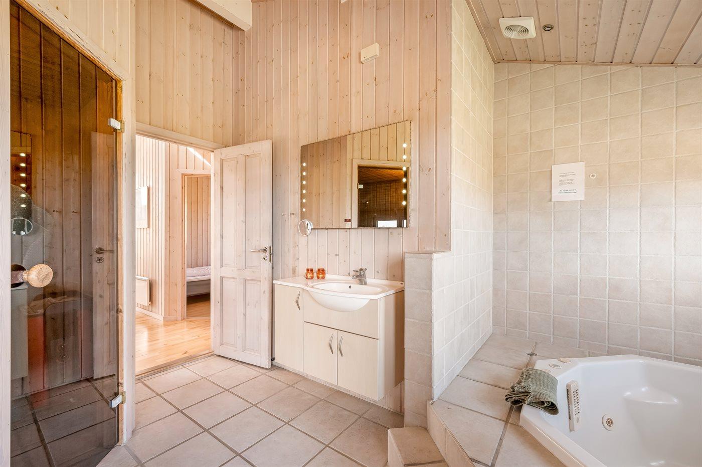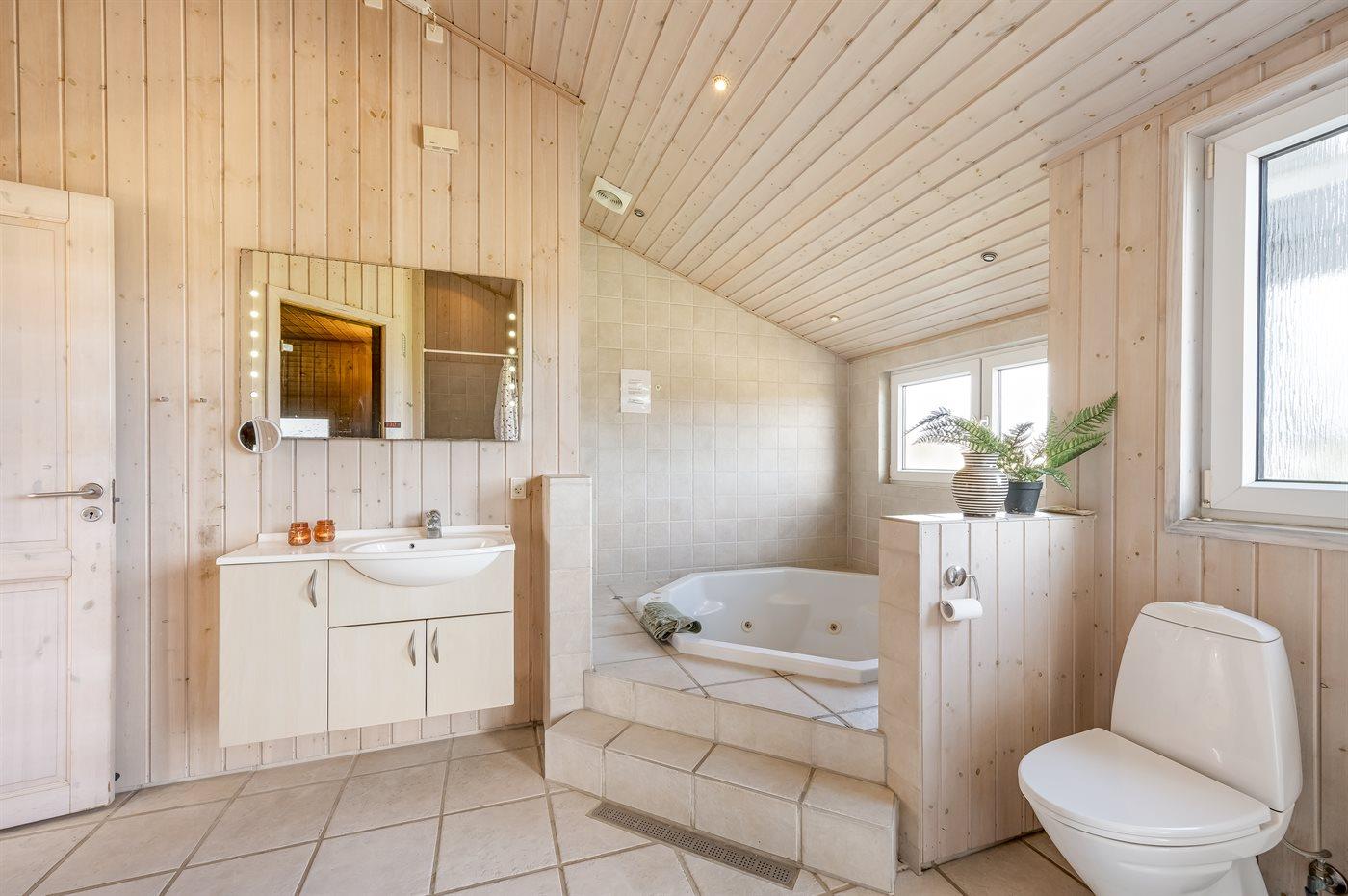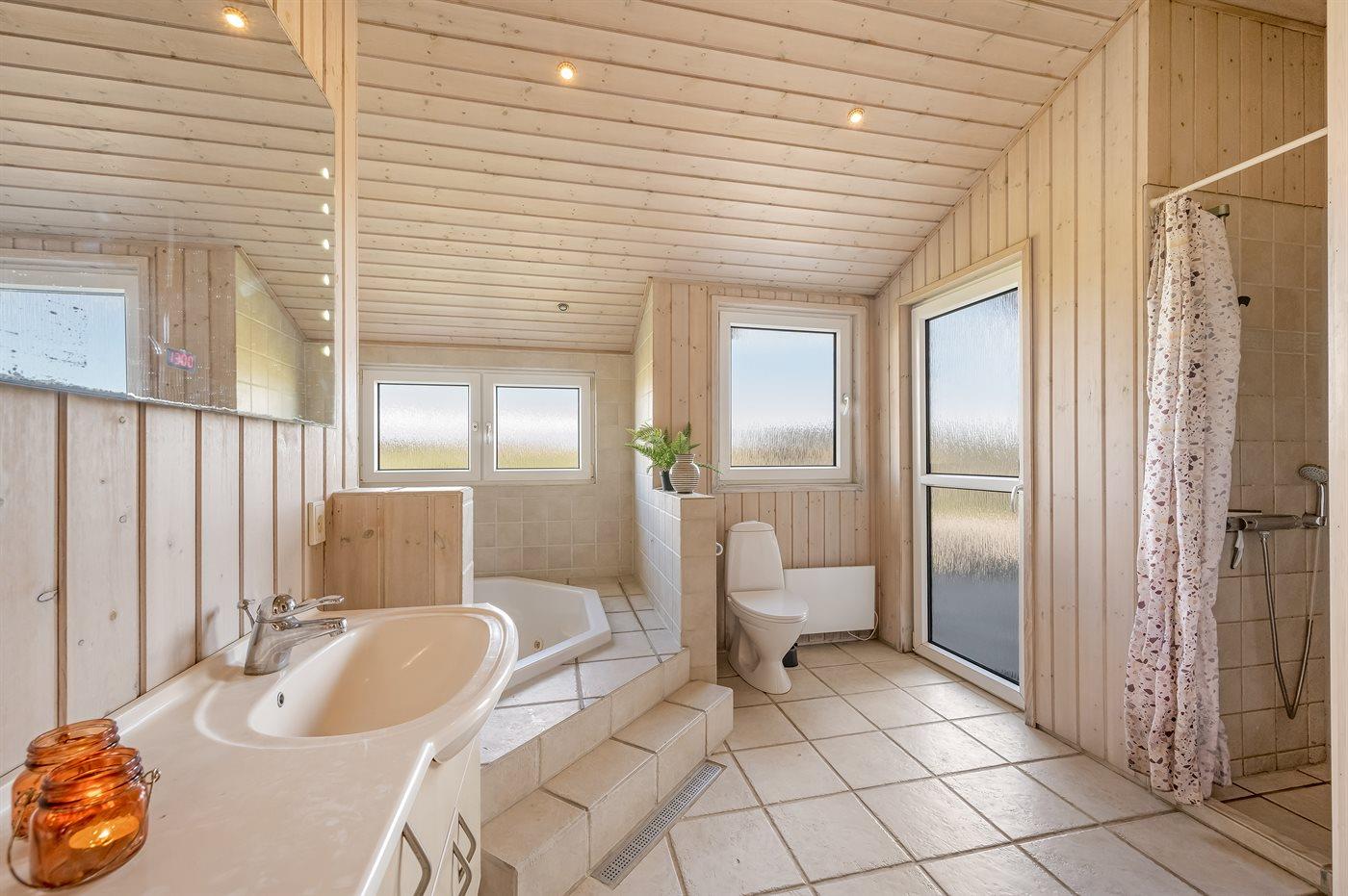 Sommerhuset er udstyret med to badeværelser, hvor du i det ene finder et stort spabad samt sauna. Fra dette badeværelse er der desuden direkte adgang til terrassen. Hører du til den mere friske del af befolkningen, er det en fantastisk oplevelse at ta’ en dukkert i Vesterhavet efterfulgt at en velfortjent tur i saunaen – uanset årstiden! Tilhører du den anden del af befolkningen, så kan du skrue op for luksus og velvære, når du lader dig omslutte af spaens varme vand.