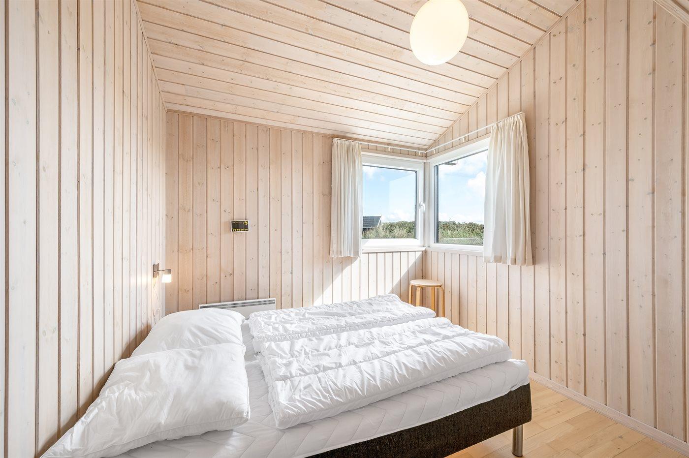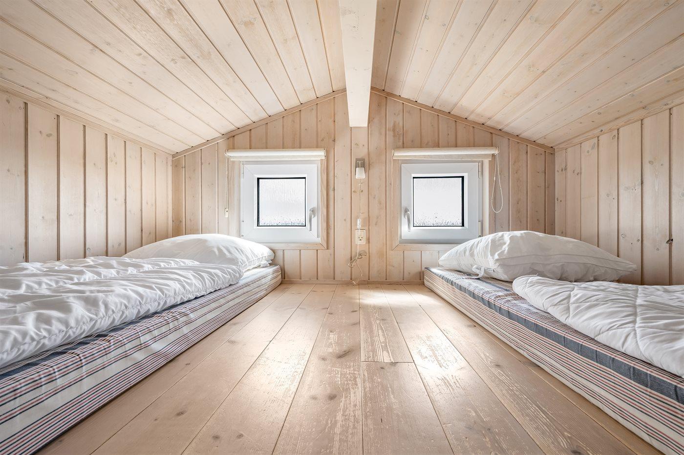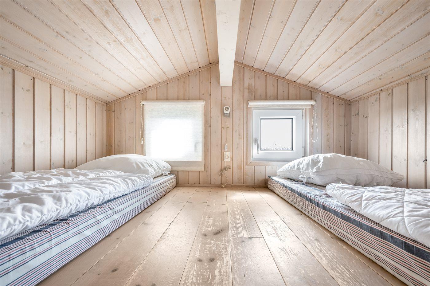 Der er i alt 4 soveværelser. Sovepladserne fordeler sig på: 4 sovepladser i dobbeltsenge. 4 sovepladser i enkeltsenge. 2 sovepladser på madrasser. 2 af disse sovepladser befinder sig på husets hems. Derudover er der 1 stk. barneseng.