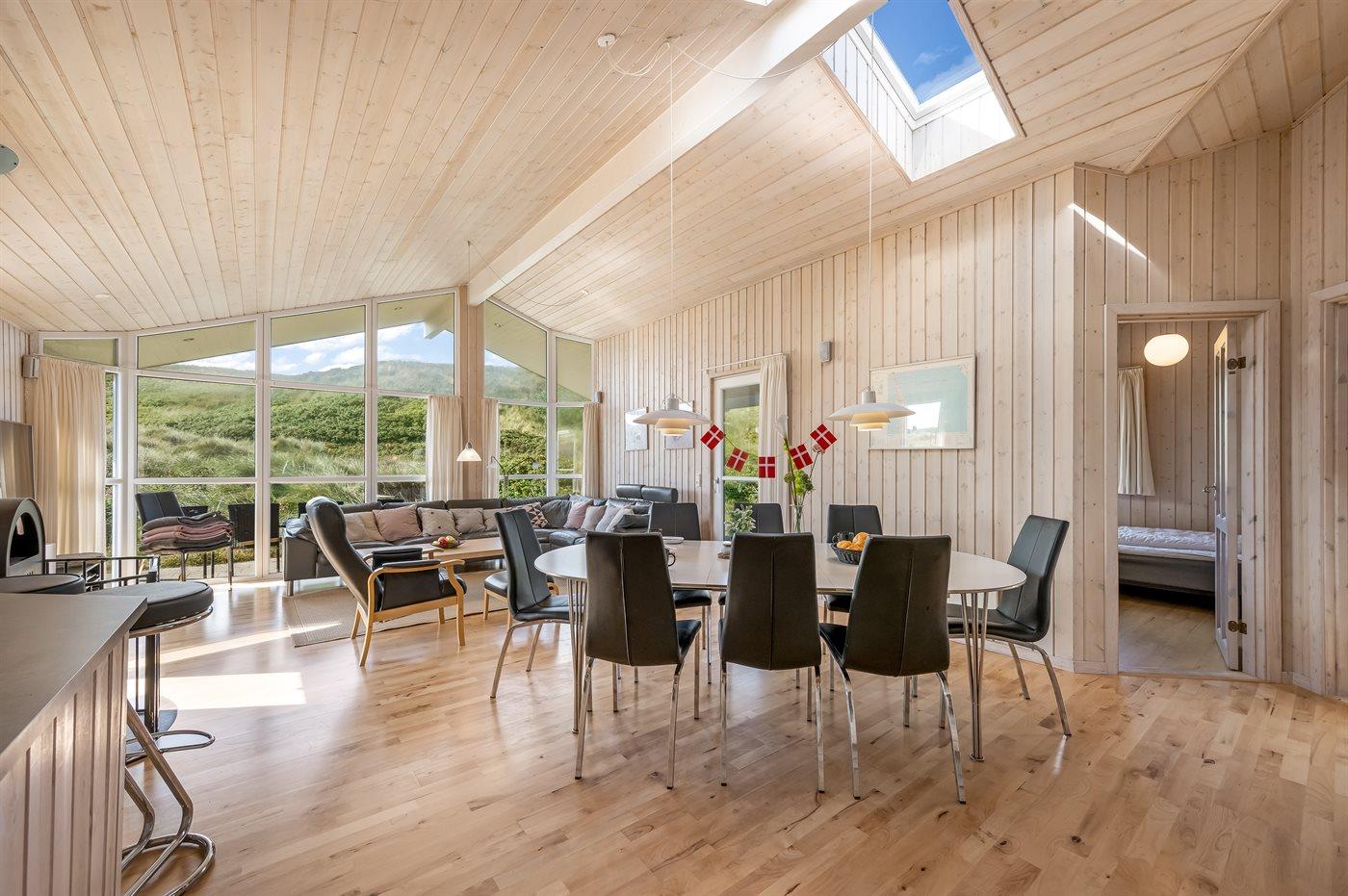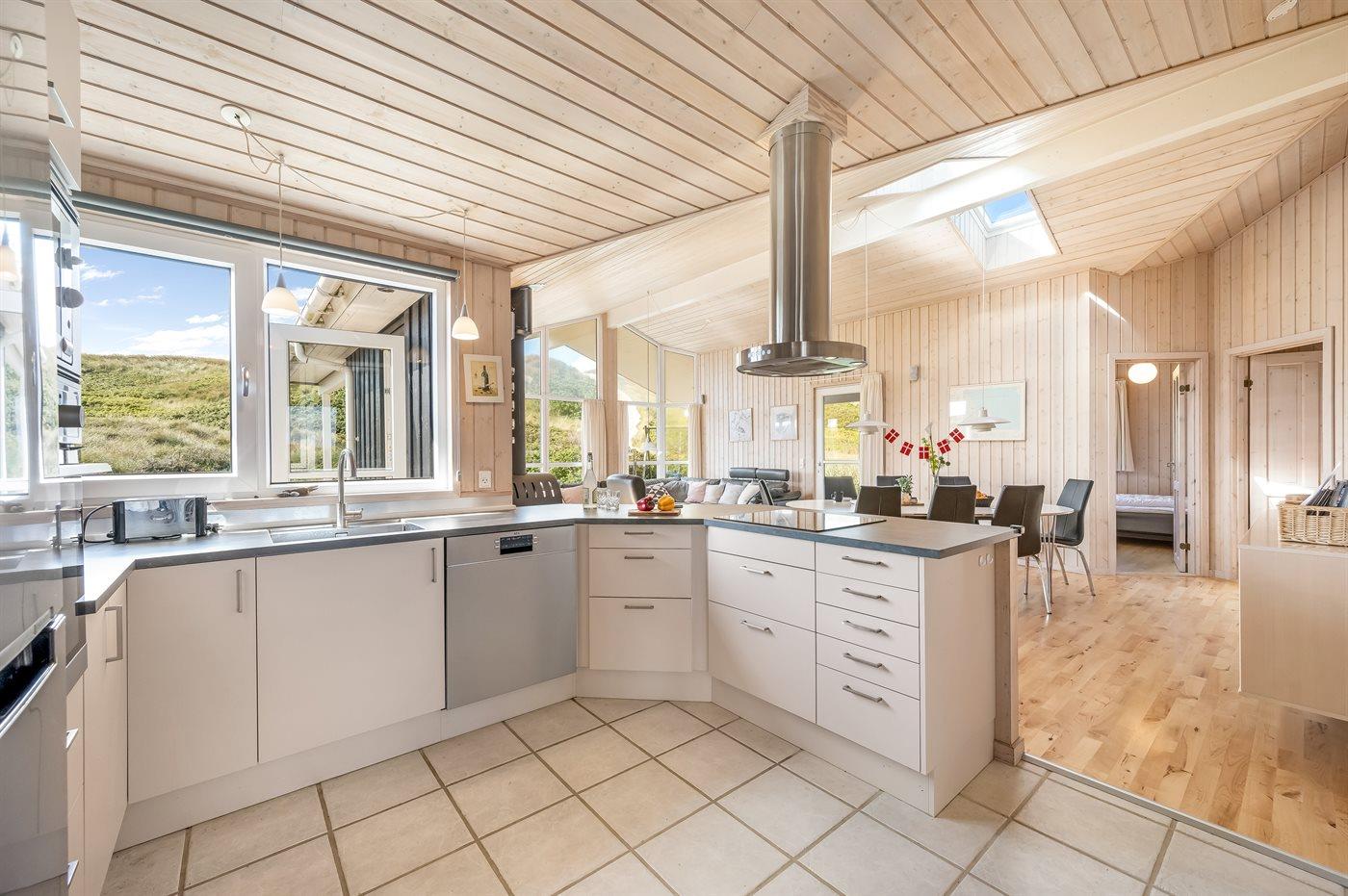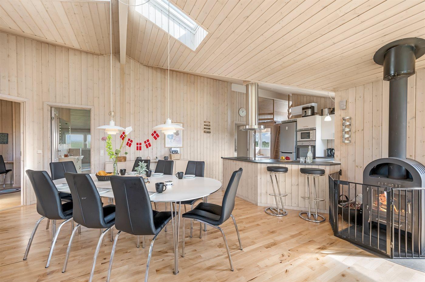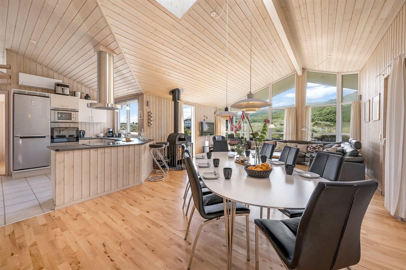 Det rummelige køkken-alrum med de store vinduespartier er sommerhusets absolutte omdrejningspunkt. Her kan du slænge dig i de store sofaer og bare slappe af og nyde den smukke udsigt, eller du kan læse en god bog med brændeovnens knitren som baggrundsmusik. I det nye (2025) og velindrettede køkken er der plads til, at flere kan hjælpes ad og hygge sig sammen om madlavningen mens samtalen handler om løst og fast.
