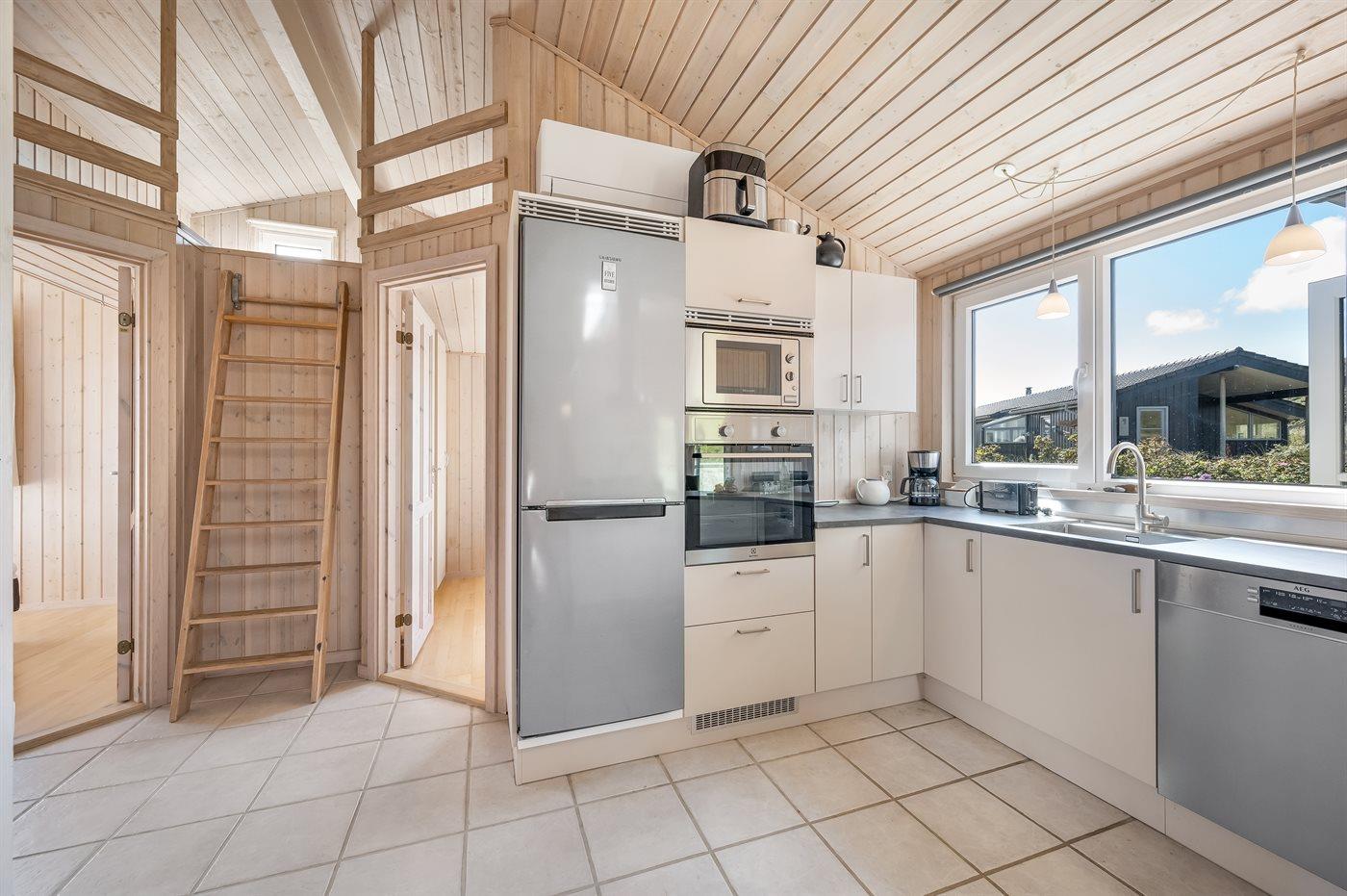 Køkkenet er udstyret med 1 køleskab. Der er 4 keramiske kogeplader, varmluftovn, mikrobølgeovn samt opvaskemaskine.