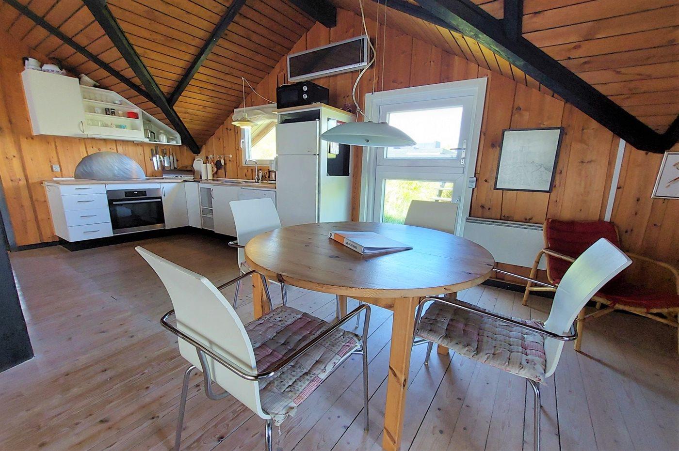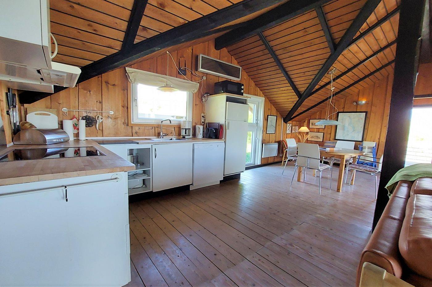 Køkkenet er udstyret med 1 køleskab. Der er 4 keramiske kogeplader, varmluftovn, mikrobølgeovn samt opvaskemaskine.