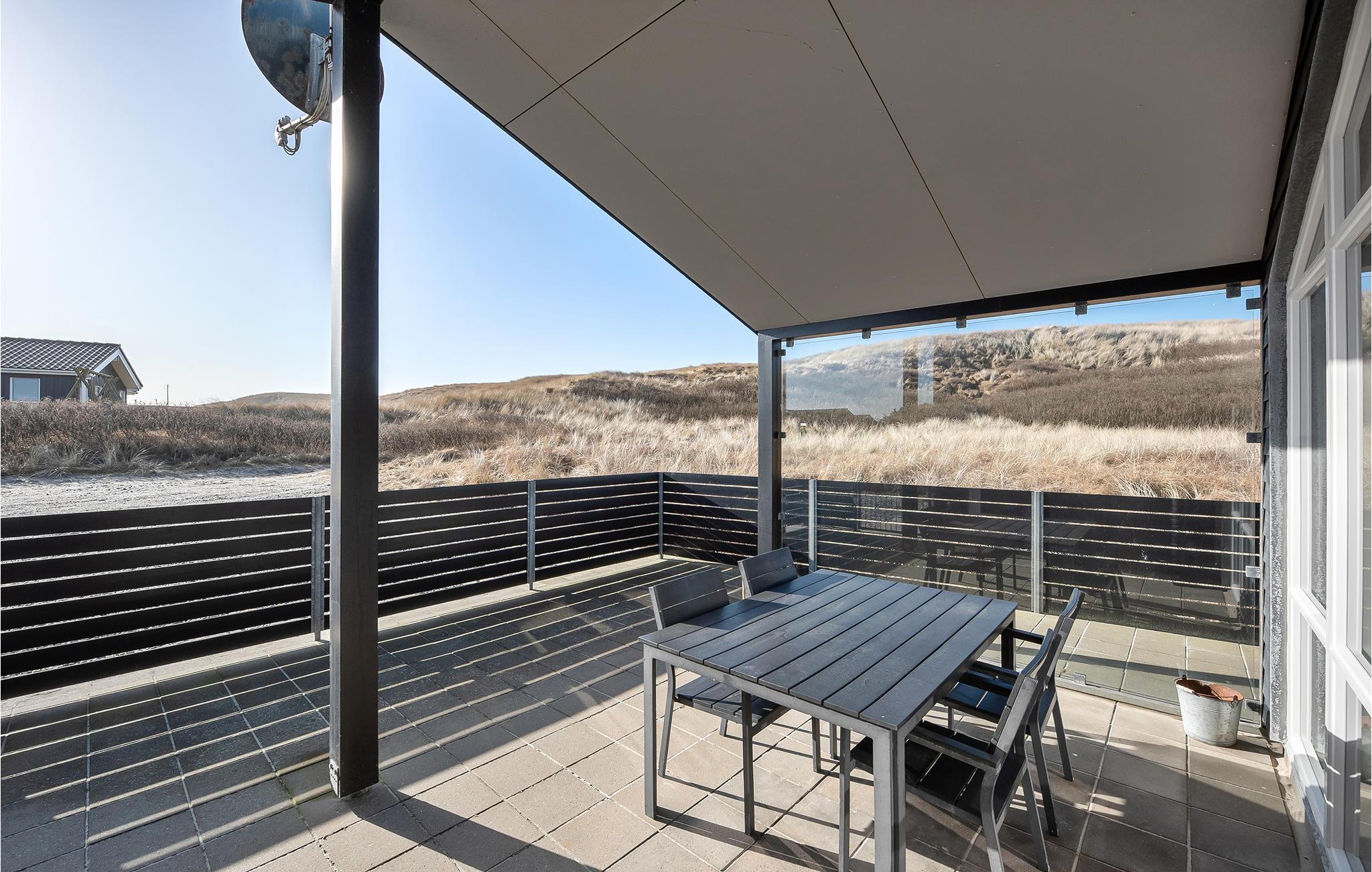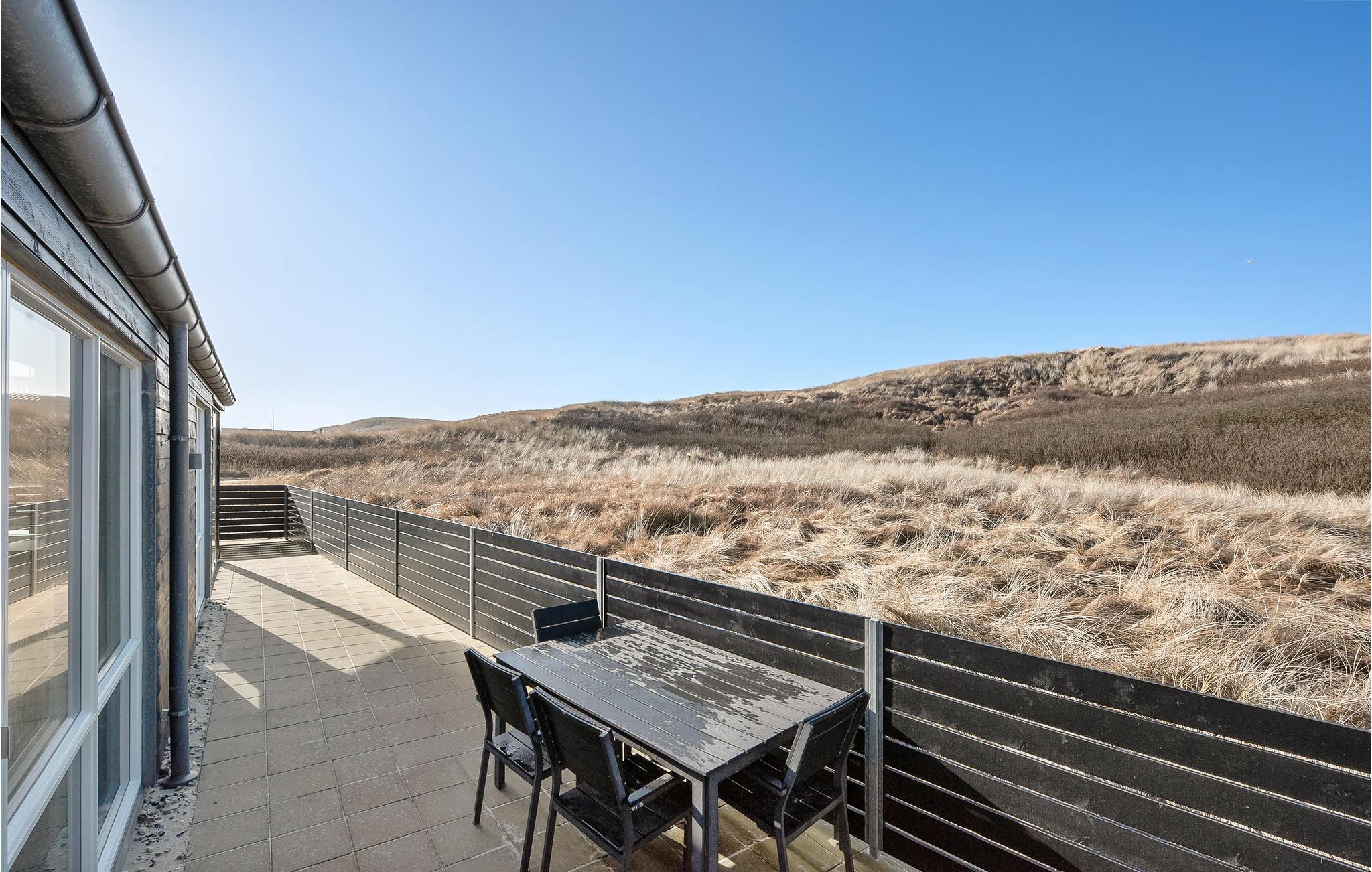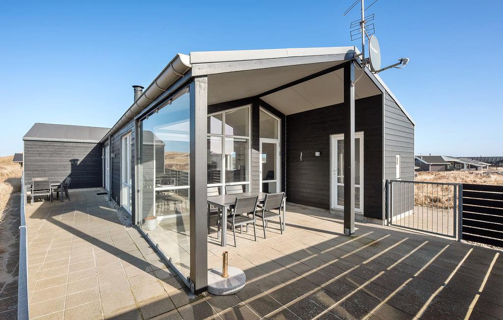Slap af udenfor på den sydvendte og delvist overdækkede terrasse, hvopr der er liggestole og et glasparti, hvilket gør det muligt at bruge terrassen allerede fra forårsmånederne. Sid i læ og nyd udsigten over klitterne eller afslut dagen med en grillmiddag. Terrassen er aflukket, hvilket gør det trygt at have hund og små børn udendørs.