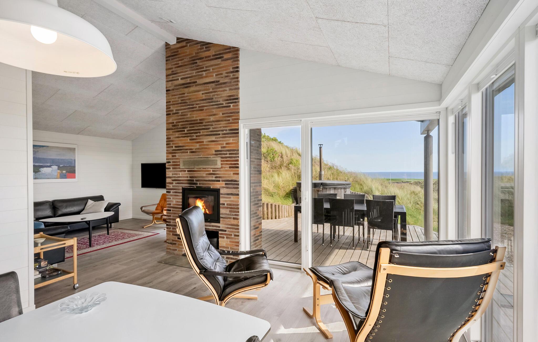 Nyd ferien i jeres feriehus, som takket være sin førsteklasses beliggenhed blandt klitterne giver jer uhindret udsigt helt ned til Vesterhavet. Huset kombinerer moderne bekvemmeligheder med en hyggelig atmosfære, der sørger det bedste betingelser for afslapning og hyggelige aktiviteter. Find jer til rette i den rummelige opholdsstue med brændeovn og store vinduer. Lad blikket vandre over landskabet, slap af i de komfortable sofaer eller læs en bog i en af ??lænestolene med udsigt. Den åbne spiseplads med masser af naturligt lys og udsigt over naturen er det optimale sted til fælles måltider. Tilbered lækre retter med havudsigt i det moderne, åbne køkken. Aktivitetsrummet med billardbord sørger for underholdning, mens saunaen lægger op til at slappe af.